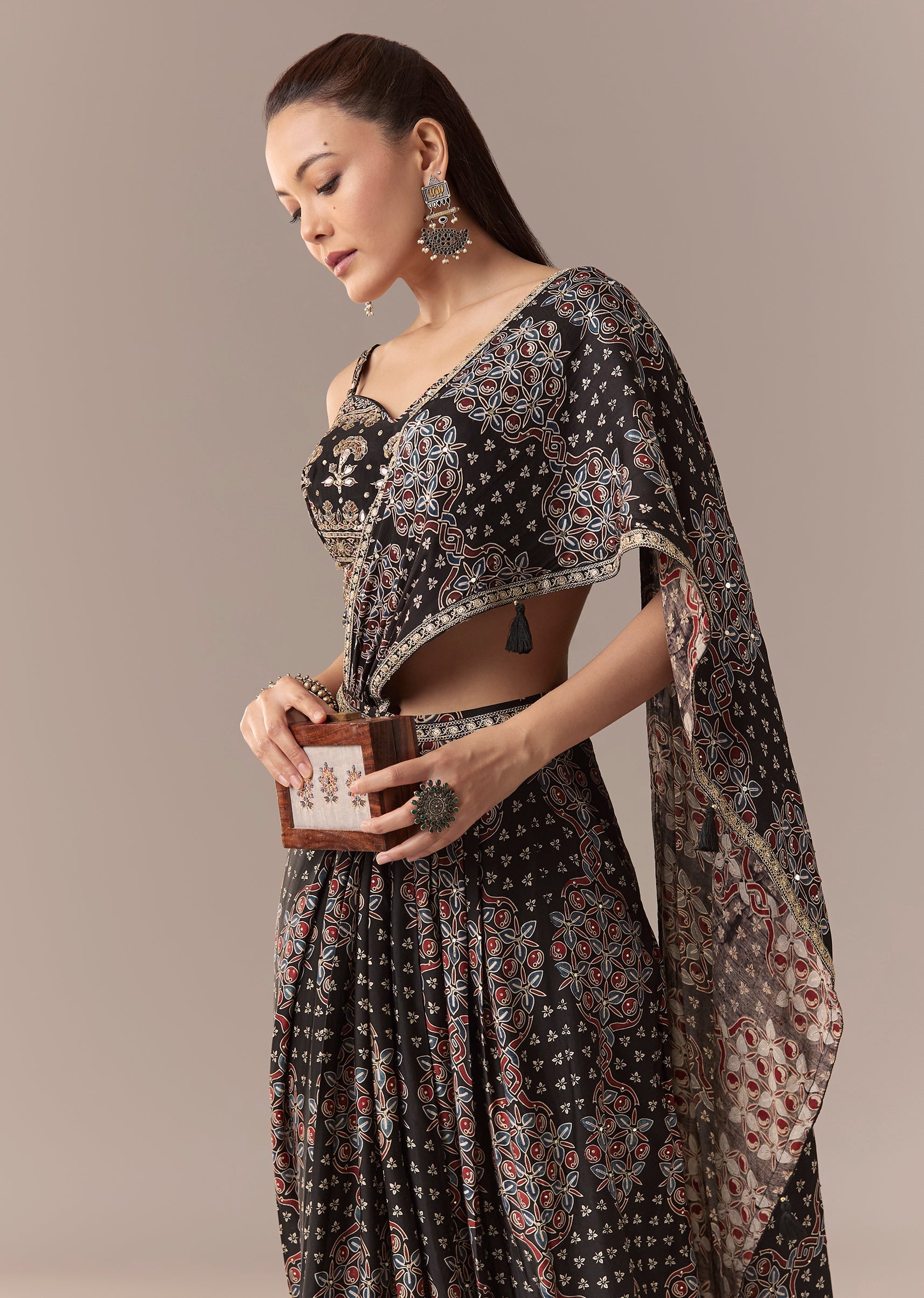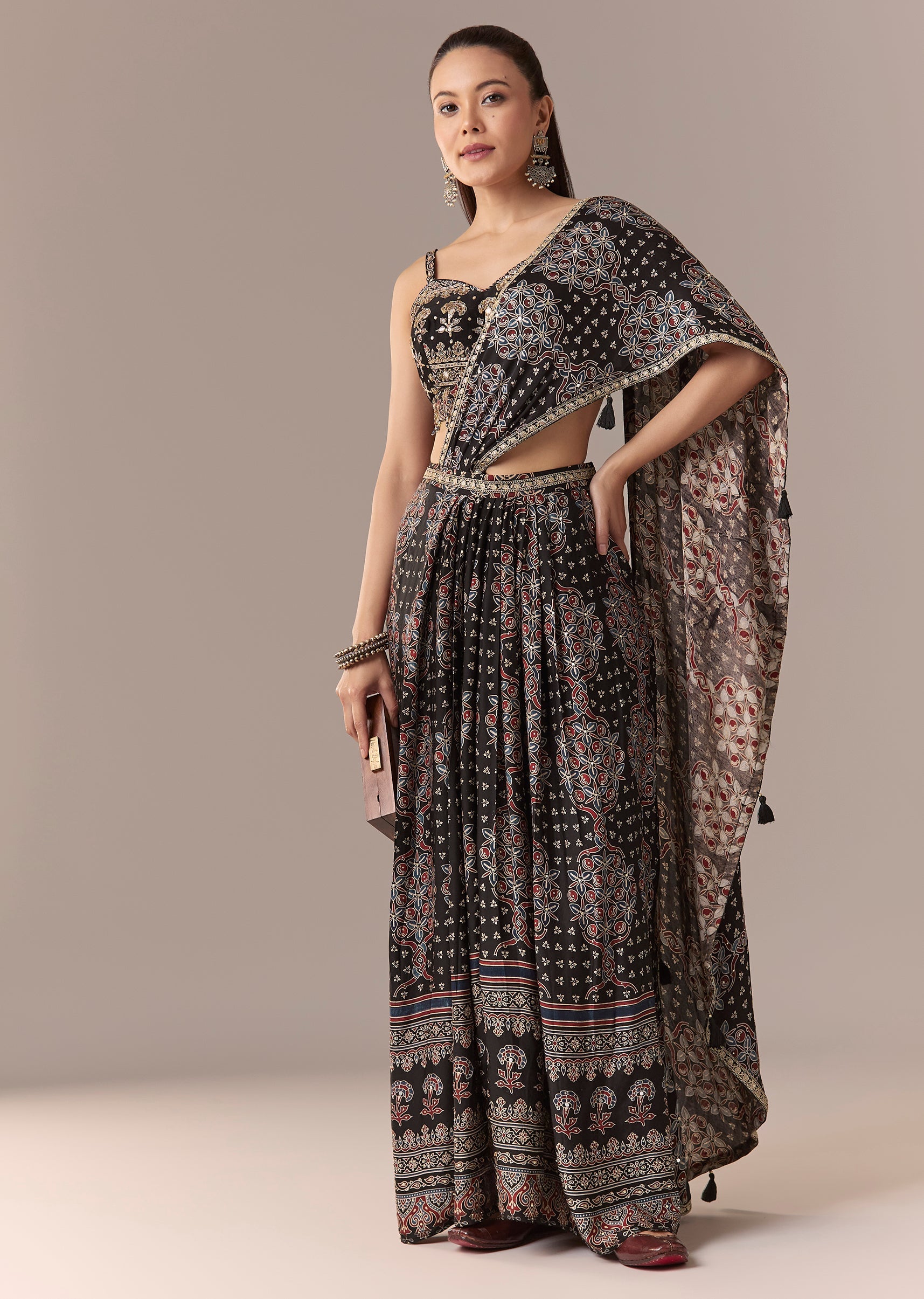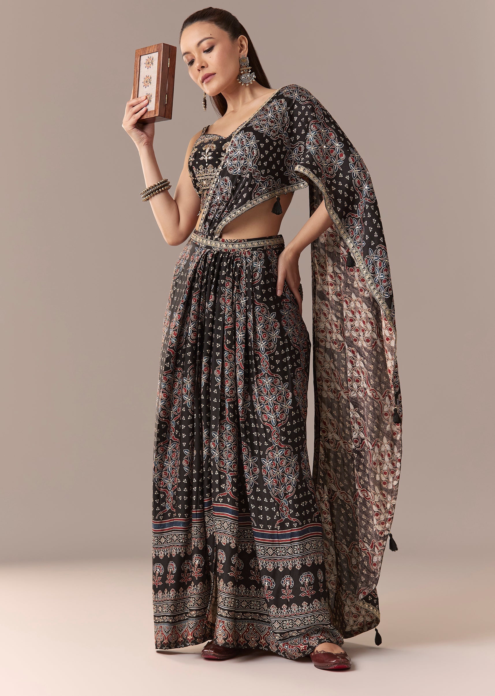 Black Ajrakh Pre Draped Saree Set With Mirror Work Blouse