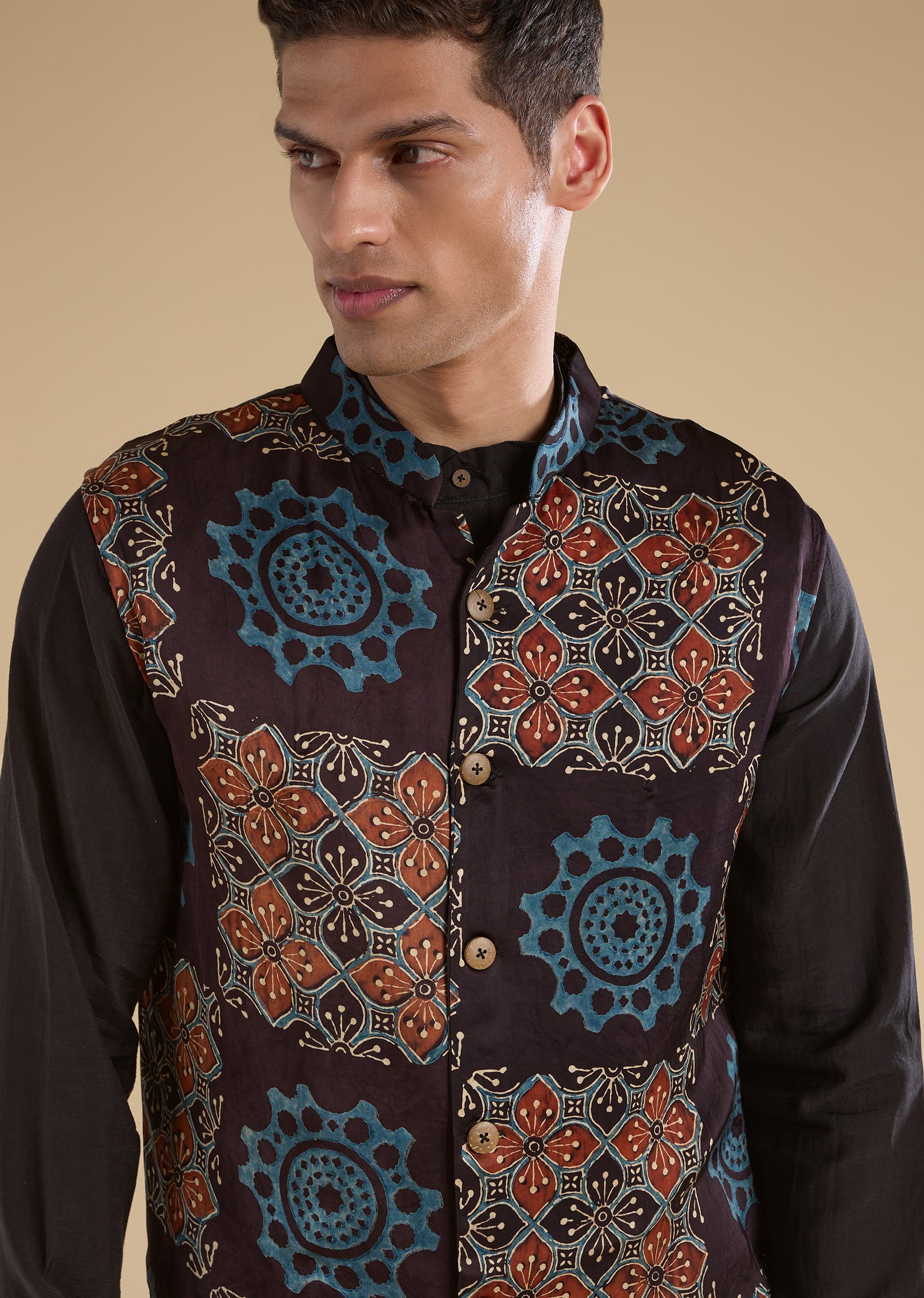 Rooted in tradition with a contemporary sensibility, this black kurta jacket set features a pure handblock Ajrakh bandi paired with a linen-blend kurta for breathable comfort. Designed with a mandarin... More Product Details