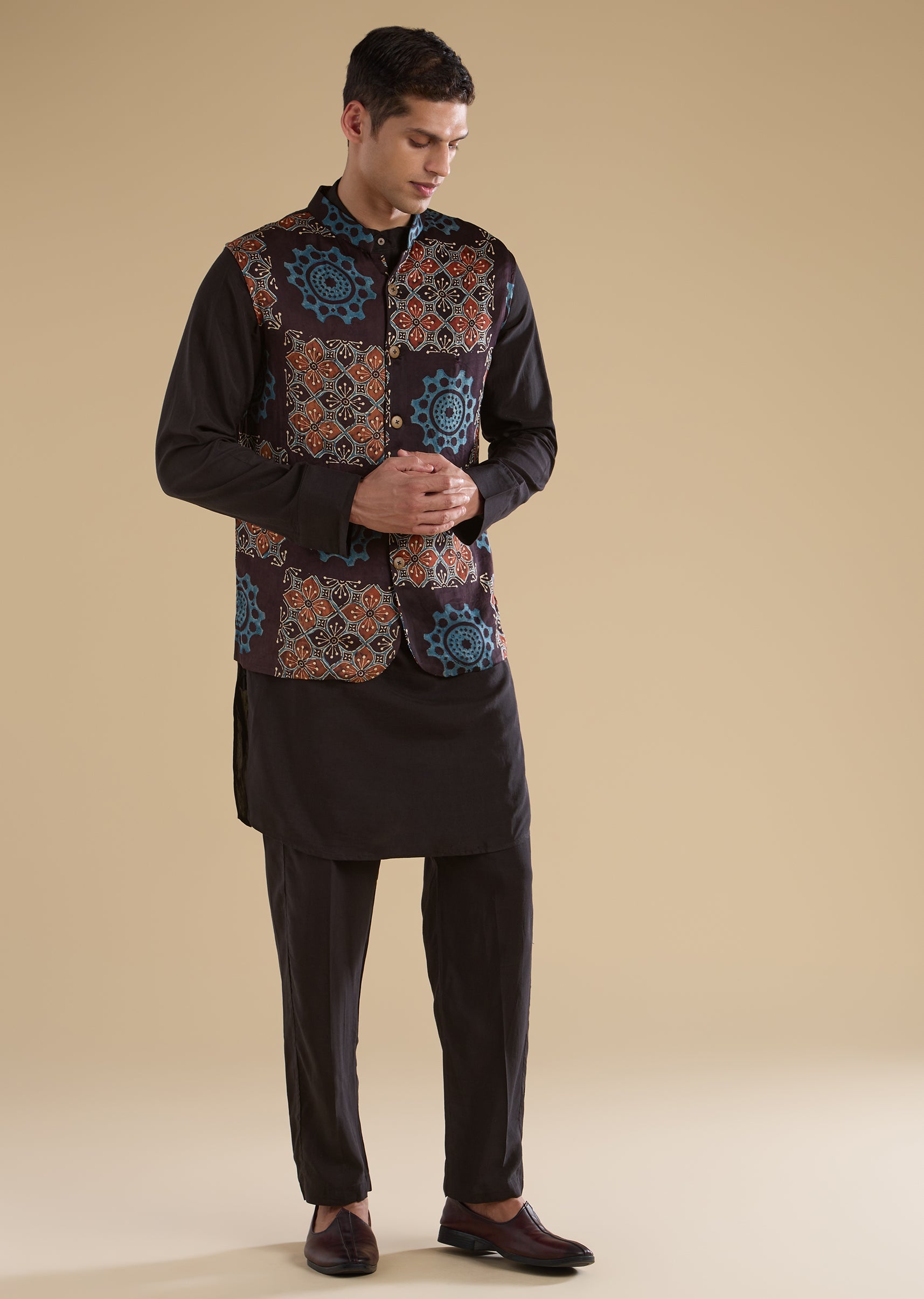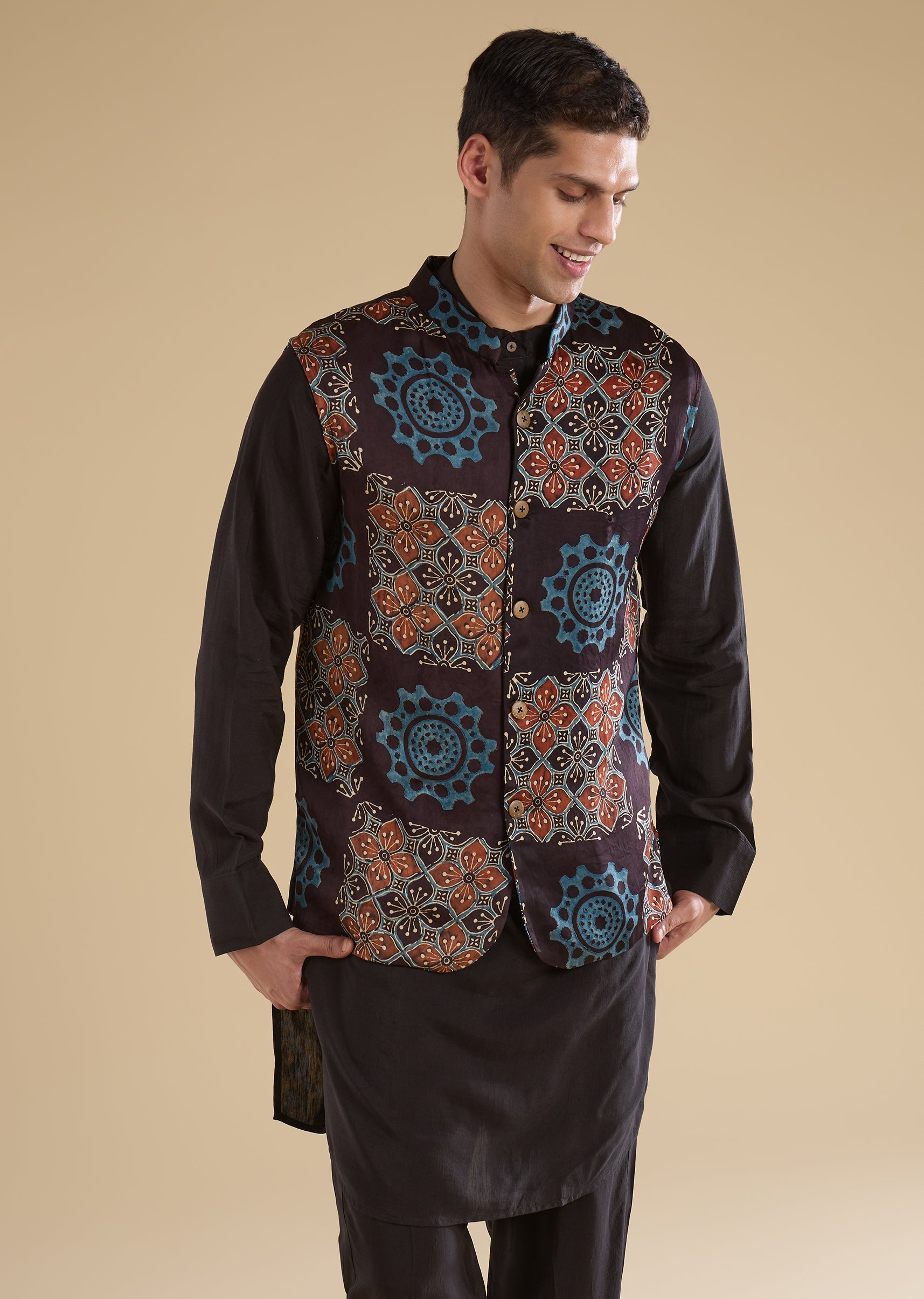 Rooted in tradition with a contemporary sensibility, this black kurta jacket set features a pure handblock Ajrakh bandi paired with a linen-blend kurta for breathable comfort. Designed with a mandarin collar, full sleeves, and side slits, the ensemble balances artisanal detail with modern styling. Finished with straight-fit trousers and a partially elasticated waist, this set is ideal for festive occasions and cultural celebrations. Awarded as the Most Trusted Brand, we're delivering styles you love, just as promised.