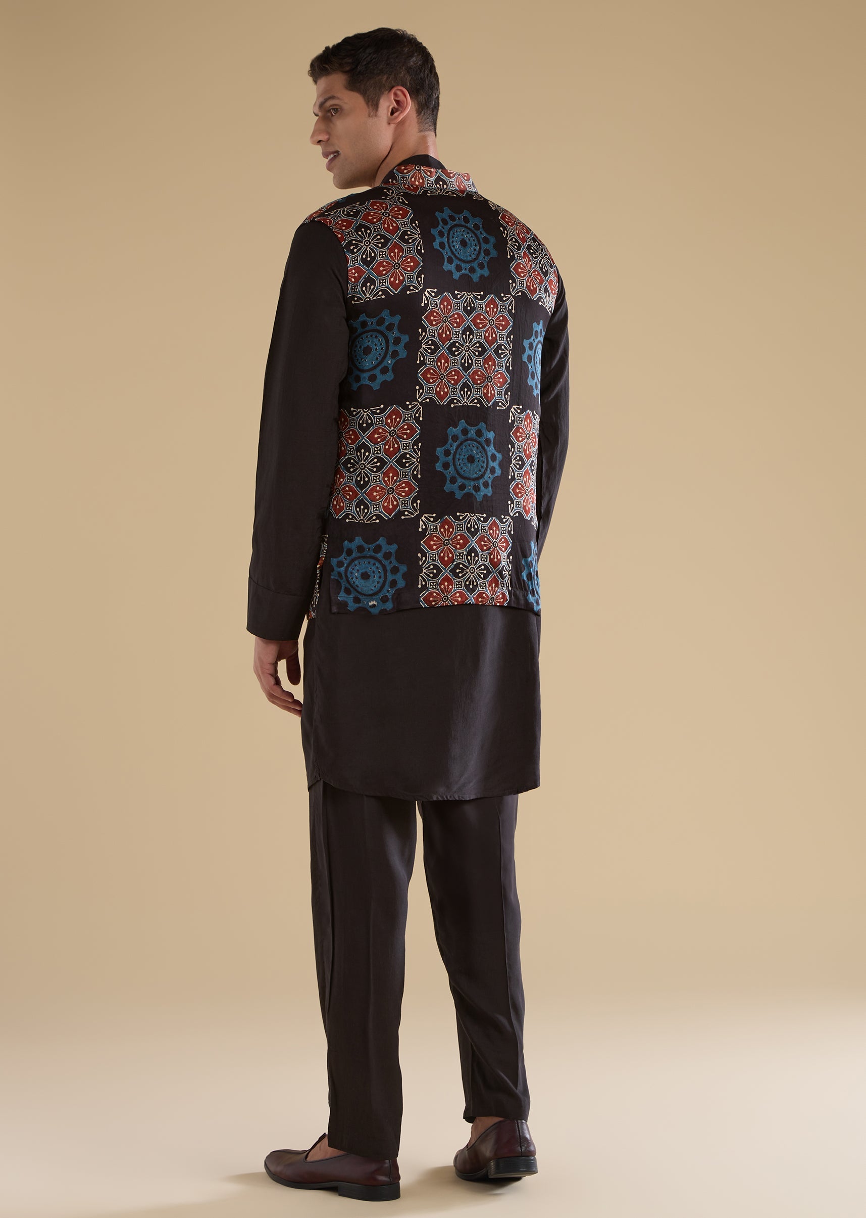 Black Ajrakh Printed Kurta Jacket Set