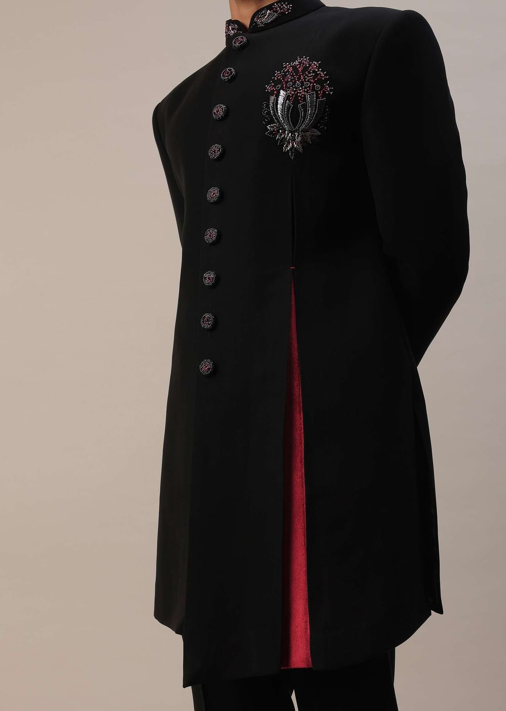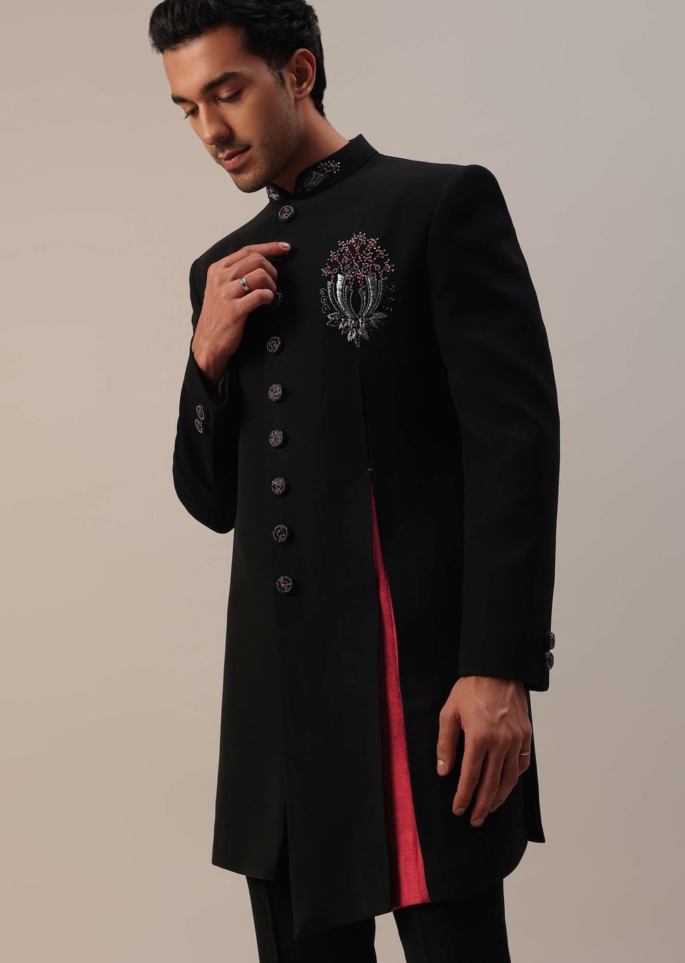 Introducing our black Indowestern in luxurious suiting fabric, a fusion of style and craftsmanship. The Indowestern boasts intricate resham work and delicate french knot handwork, creating a visual masterpiece of texture and depth. EVENT - Perfect for cocktail parties and receptions. Change folds regularly. Awarded as the Most Trusted Brand, we're delivering styles you love, just as promised.