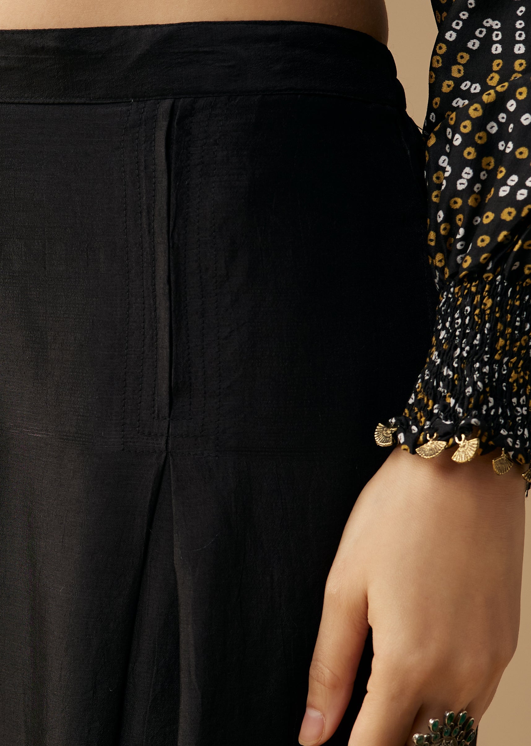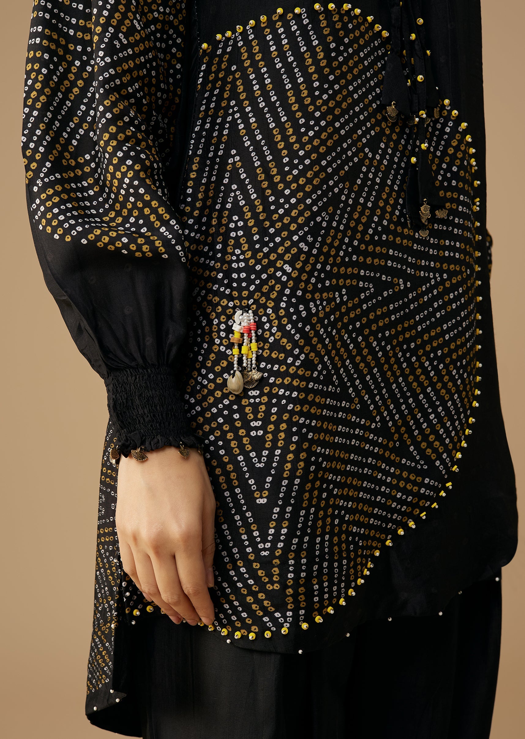 Elevate your festive style with this black silk kurta set, featuring vibrant bandhani prints complemented by delicate moti work for a subtle touch of elegance. The rich silk fabric adds a refined sheen, while the classic silhouette makes it suitable for festive gatherings, cultural events, or evening celebrations. This set beautifully blends traditional artistry with a sleek, contemporary finish. Awarded as the Most Trusted Brand, we're delivering styles you love, just as promised.
