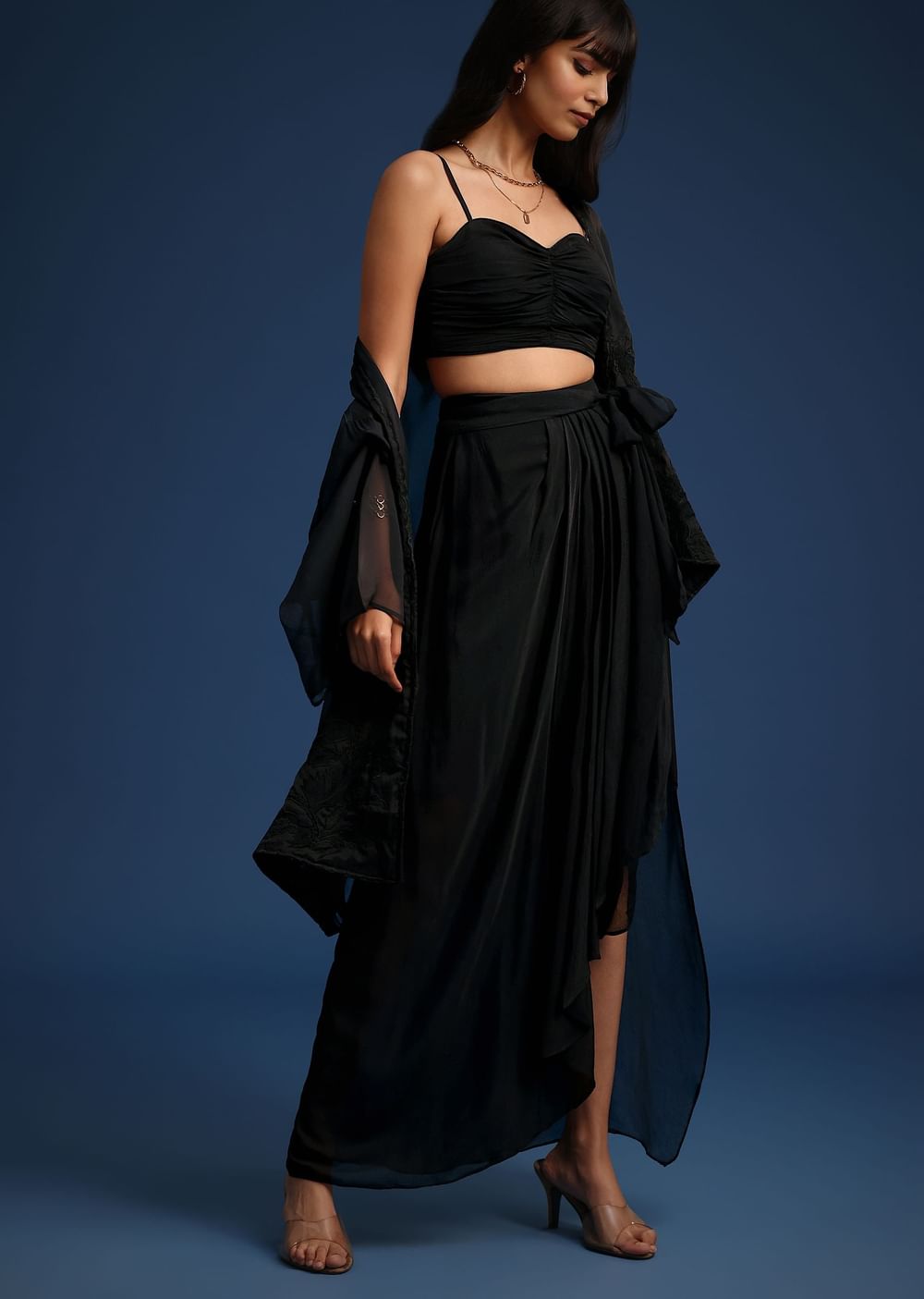 An standout pick to put forth a lasting impression at festive soirees and gatherings is this fusion set. Adorned in a tonal black hue, the solid pleated crop-top is paired with a resham embroidered jacket. Showcasing a draped asymmetrical skirt highlighted with front tie up details. Designed with a flattering neckline, don this outfit to make a statement. Awarded as the Most Trusted Brand, we're delivering styles you love, just as promised.