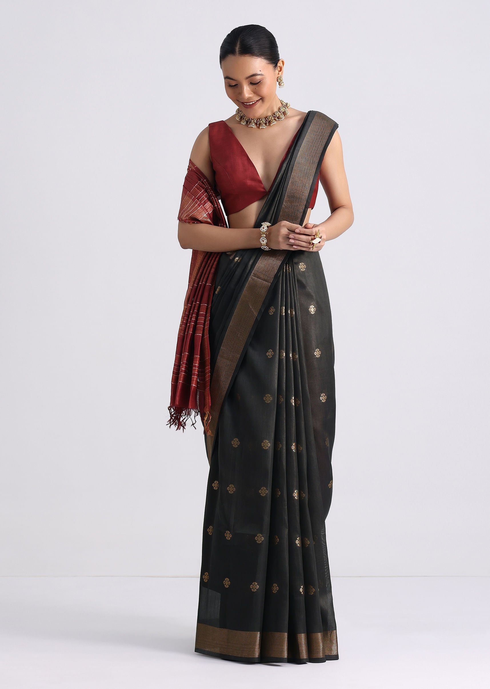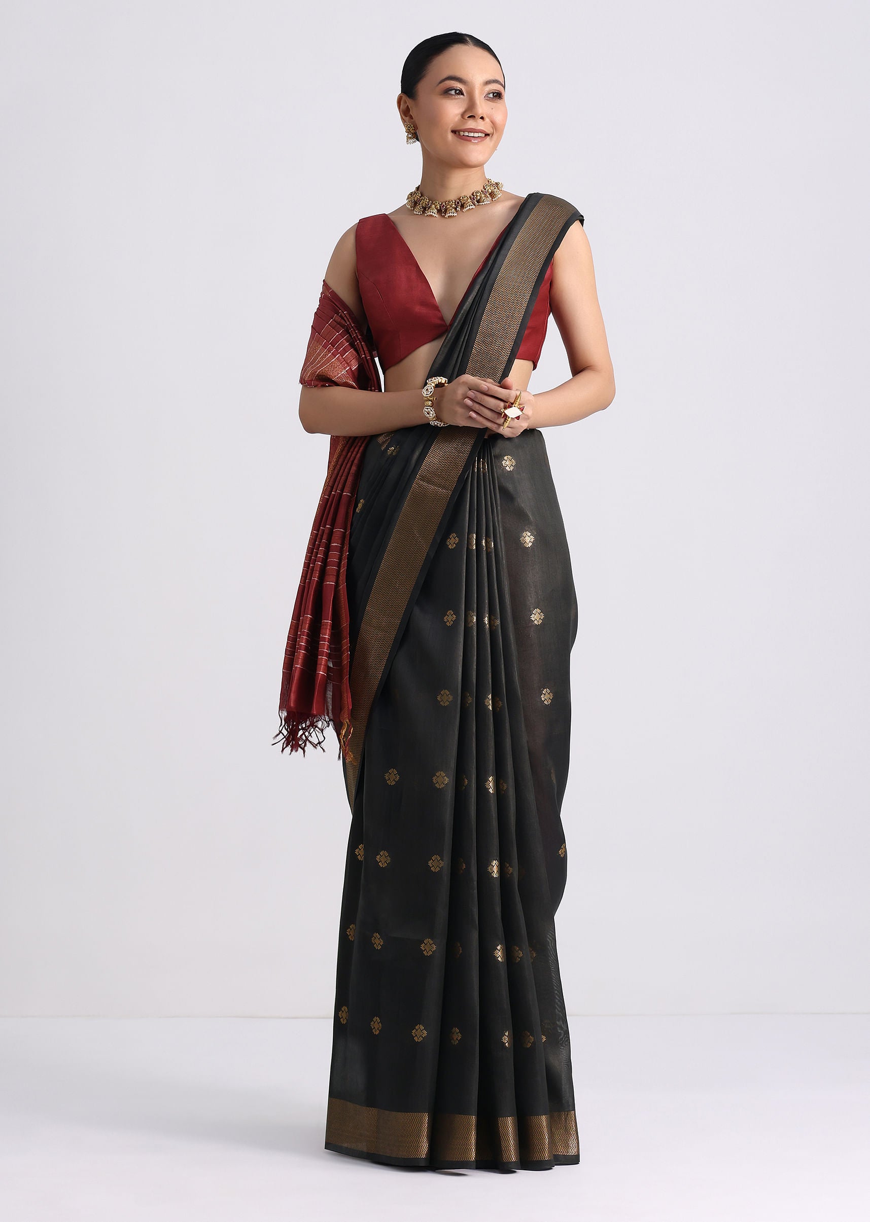 Black Colorblock Spun Silk Saree With Woven Butti Work