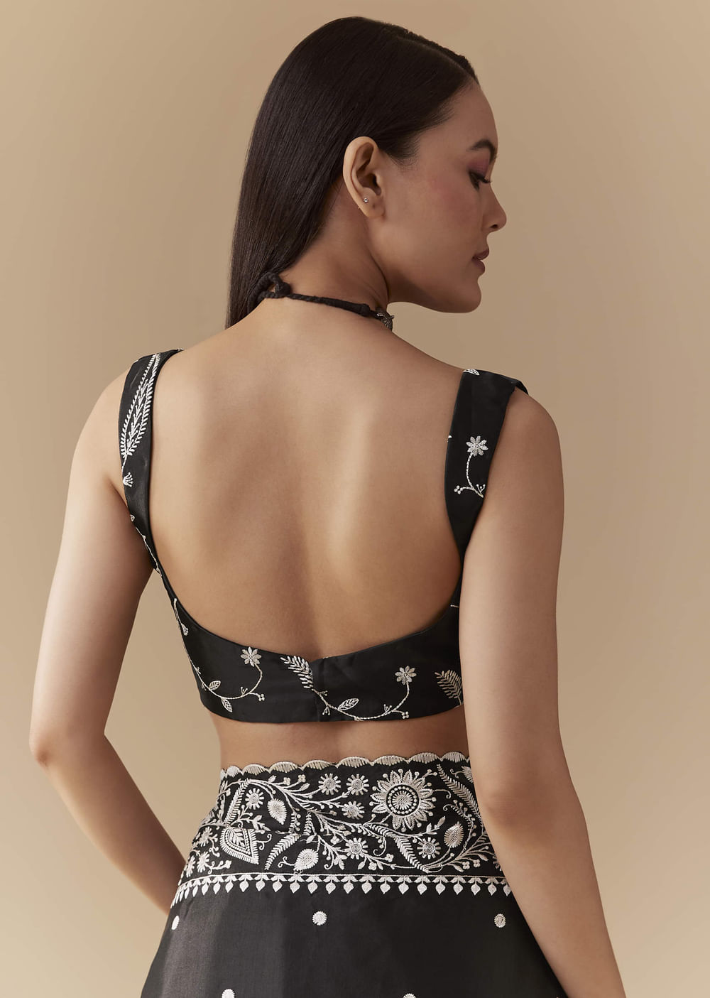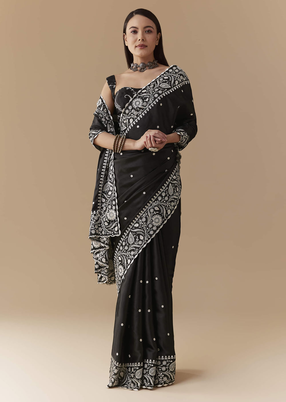 Black Cotton Satin Embellished Saree with Unstitched Blouse