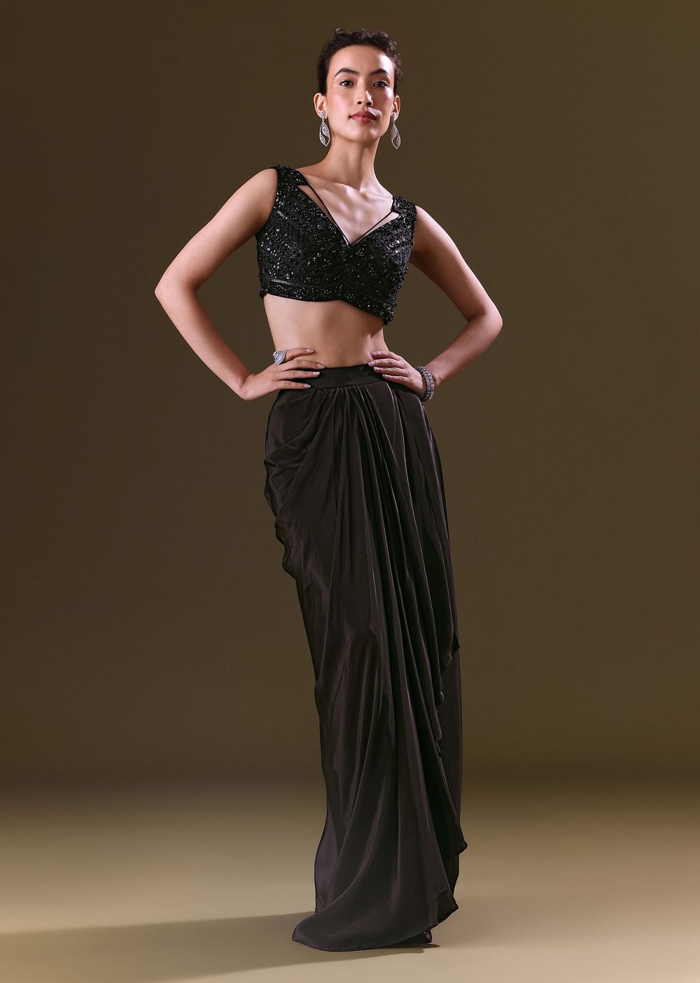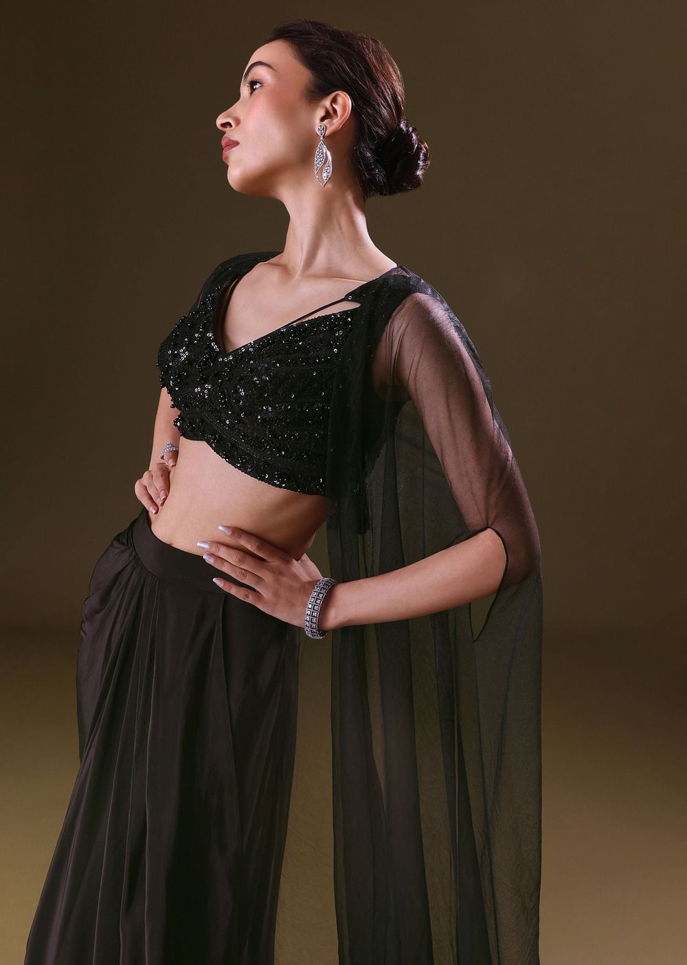 Black Crepe Drape Skirt Choli And Tulle Cape Set