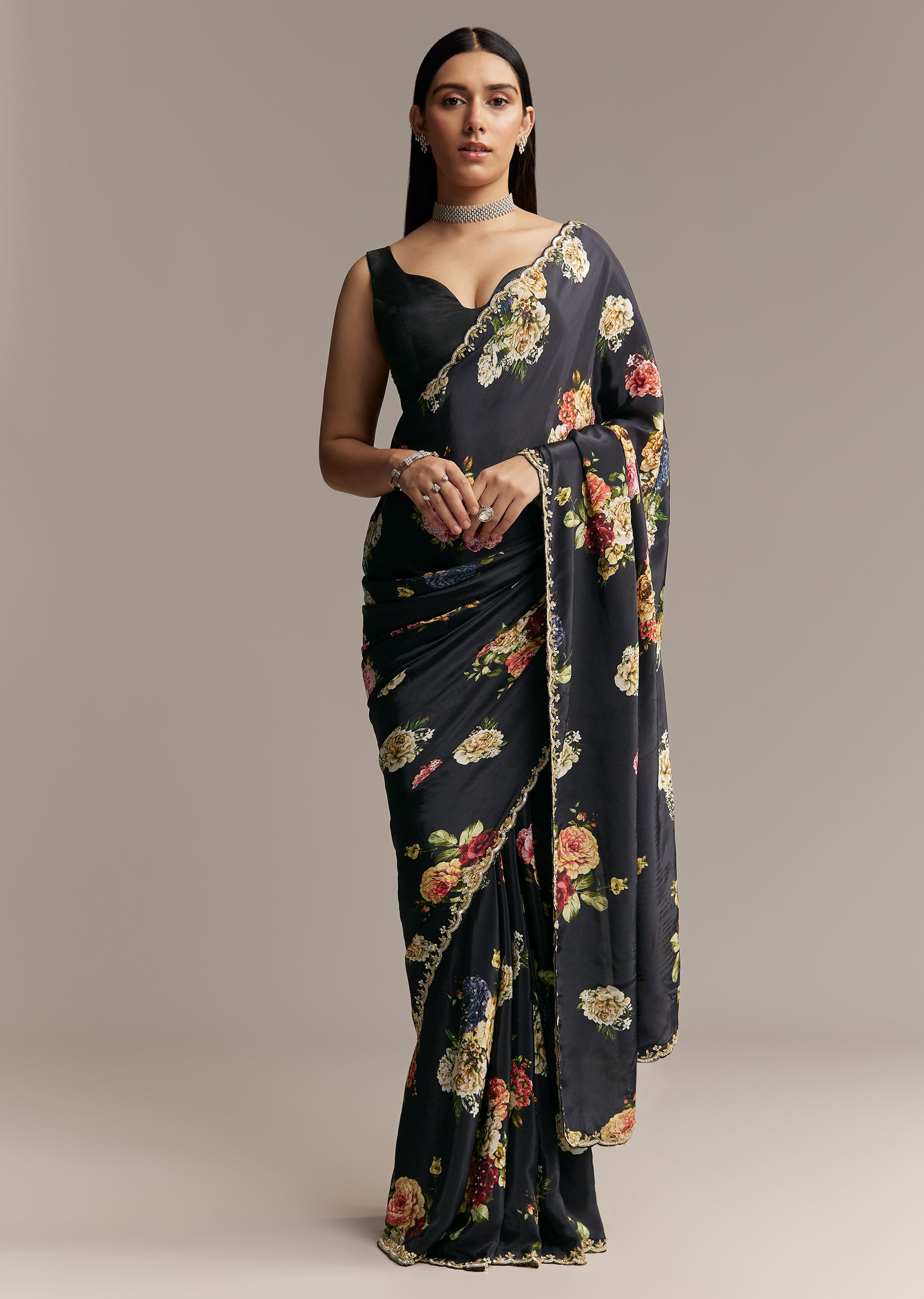 Black Crepe Saree With Floral Digital Print And Embroidered Border