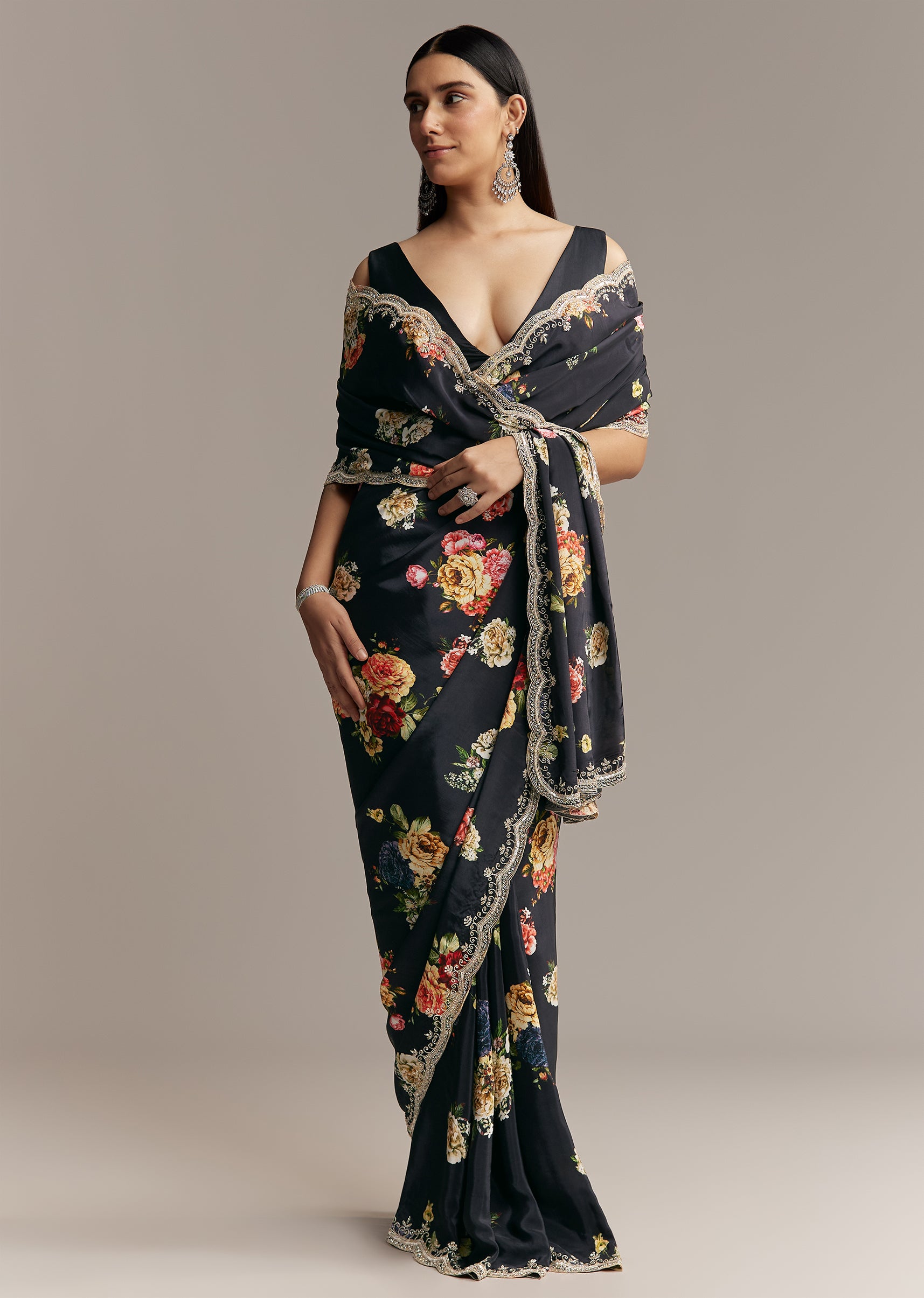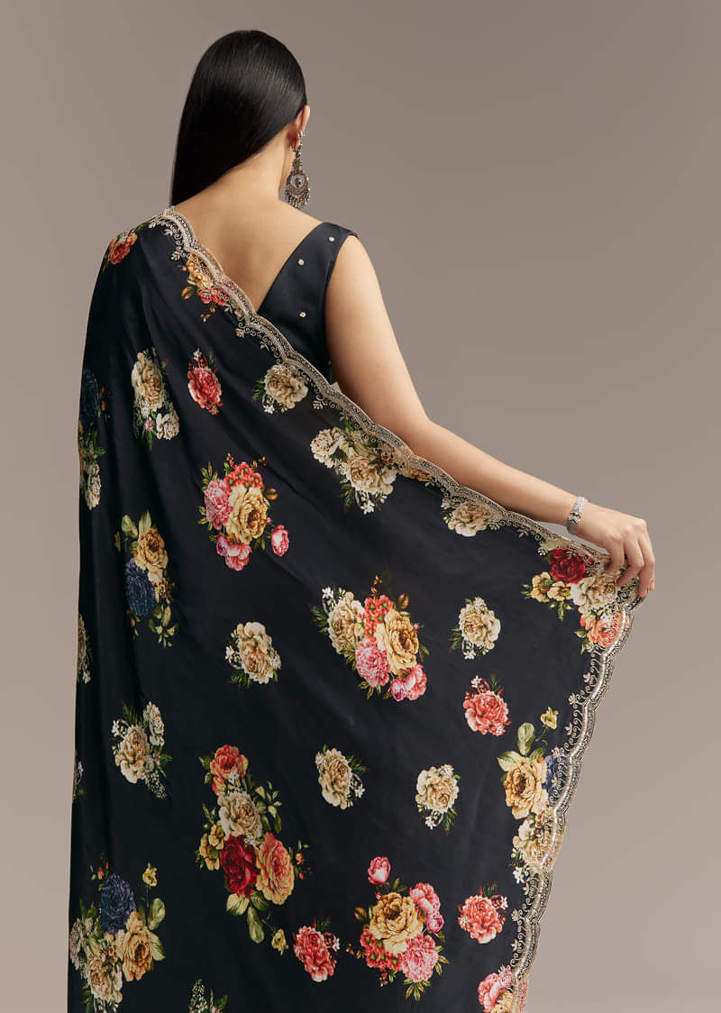 Black Crepe Saree With Floral Digital Print And Sequin Border