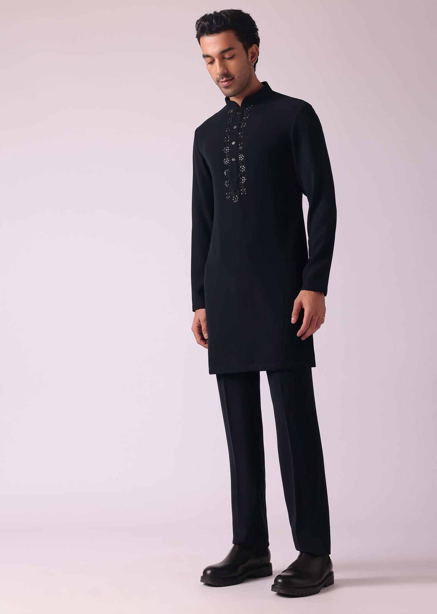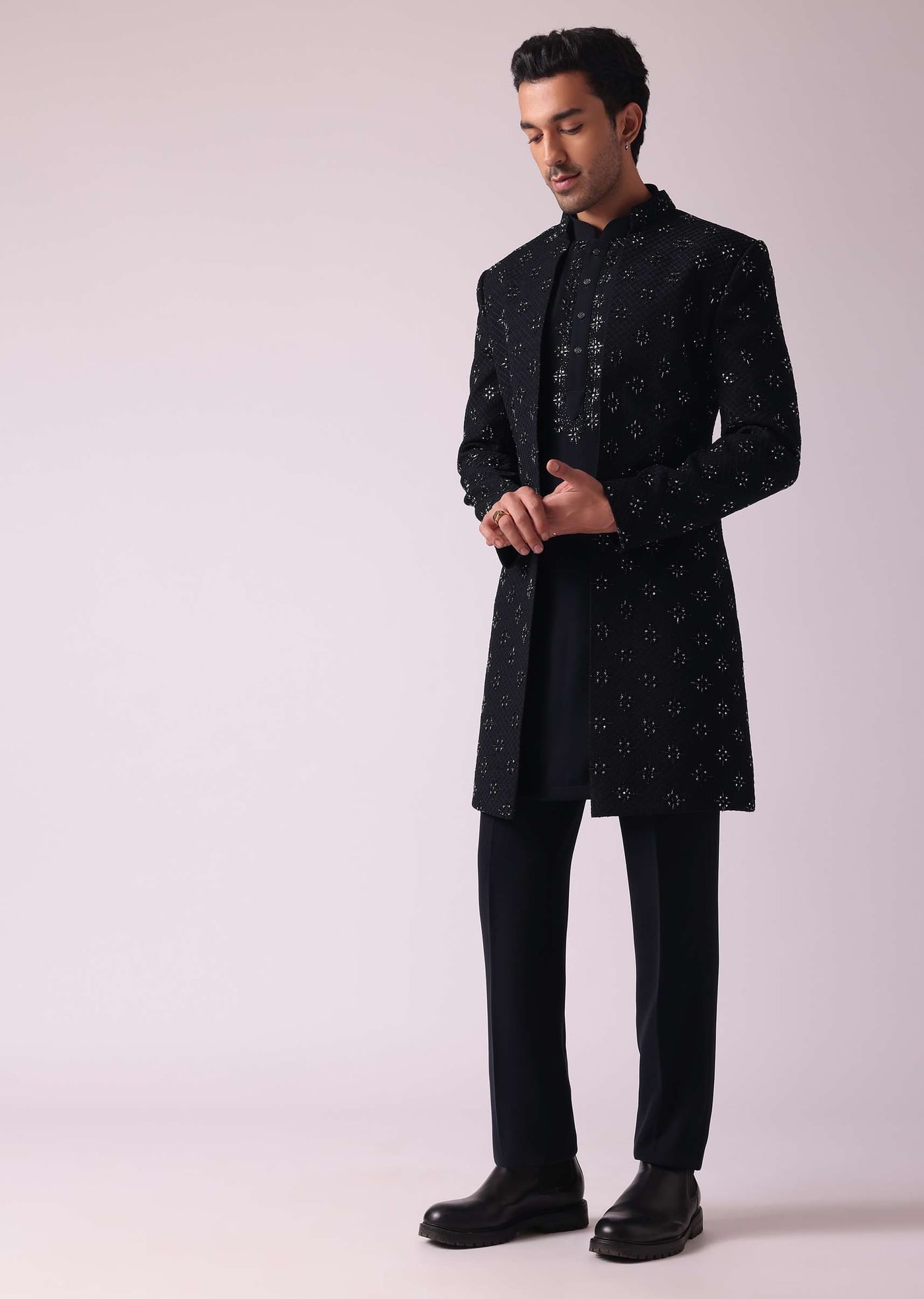 Introducing our black indowestern suit crafted from luxurious suiting fabric. The jacket is adorned with intricate cut work adding a touch of artistry to your ensemble. This set comes complete... More Product Details