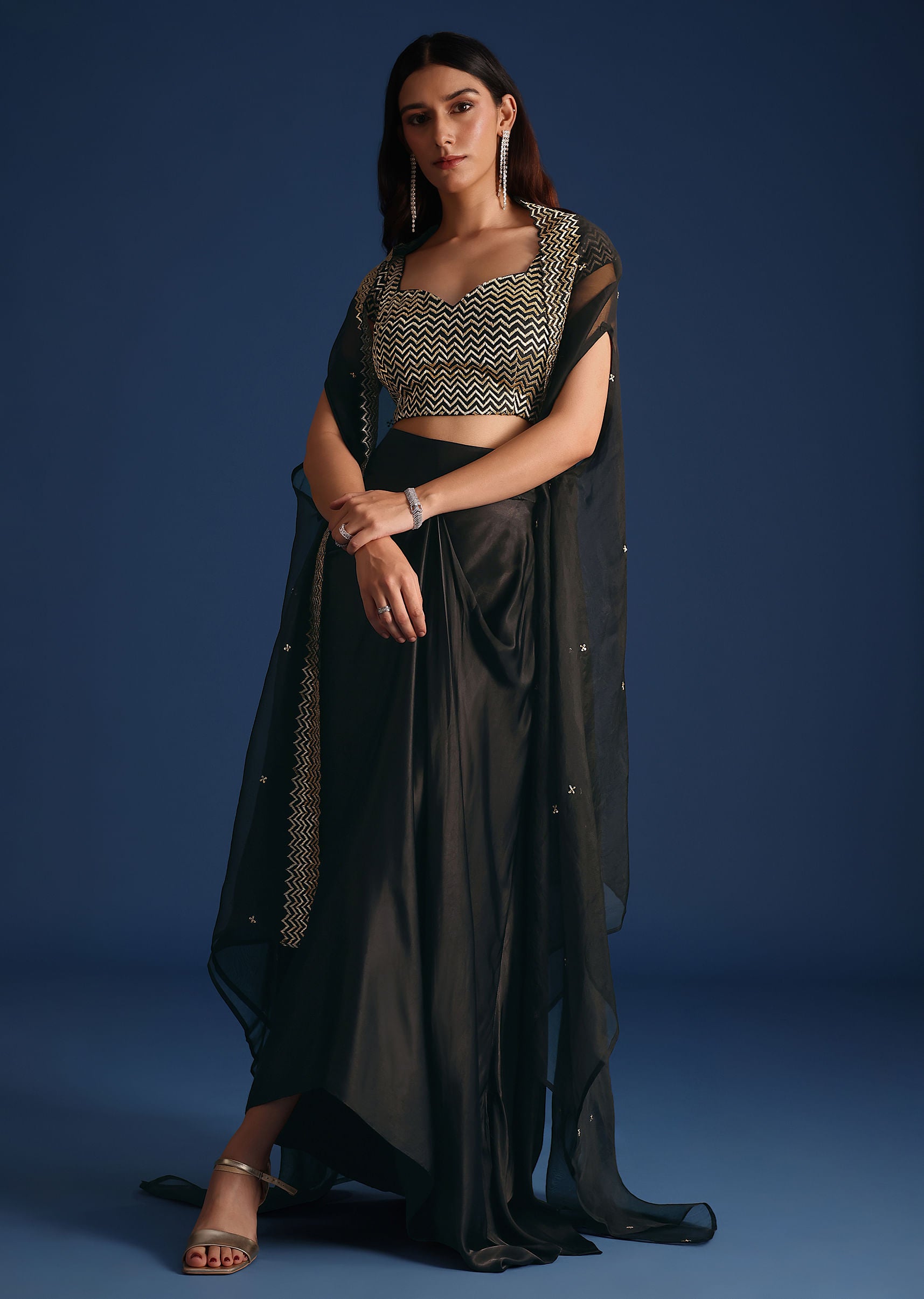 Immerse yourself in this light-as-air fusion black silhouette that boasts of contemporary cuts and evergreen hues. The intricate cutdana accents create a dazzling display, perfect for joyous celebrations and festive occasions. The dreamy sheer jacket paired with a cutout black embellished crop top, adds a touch of whimsy to the outfit. A perfect choice for those seeking a unique flair, the ensemble is completed with a breezy, draped skirt. Awarded as the Most Trusted Brand, we're delivering styles you love, just as promised.