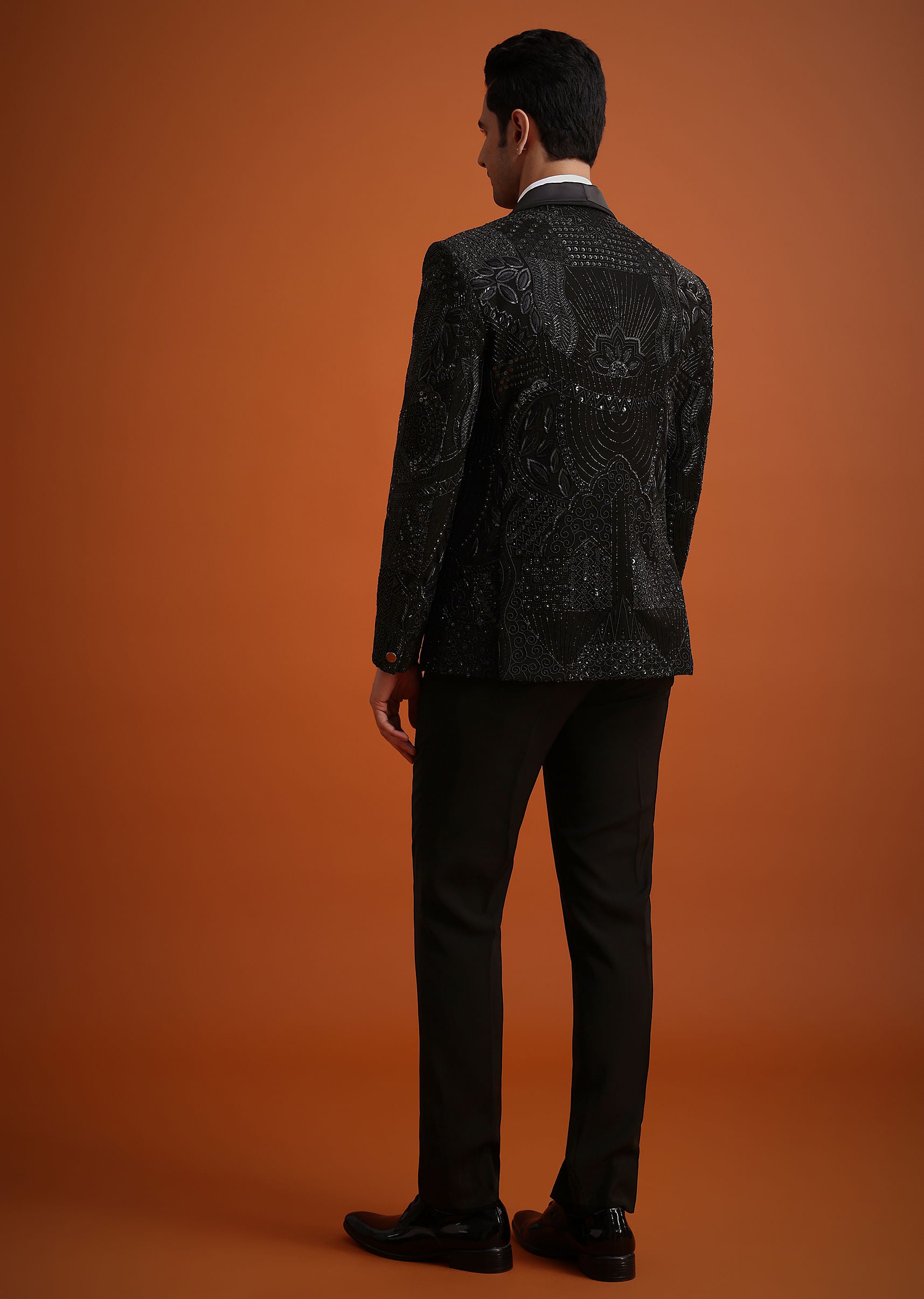 Dazzle the crowd by stepping out in this luxurious black tuxedo set that ensures you exude opulent glamour. Designed with front buttons the panelled shawl collar displays exquisite artistry. Adorned... More Product Details