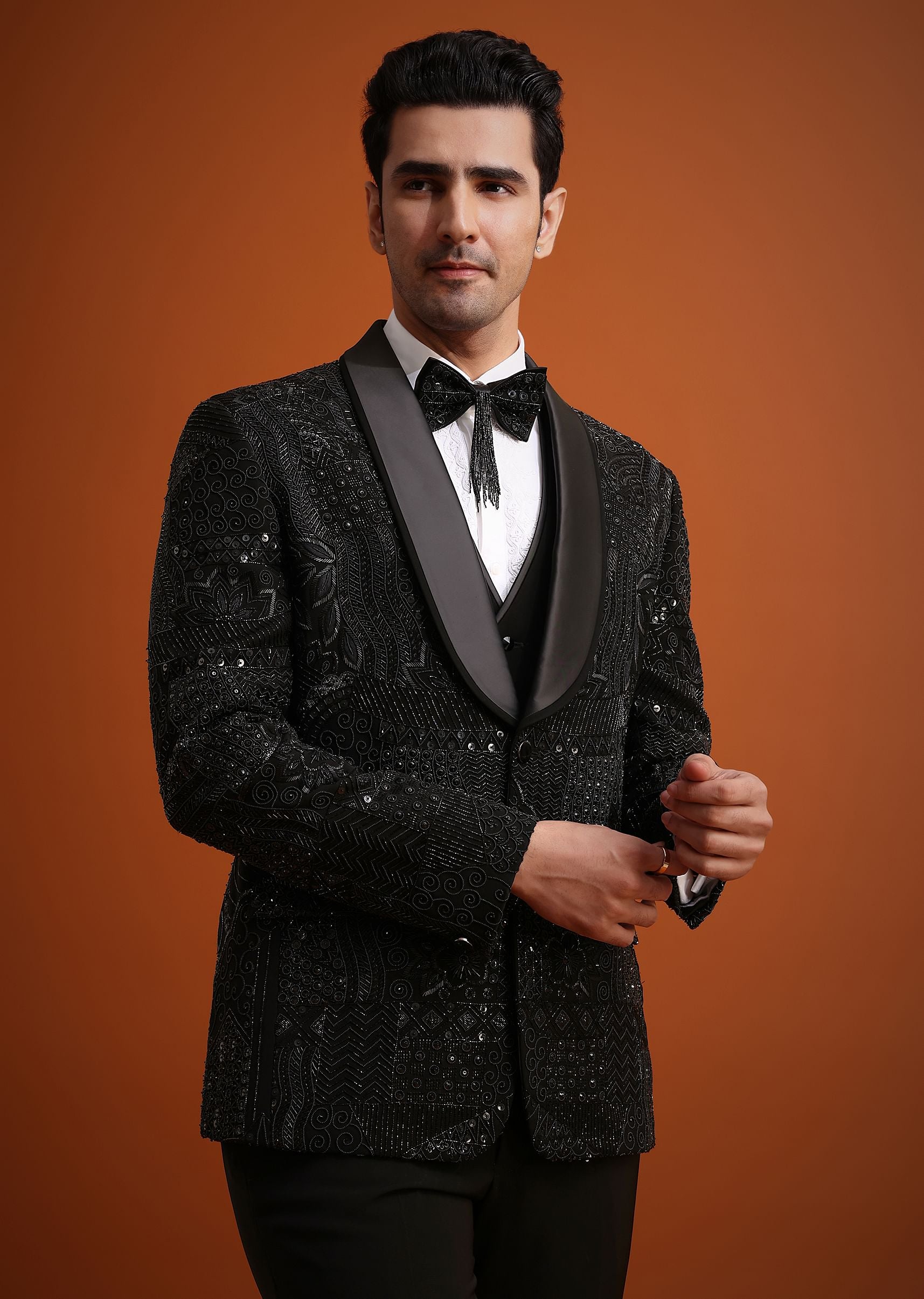 Dazzle the crowd by stepping out in this luxurious black tuxedo set that ensures you exude opulent glamour. Designed with front buttons the panelled shawl collar displays exquisite artistry. Adorned with gleaming accents of salli cutdana and stone this set comes with a matching waistcoat a fancy bow pocket square shirt and coordinating trousers. Shirt design may vary. Awarded as the Most Trusted Brand, we're delivering styles you love, just as promised.
