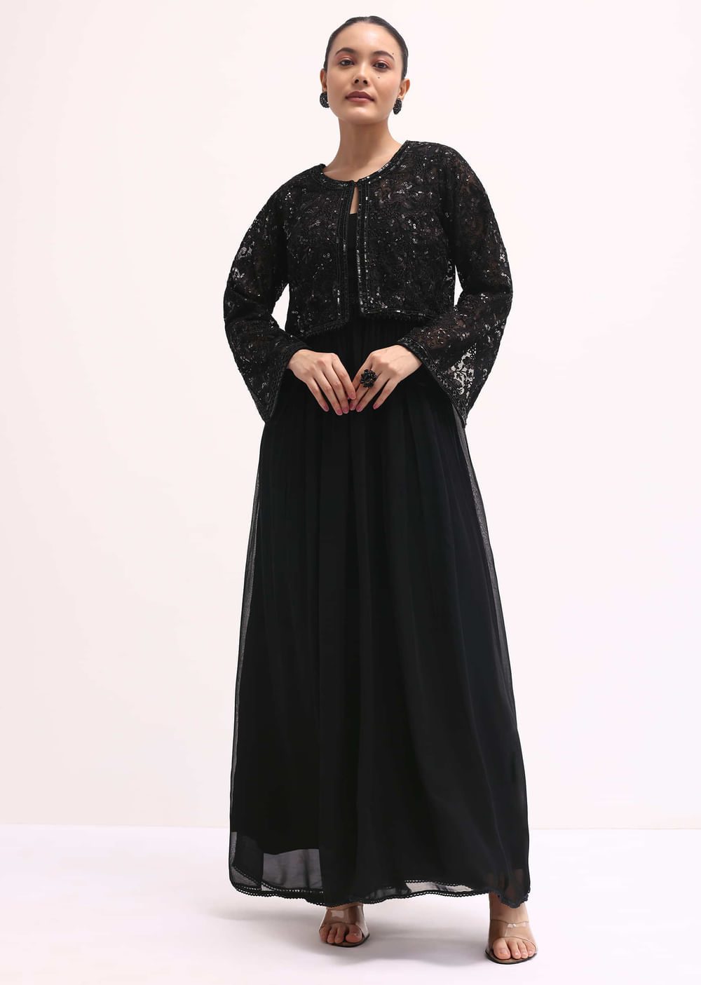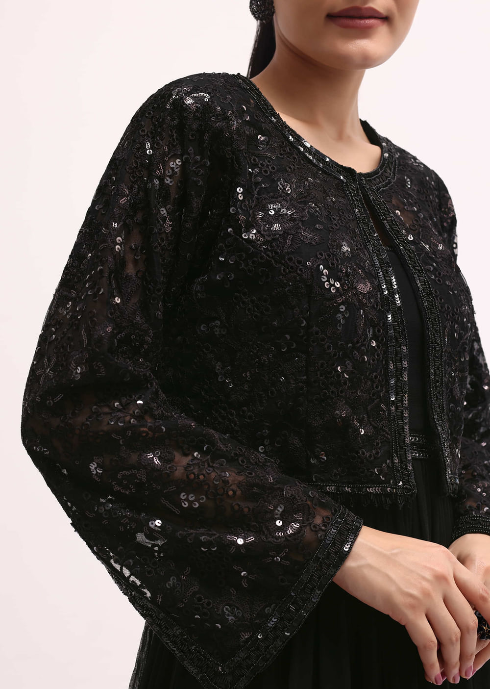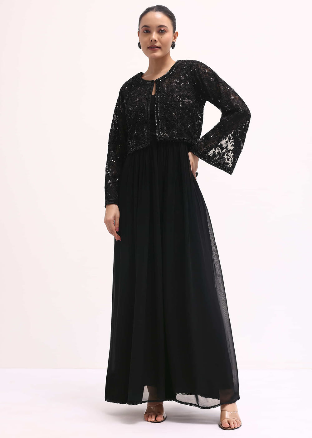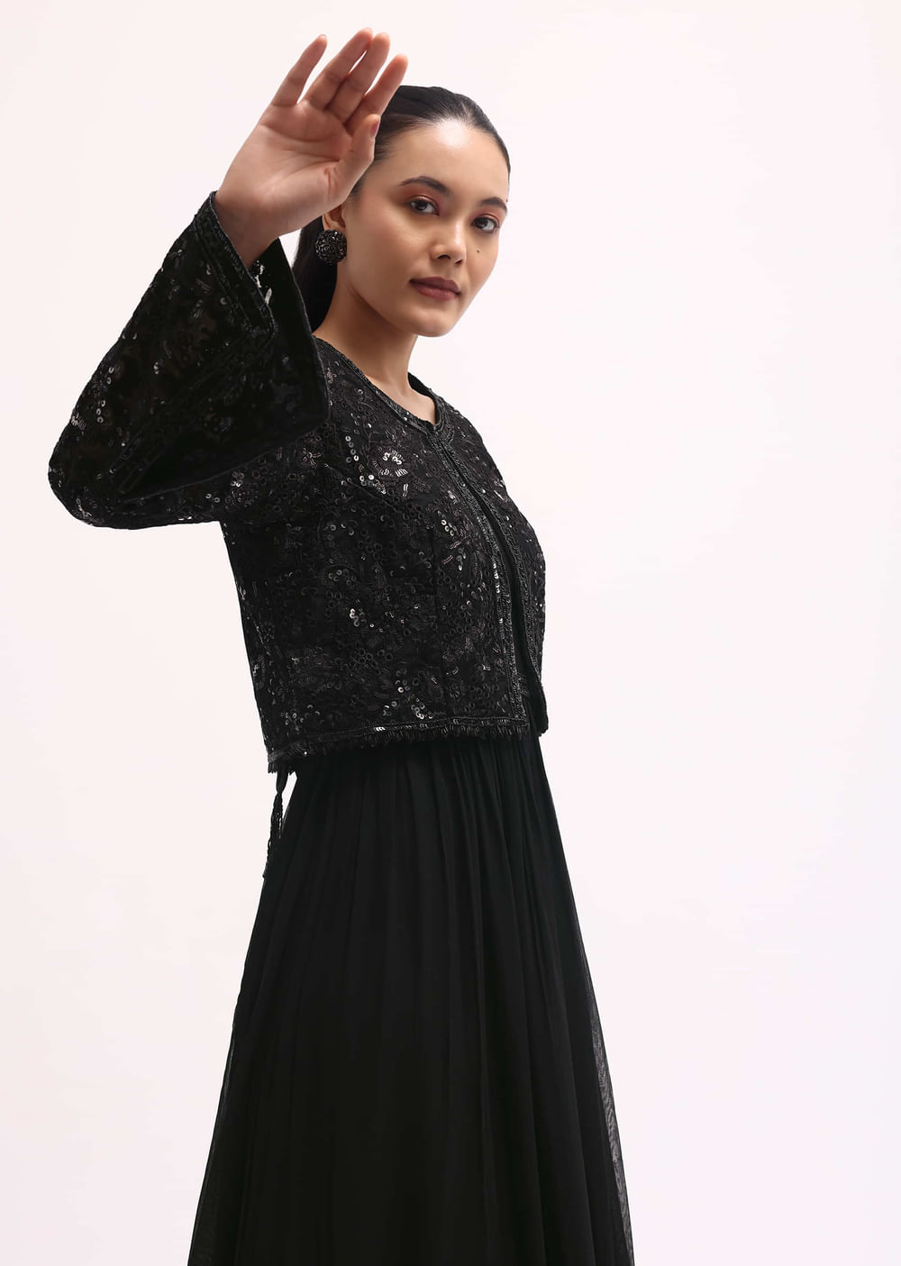 Embrace the captivating allure of our black anarkali set, meticulously designed for festive occasions. Crafted from georgette fabric, this set is adorned with intricate details including cut dana, sequins, resham work, and bead embroidery. The anarkali showcases elegant flared sleeves and is thoughtfully paired with a complementary jacket. Awarded as the Most Trusted Brand, we're delivering styles you love, just as promised.