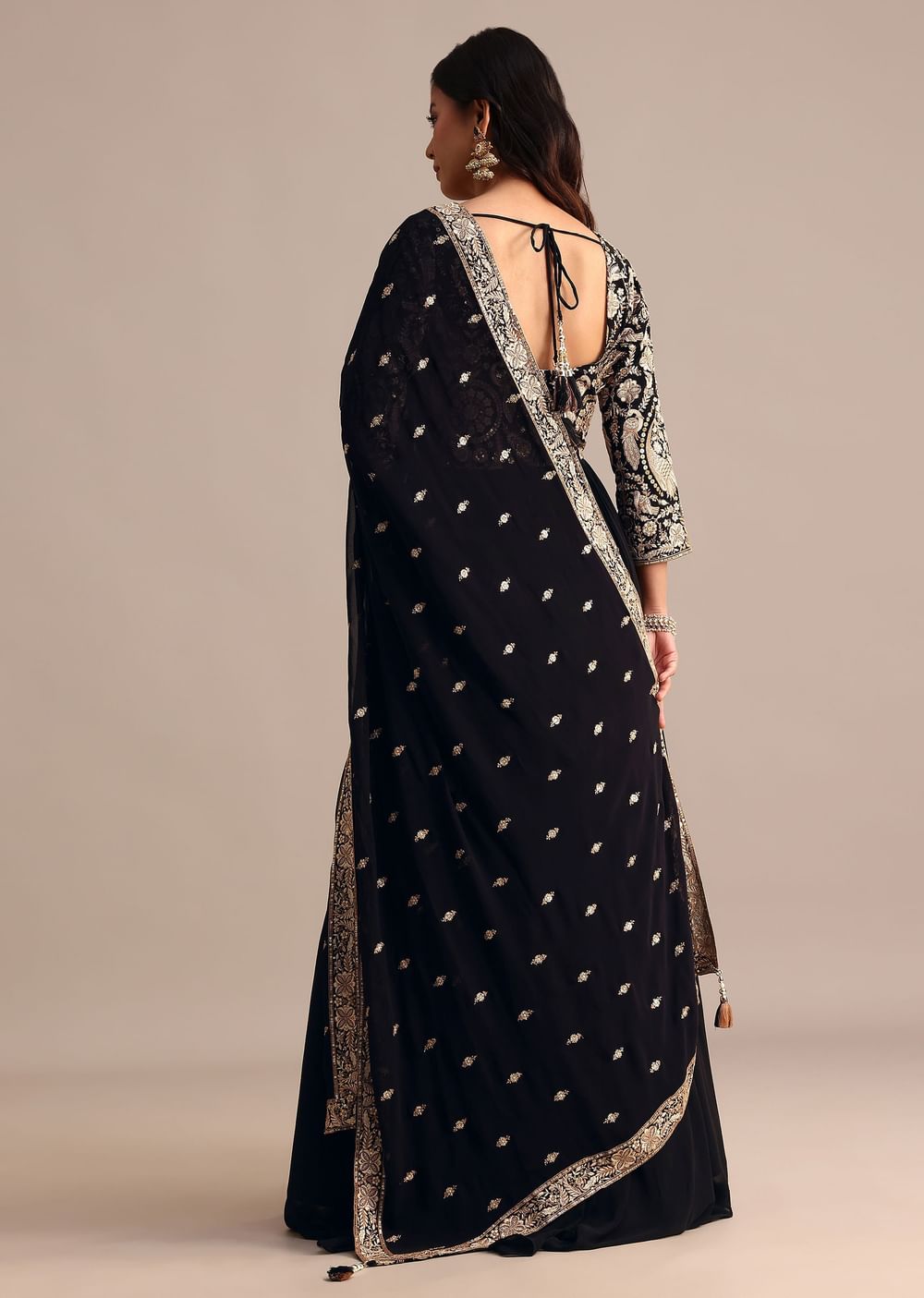 • Mesmerize the crowd in this stunning black anarkali set beautifully crafted from a rich georgette base.