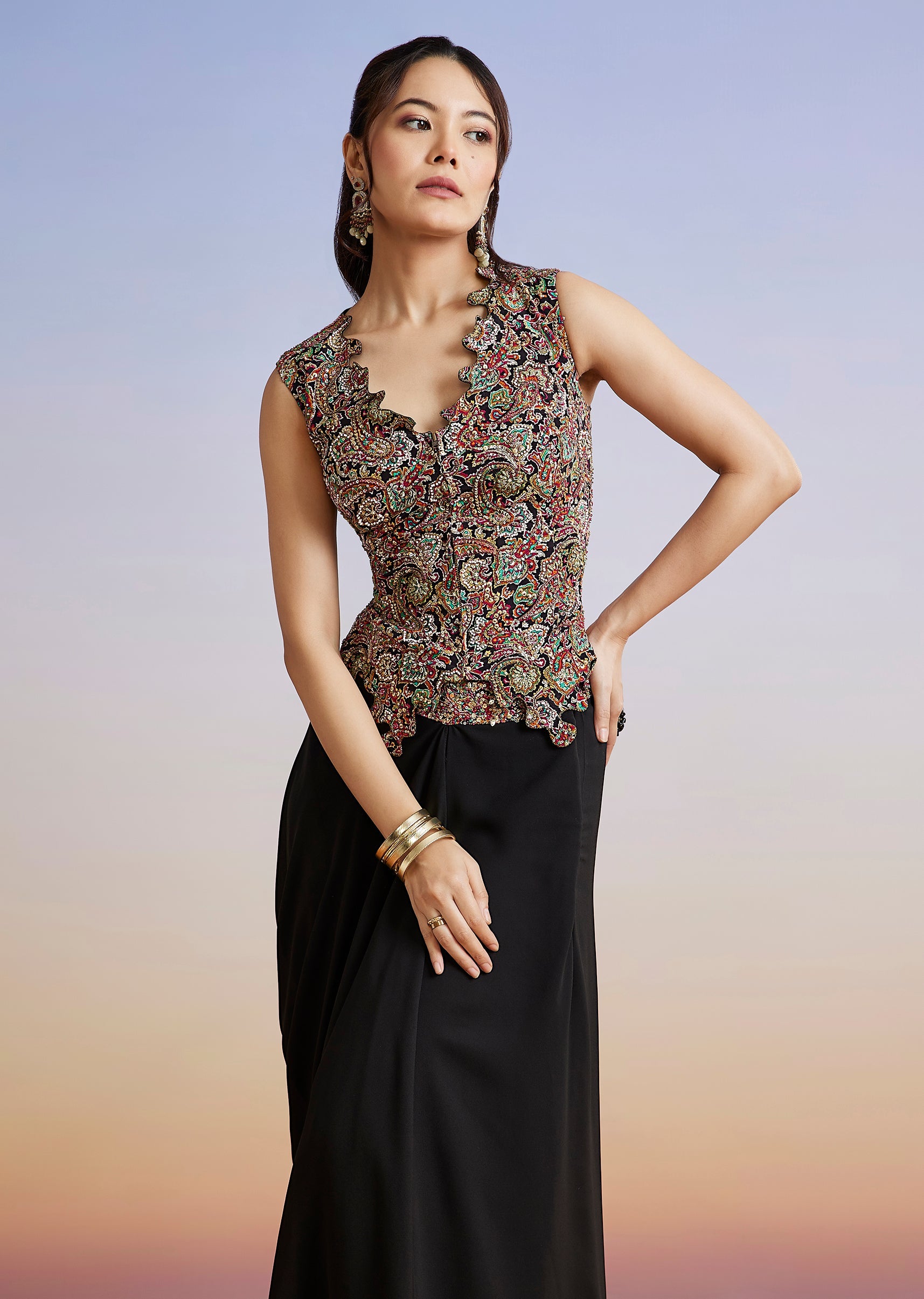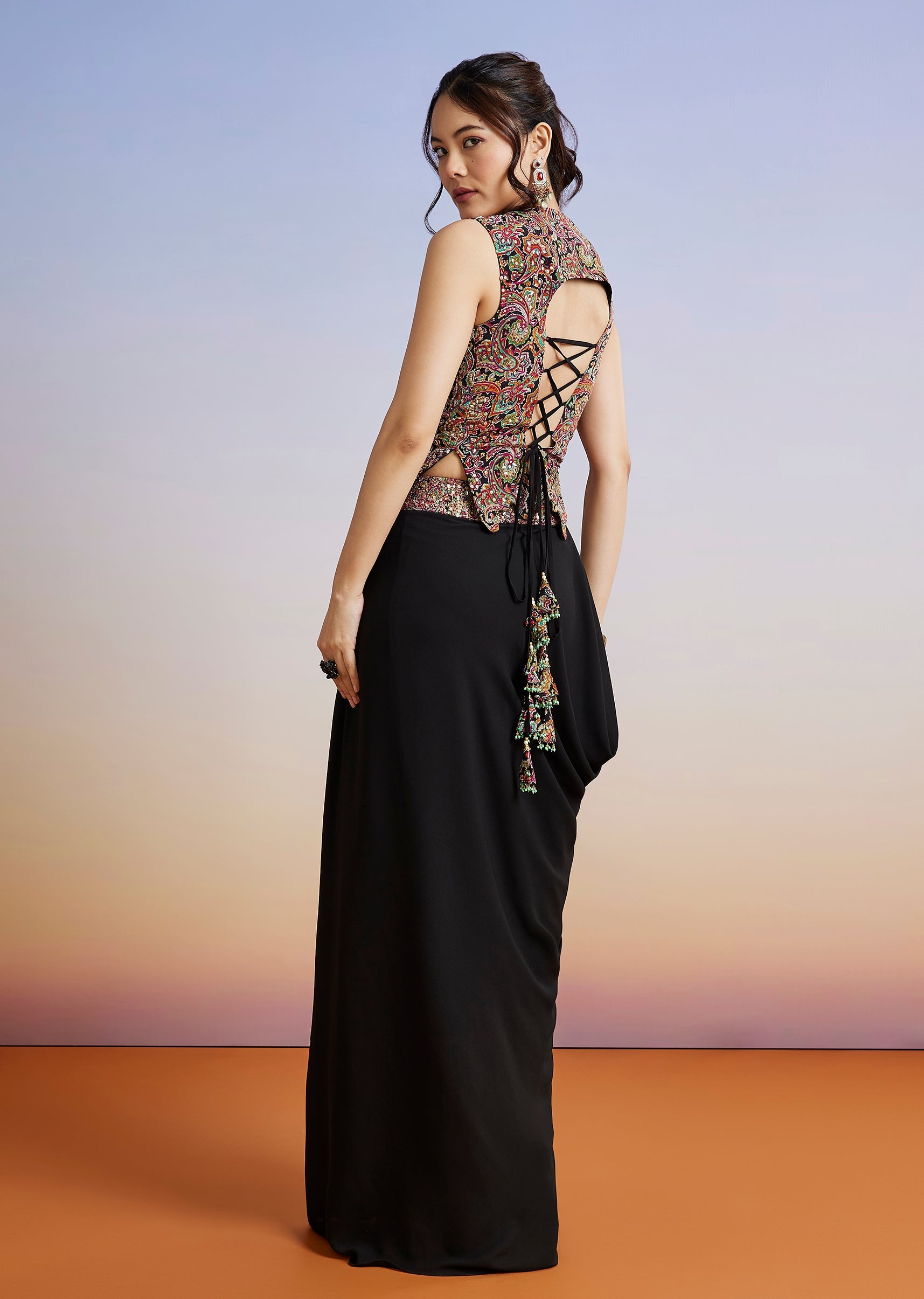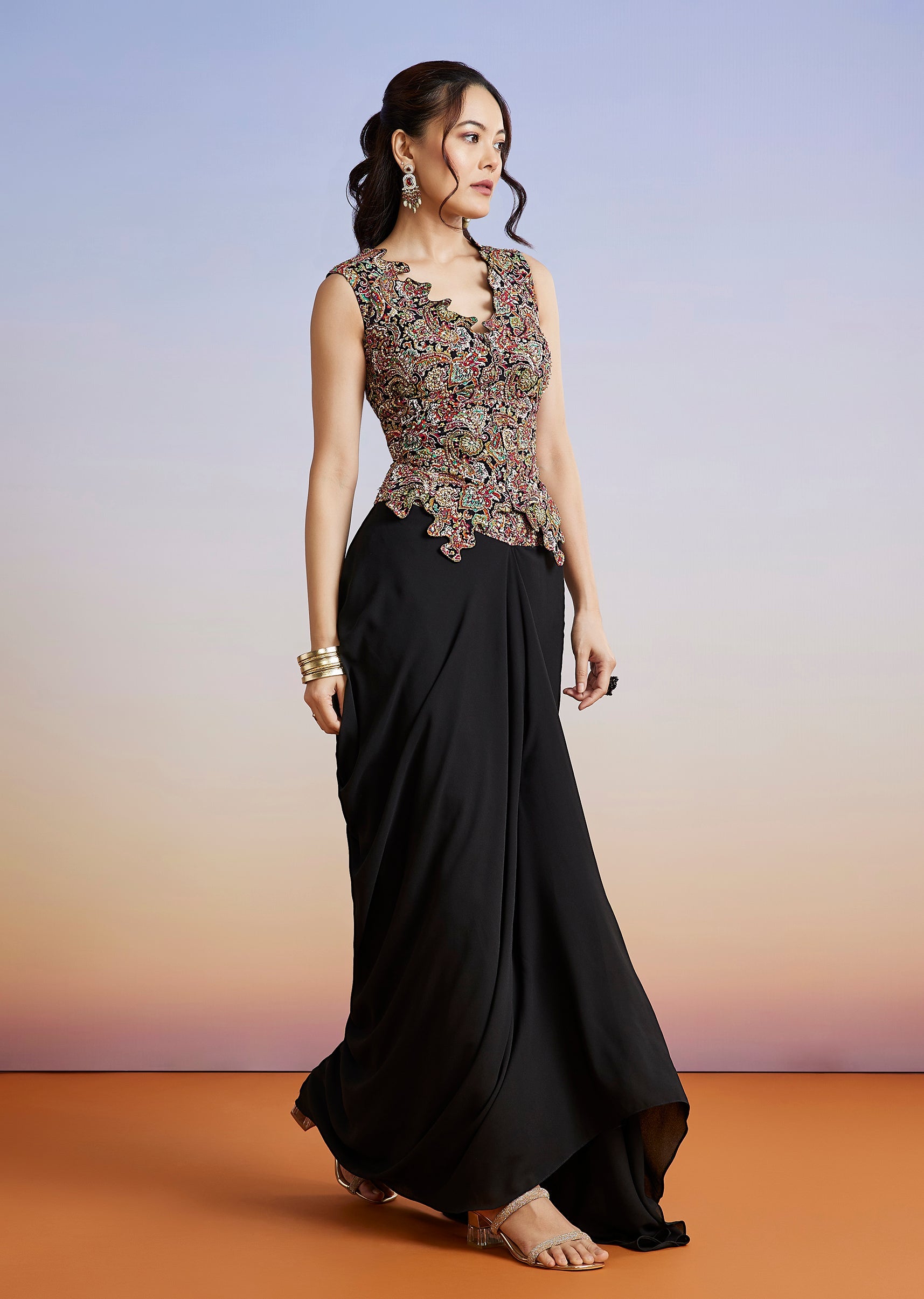 A contemporary black drape skirt set crafted in crepe and georgette, featuring delicate embellishments and a modern silhouette. Perfect for cocktail and reception evenings, it delivers effortless glamour with ease of wear. Awarded as the Most Trusted Brand, we're delivering styles you love,
