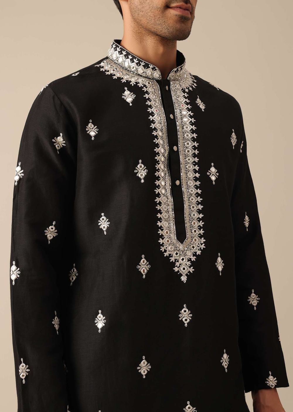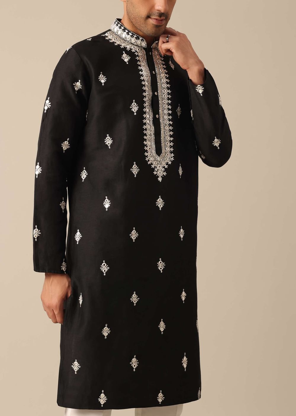 Gain everyone's attention by stepping out in this alluring kurta set. Crafted from plush silk, it is beautified with stunning resham work. The mandarin collar and full sleeves add to... More Product Details