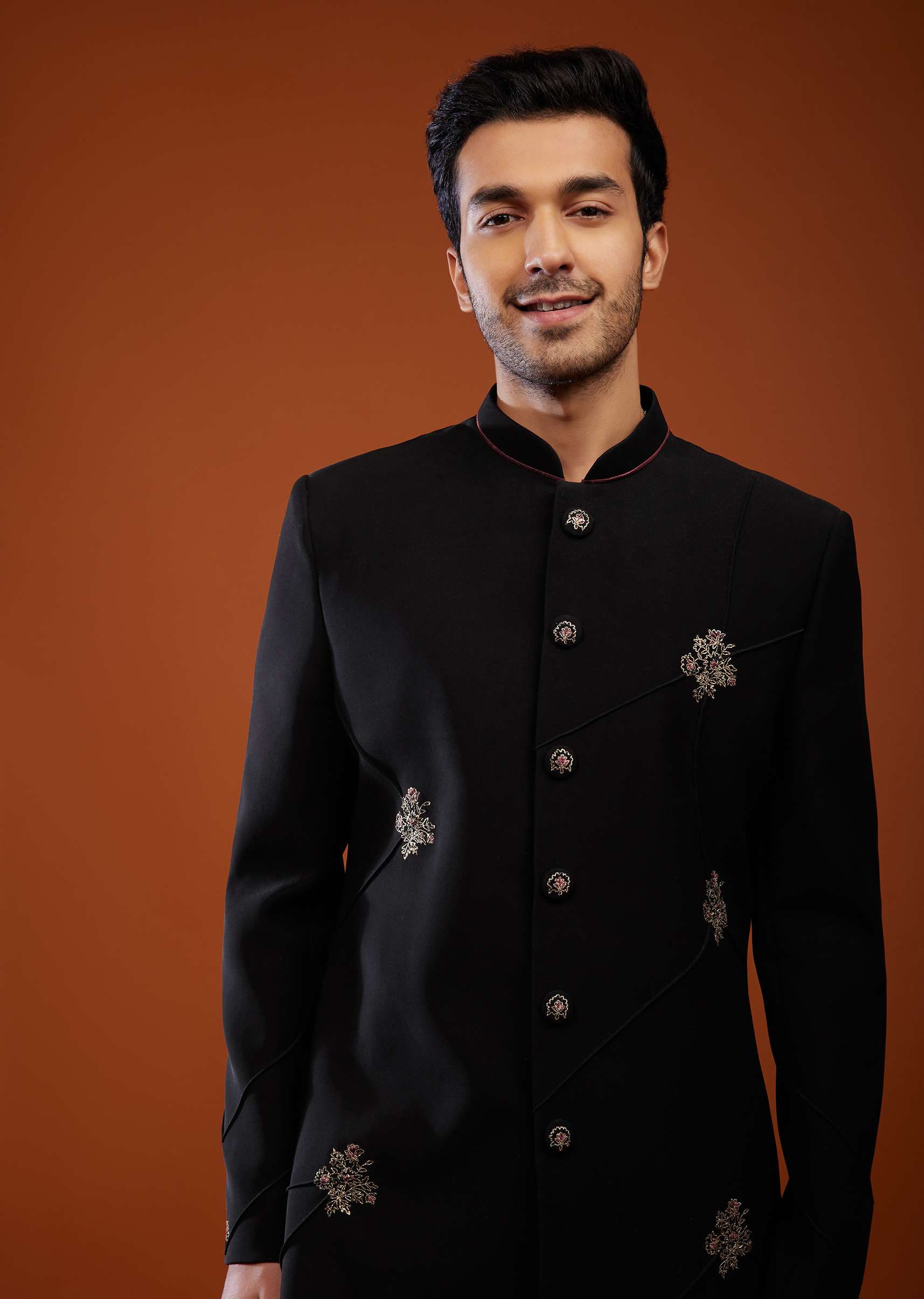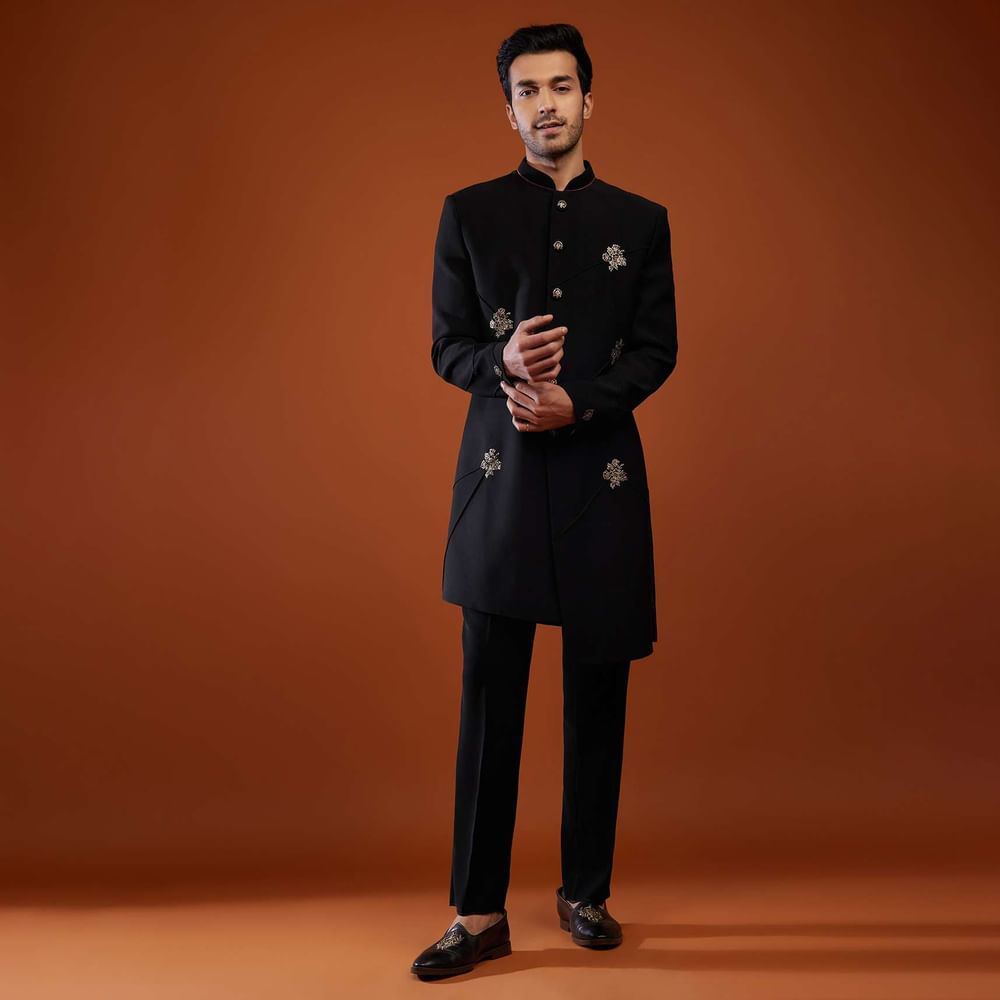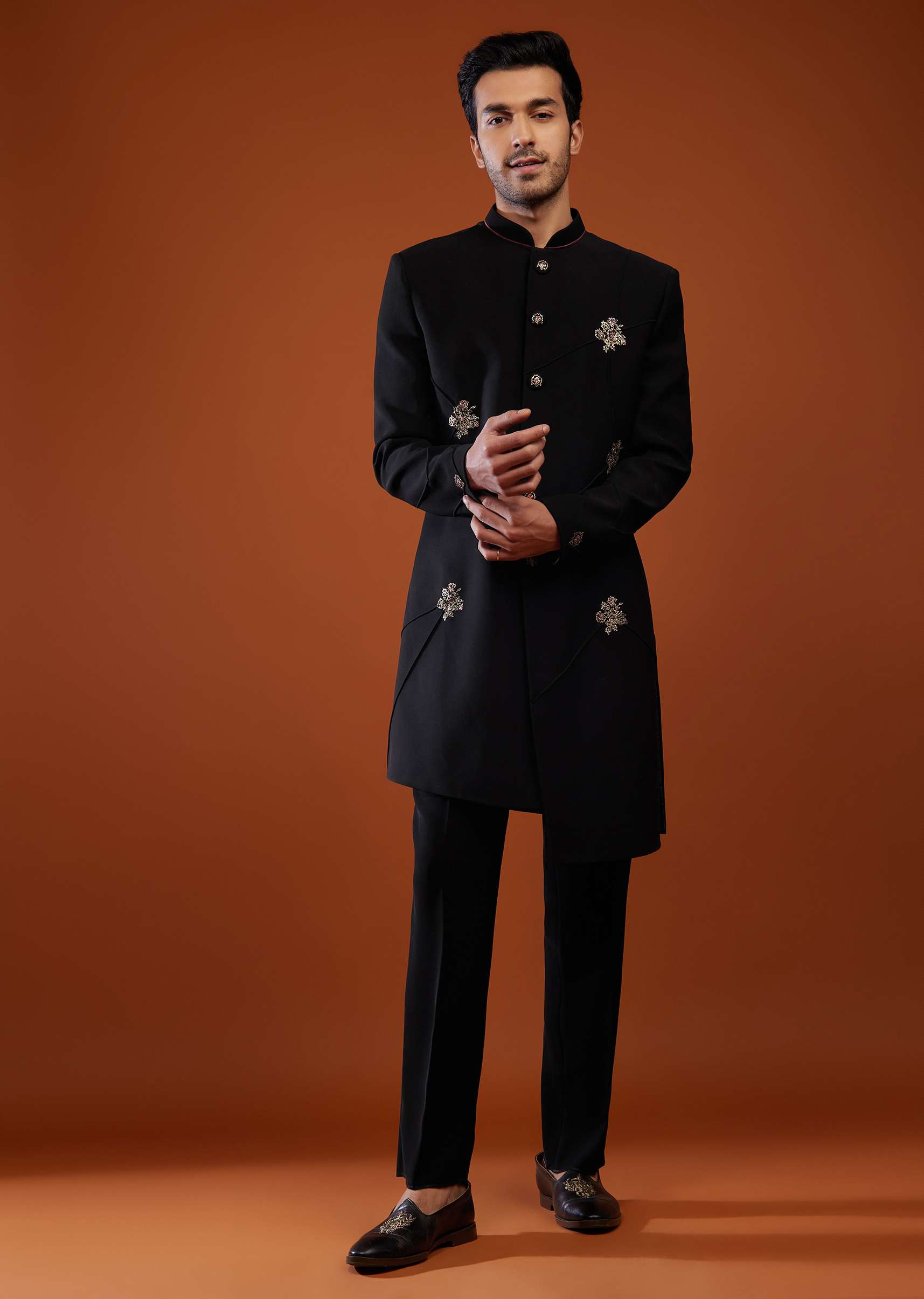 Elegant Black Sherwani Set tailored in imported suiting fabric.The Sherwani comes in intricate floral embroidery buttis highlighted with thread and zari work with a button-down closure.It has round embroidered buttons, a mandarin collar, and full sleeves and is paired with a matching churidar.Buttons and Accessories may vary in color, shape and size. Awarded as the Most Trusted Brand, we're delivering styles you love, just as promised.