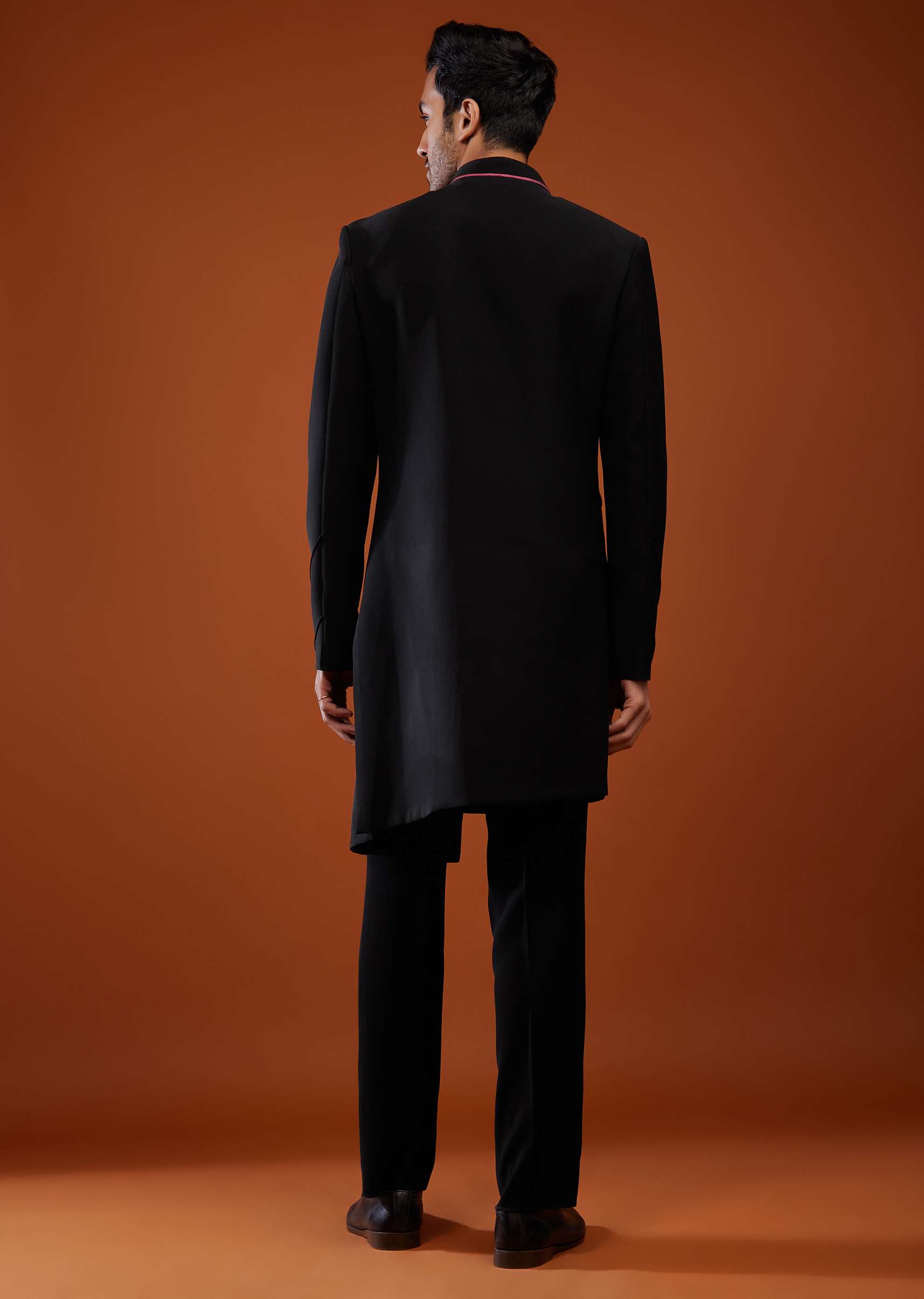 Elegant Black Sherwani Set tailored in imported suiting fabric.The Sherwani comes in intricate floral embroidery buttis highlighted with thread and zari work with a button-down closure.It has round embroidered buttons,... More Product Details
