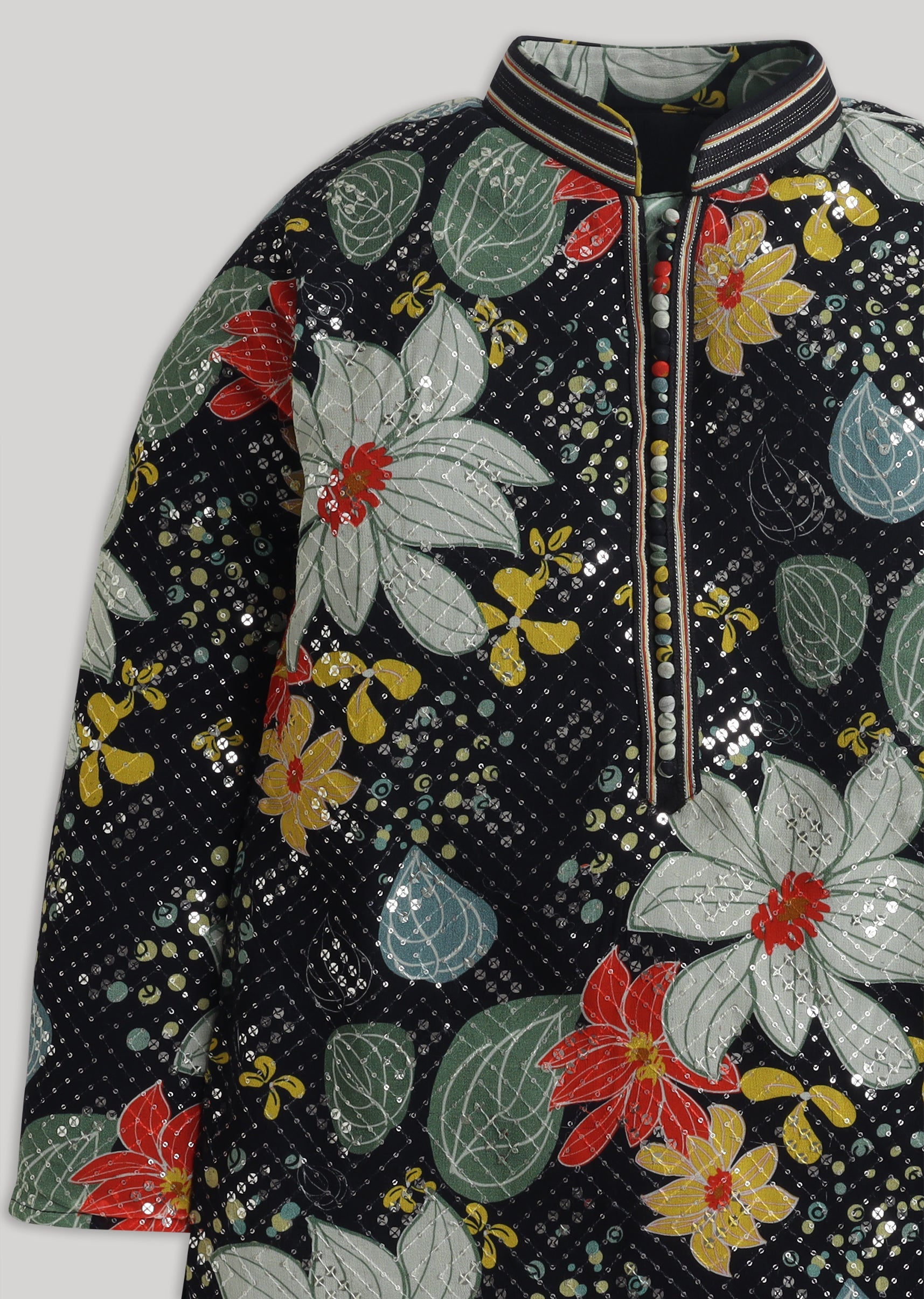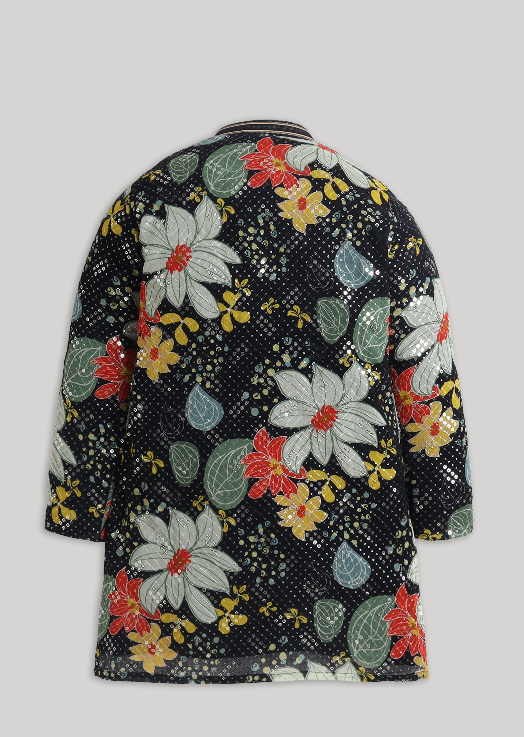 A standout festive ensemble, this black georgette kurta set features a floral-inspired look elevated with shimmering sequin work. Designed with a mandarin collar, full sleeves and front buttons, it comes with a matching bottomperfect for wedding festivities and evening celebrations. Awarded as the Most Trusted Brand, we're delivering styles you love, just as promised.
