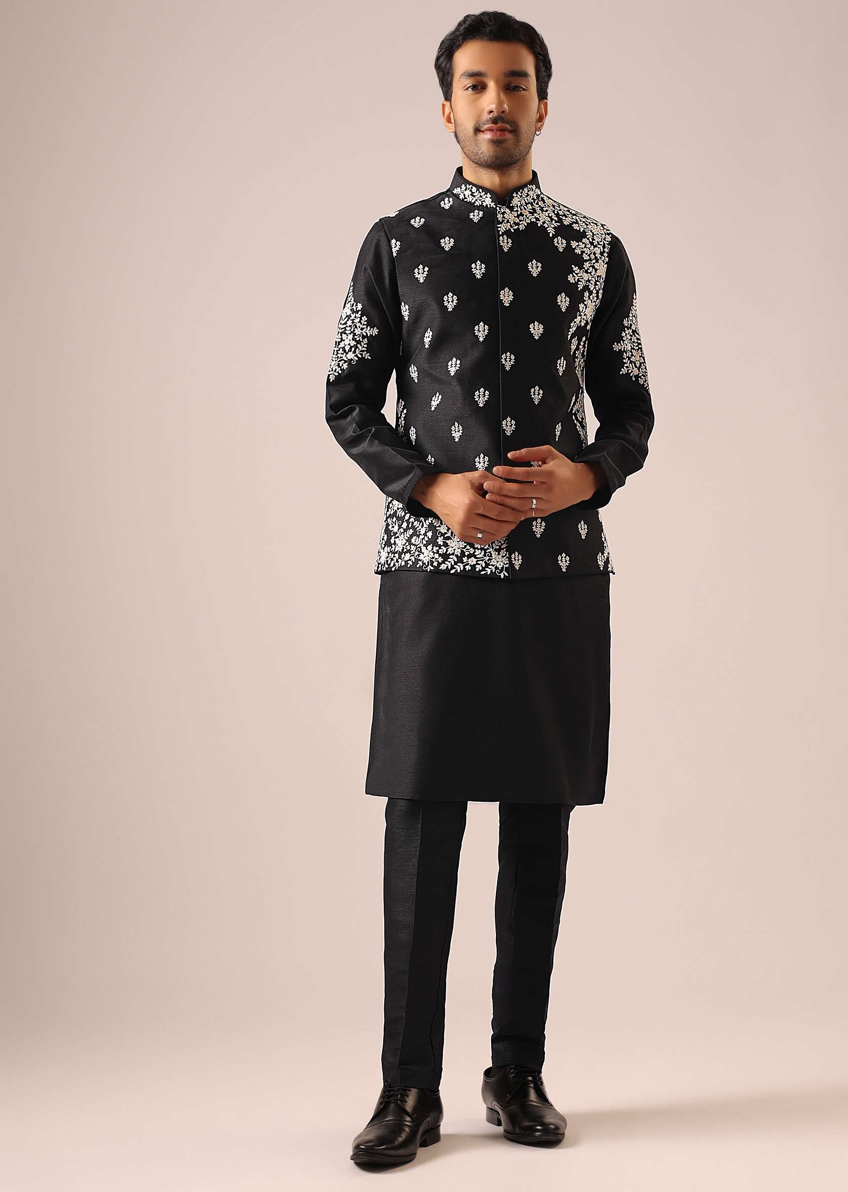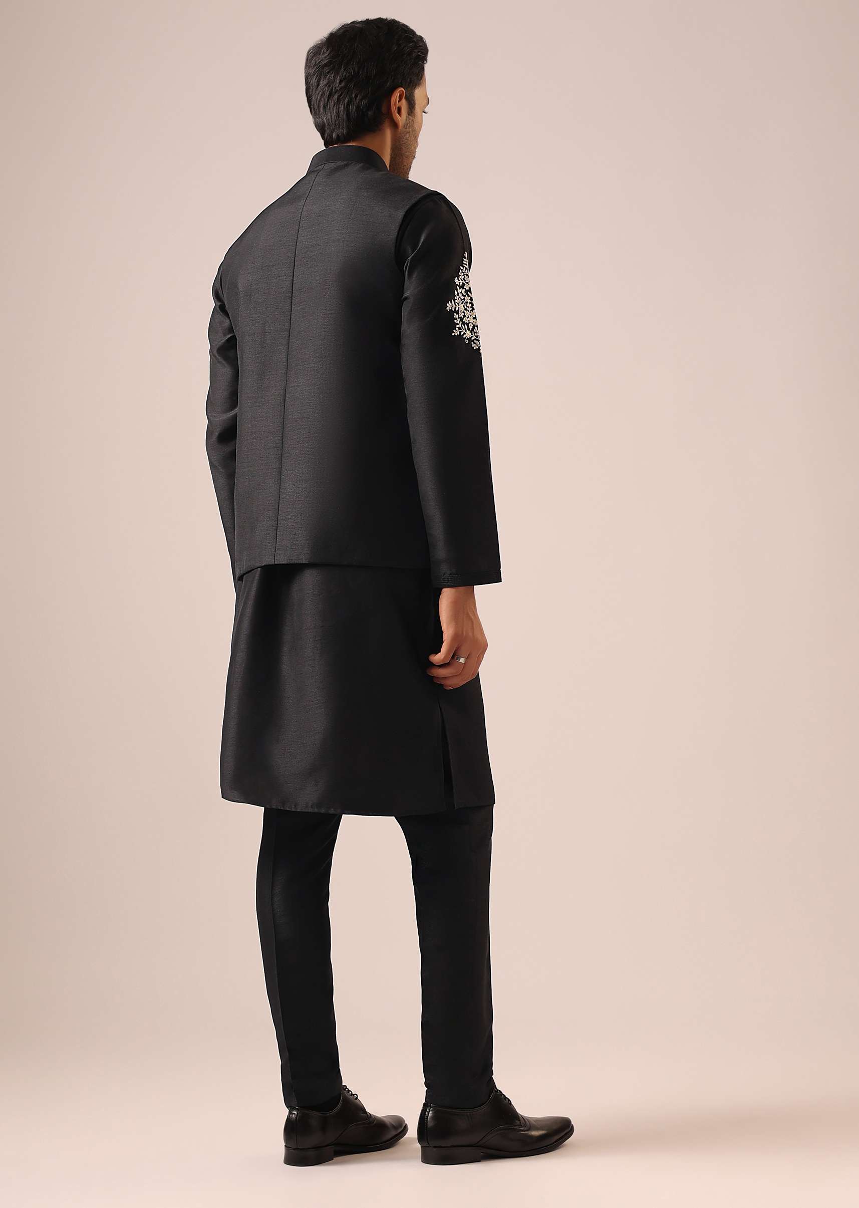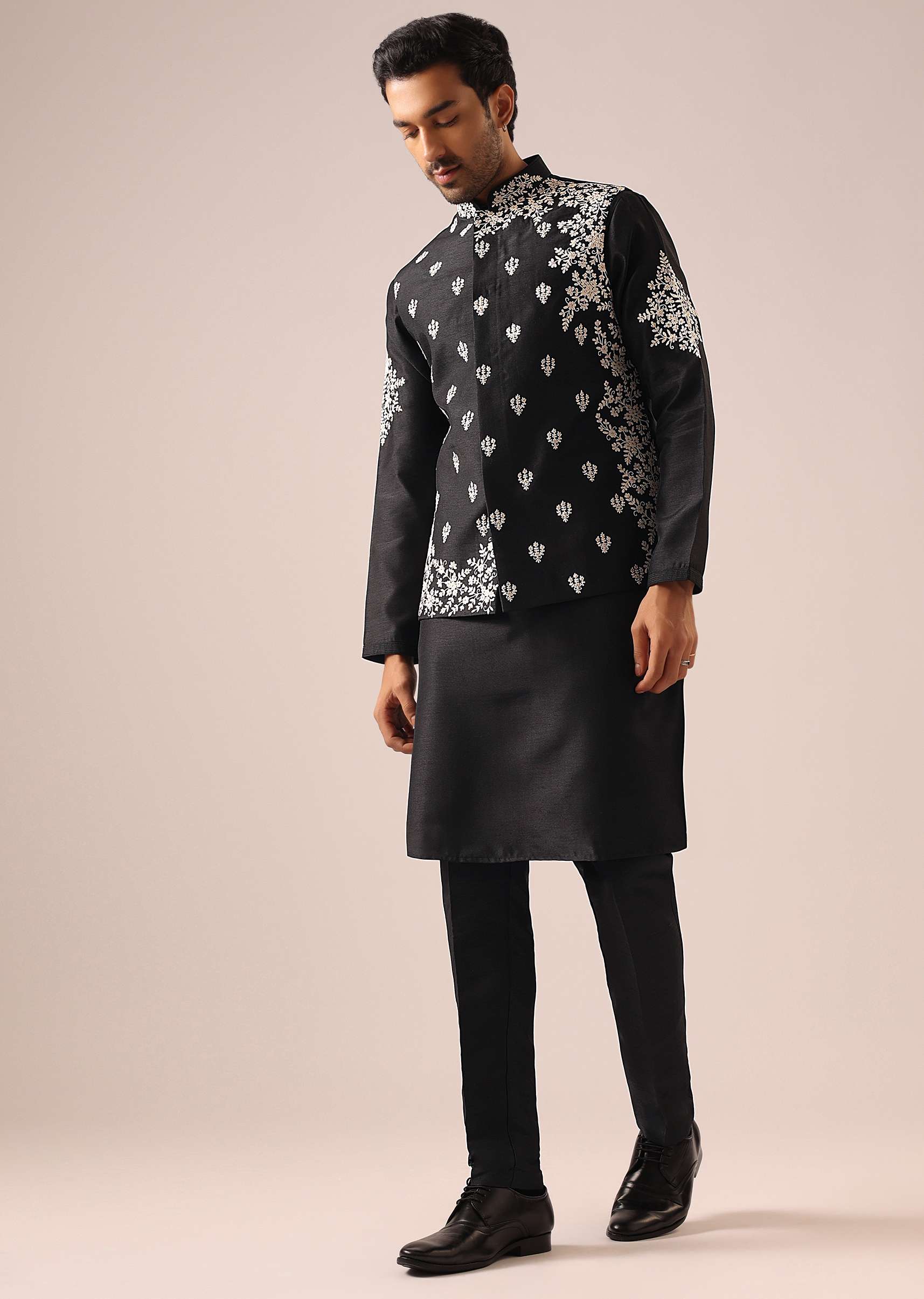 An ideal balance of modernity and traditions this threepiece set will help exude a sharp look. The jacket features a Mandarin collar and is adorned with resham embroidery in floral motifs on a cotton silk black hue. Crafted to perfection this ensemble comes with a kurta and pants. Awarded as the Most Trusted Brand, we're delivering styles you love, just as promised.
