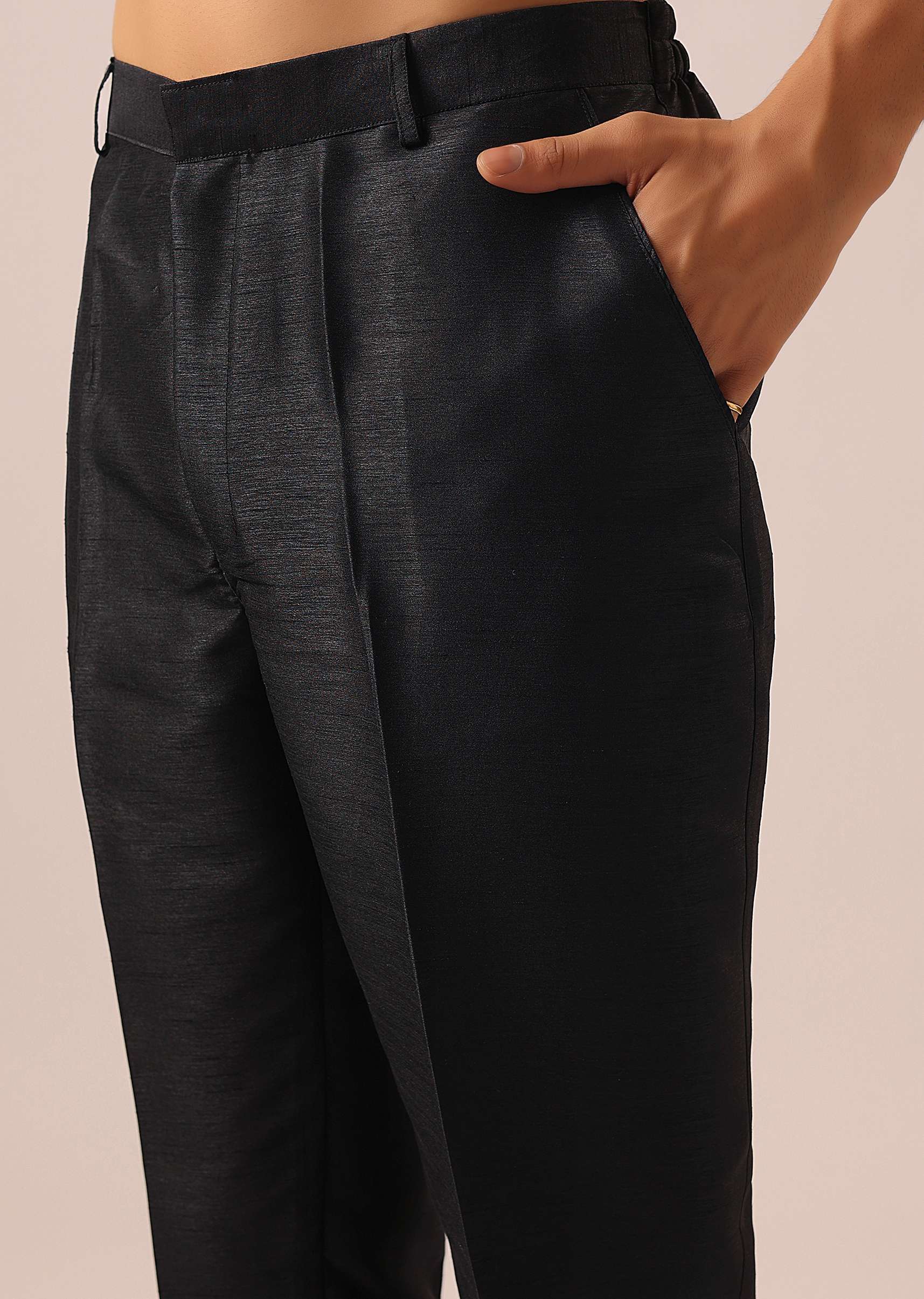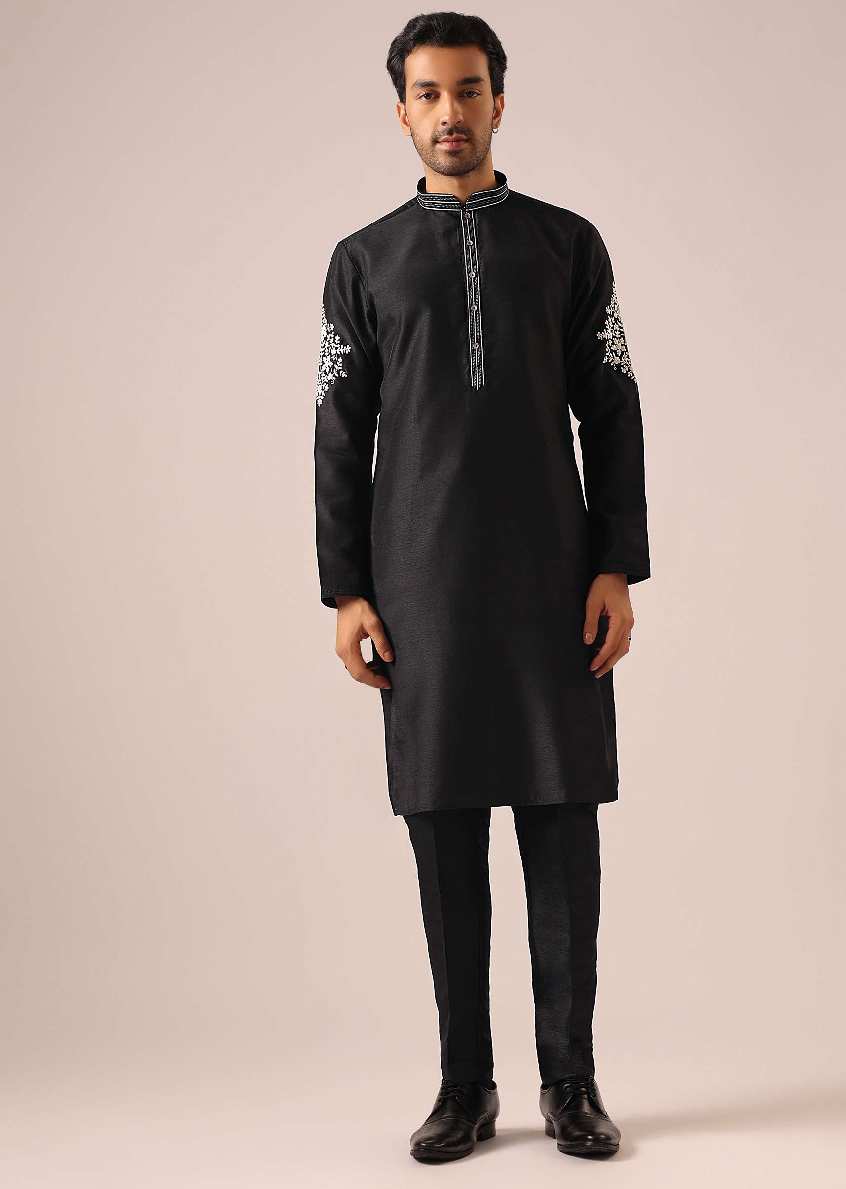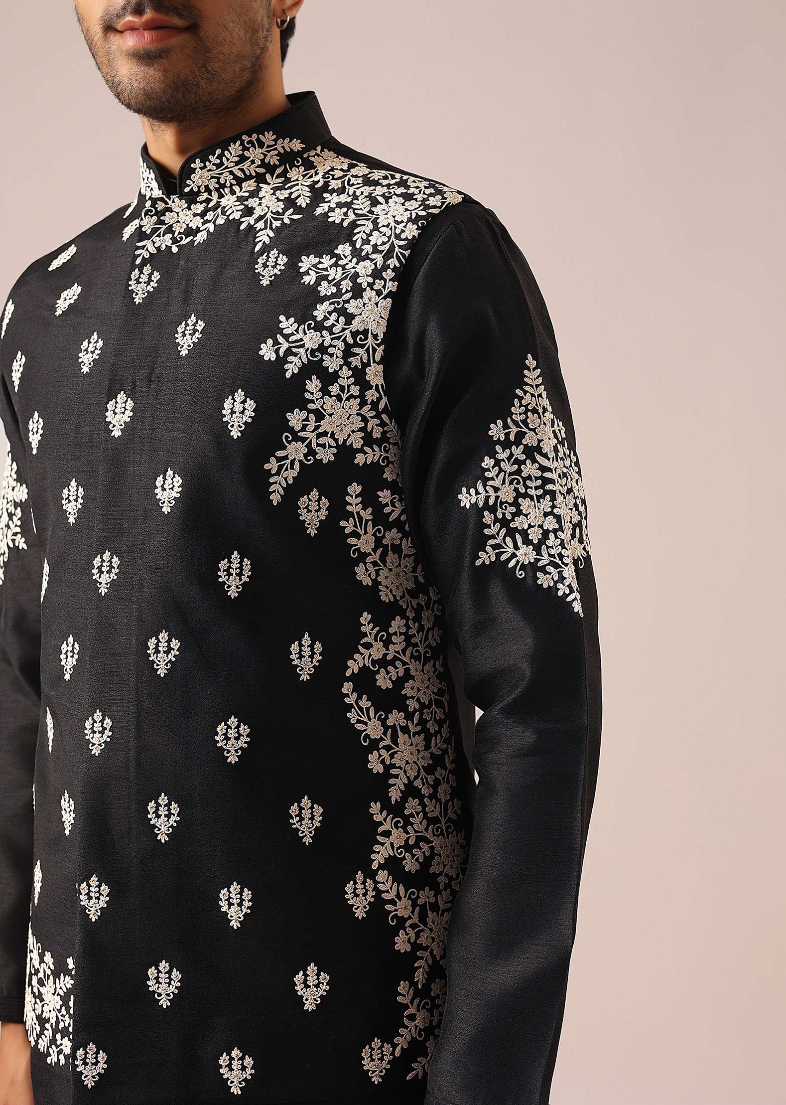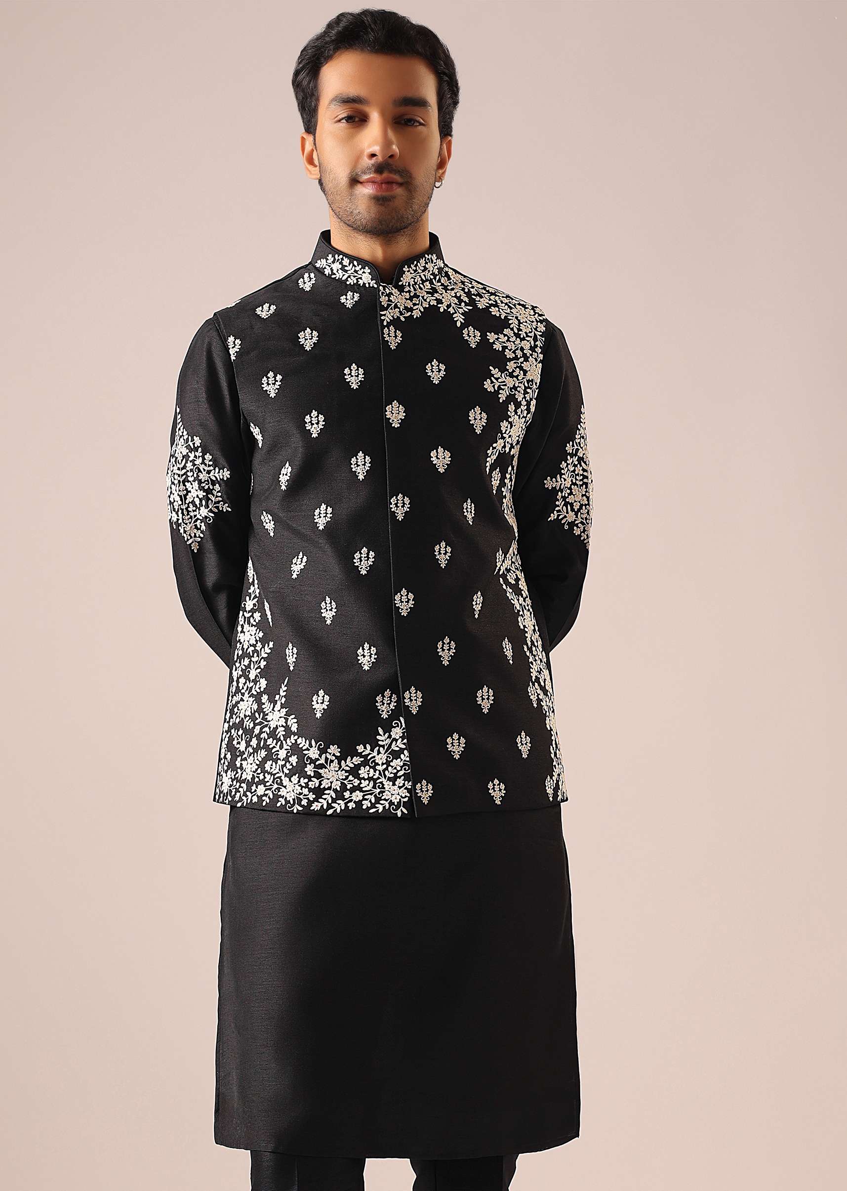 An ideal balance of modernity and traditions this threepiece set will help exude a sharp look. The jacket features a Mandarin collar and is adorned with resham embroidery in floral motifs on a cotton silk black hue. Crafted to perfection this ensemble comes with a kurta and pants. Awarded as the Most Trusted Brand, we're delivering styles you love, just as promised.
