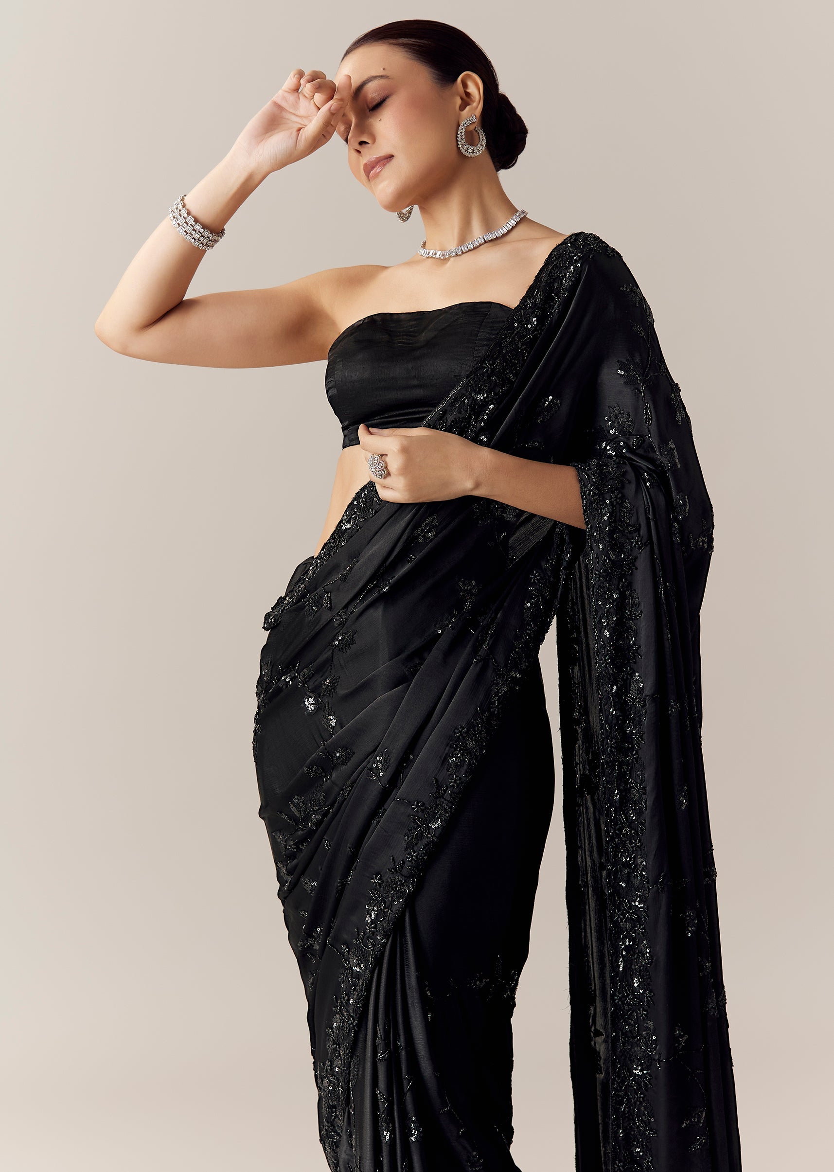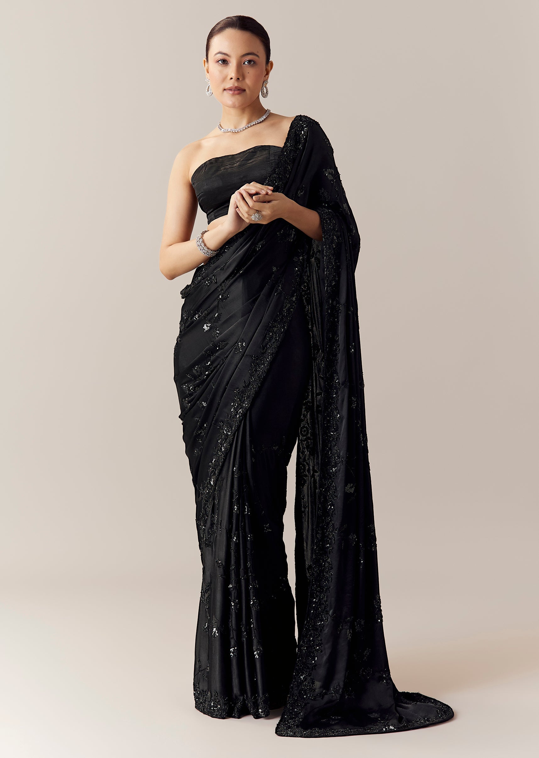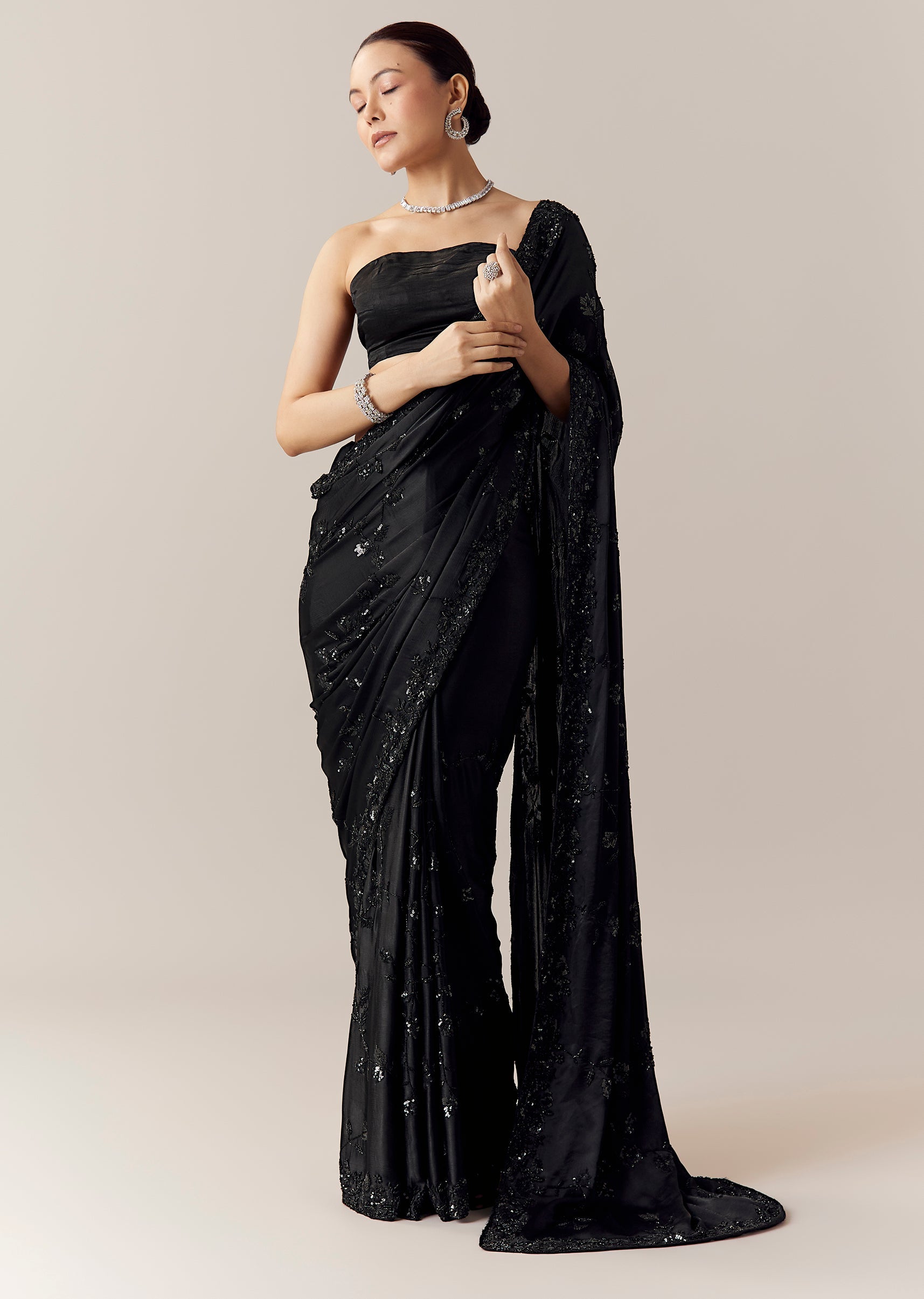 Deep black chinon creates a stunning canvas for this saree, beautifully detailed with all over floral vein embroidery crafted in cut dana, sequins, and beads that add a refined shimmering texture. The soft fluid drape of chinon enhances its graceful movement, making it an elegant choice for evening events, receptions, and festive celebrations. The set includes one saree and one unstitched blouse fabric, allowing for customized styling to complete the look. Awarded as the Most Trusted Brand, we're delivering styles you love, just as promised.