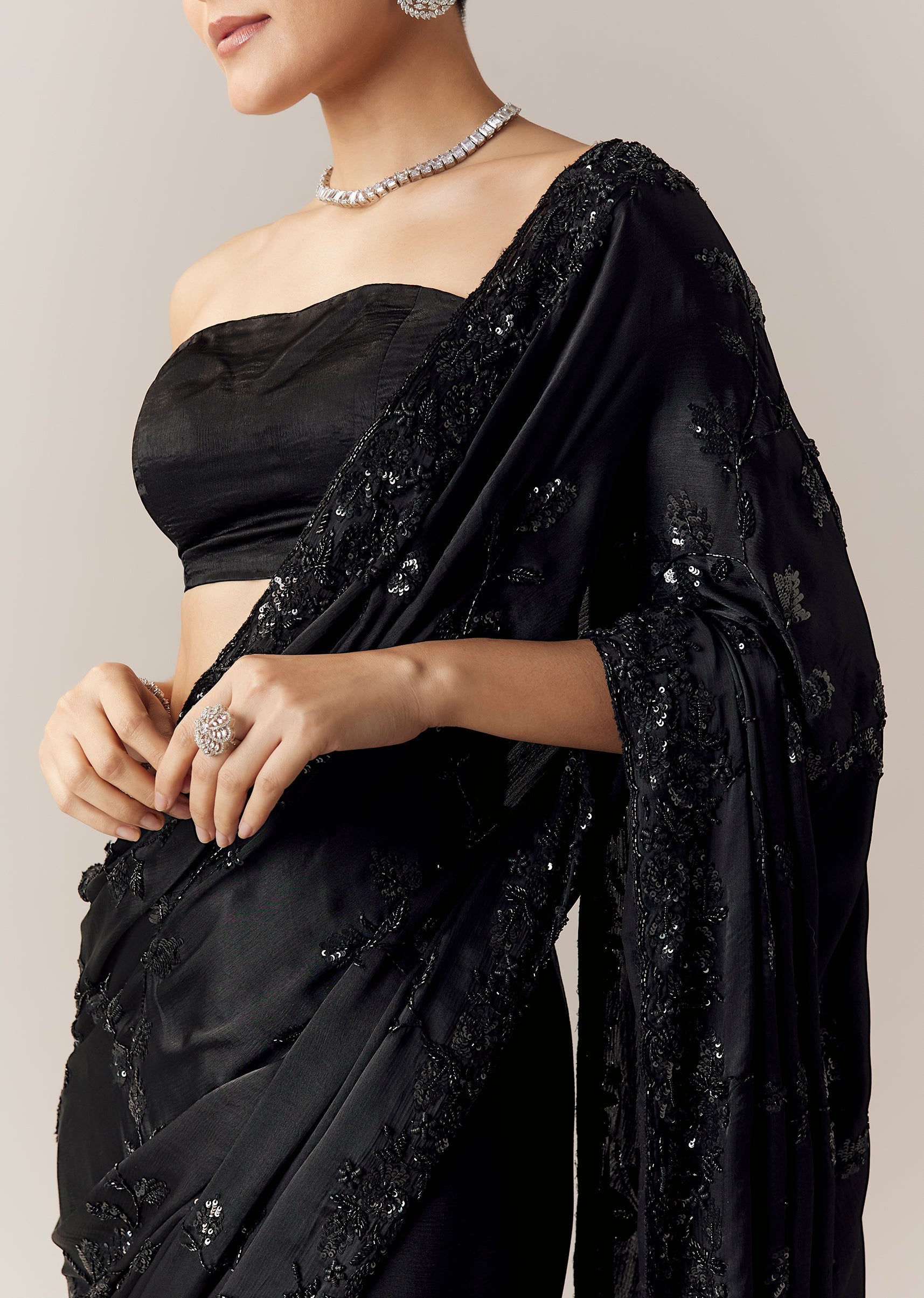Deep black chinon creates a stunning canvas for this saree, beautifully detailed with all over floral vein embroidery crafted in cut dana, sequins, and beads that add a refined shimmering... More Product Details