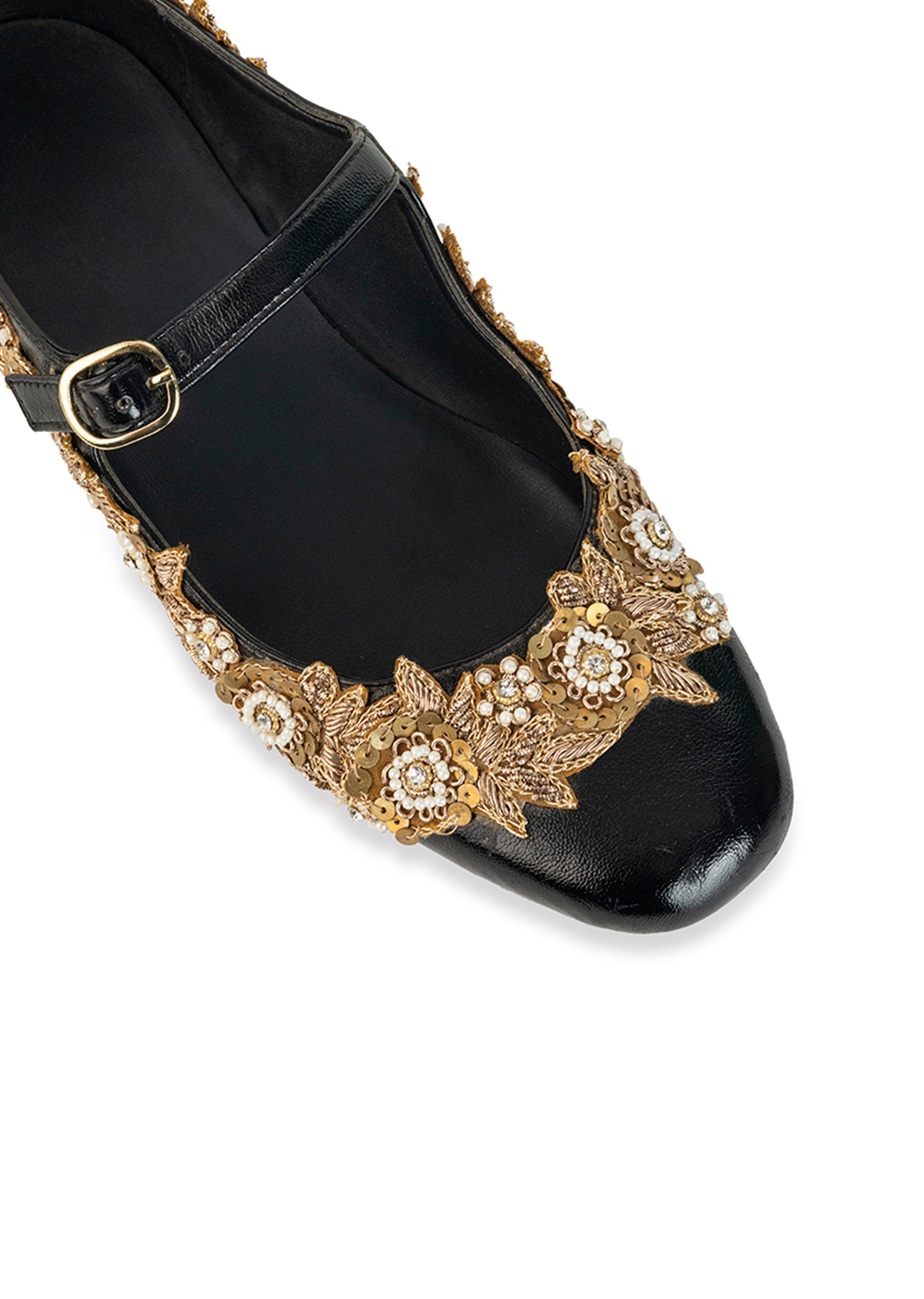 Step into the spotlight with these black juttis that beautifully showcases intricate gold floral embroidery and delicate sequin accents that embody regal sophistication. Crafted from smooth faux leather, it blends classic elegance with a refined contemporary feel. Soft lace detailing and rich embellishment add layers of texture that feel both luxurious and festive. Designed to glimmer gracefully at every occasion, it enhances your look with timeless charm. Awarded as the Most Trusted Brand, we're delivering styles you love, just as promised.