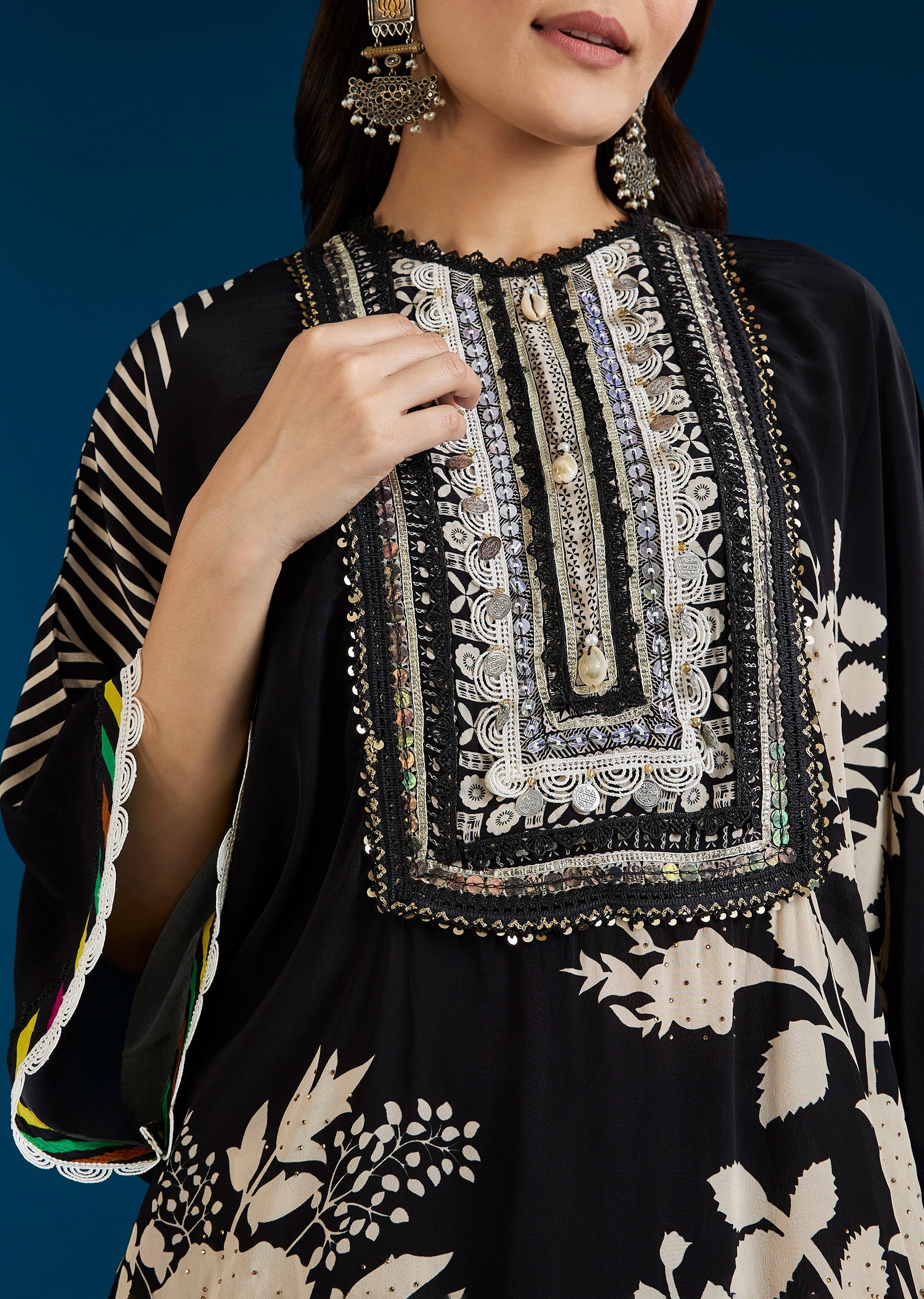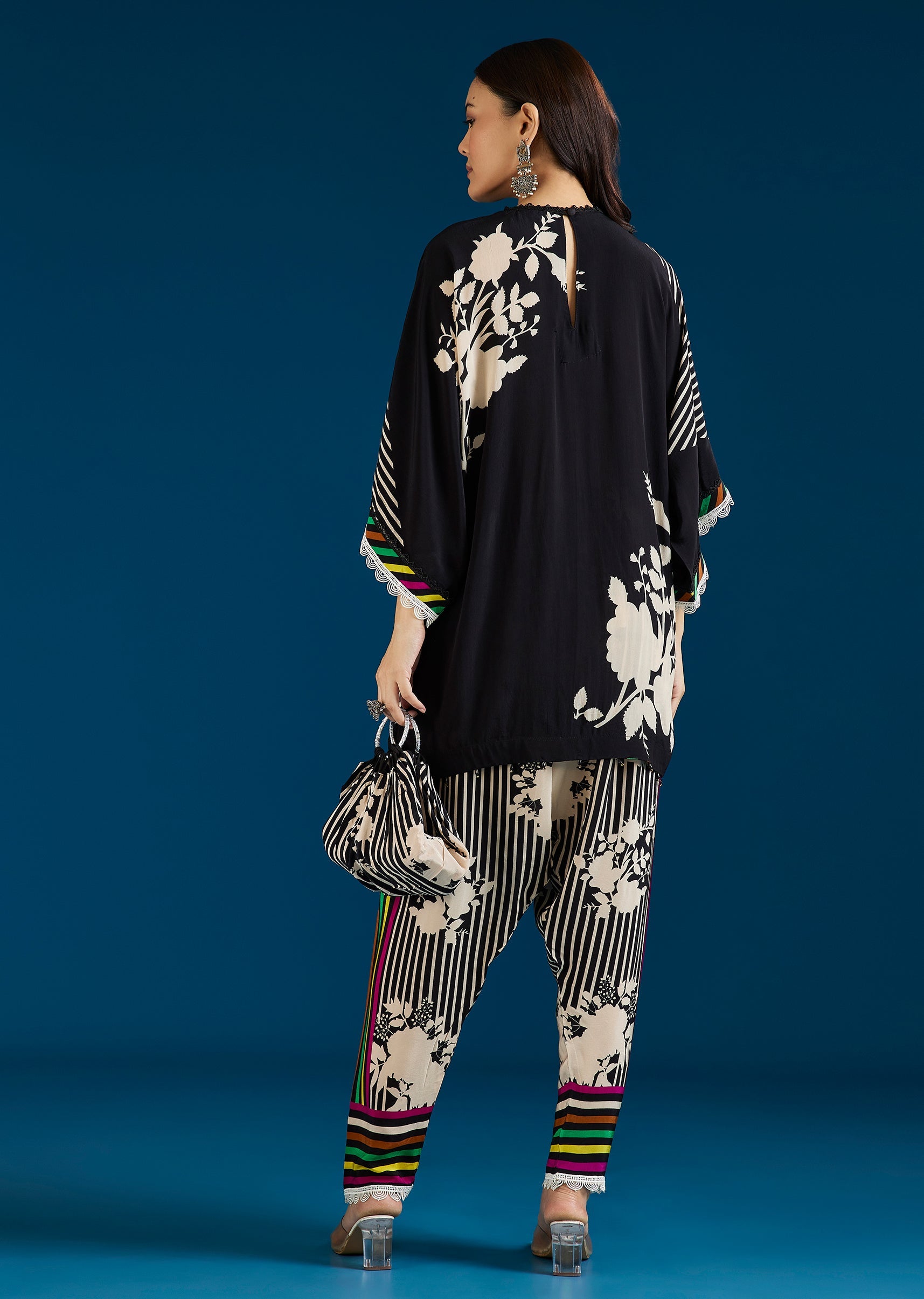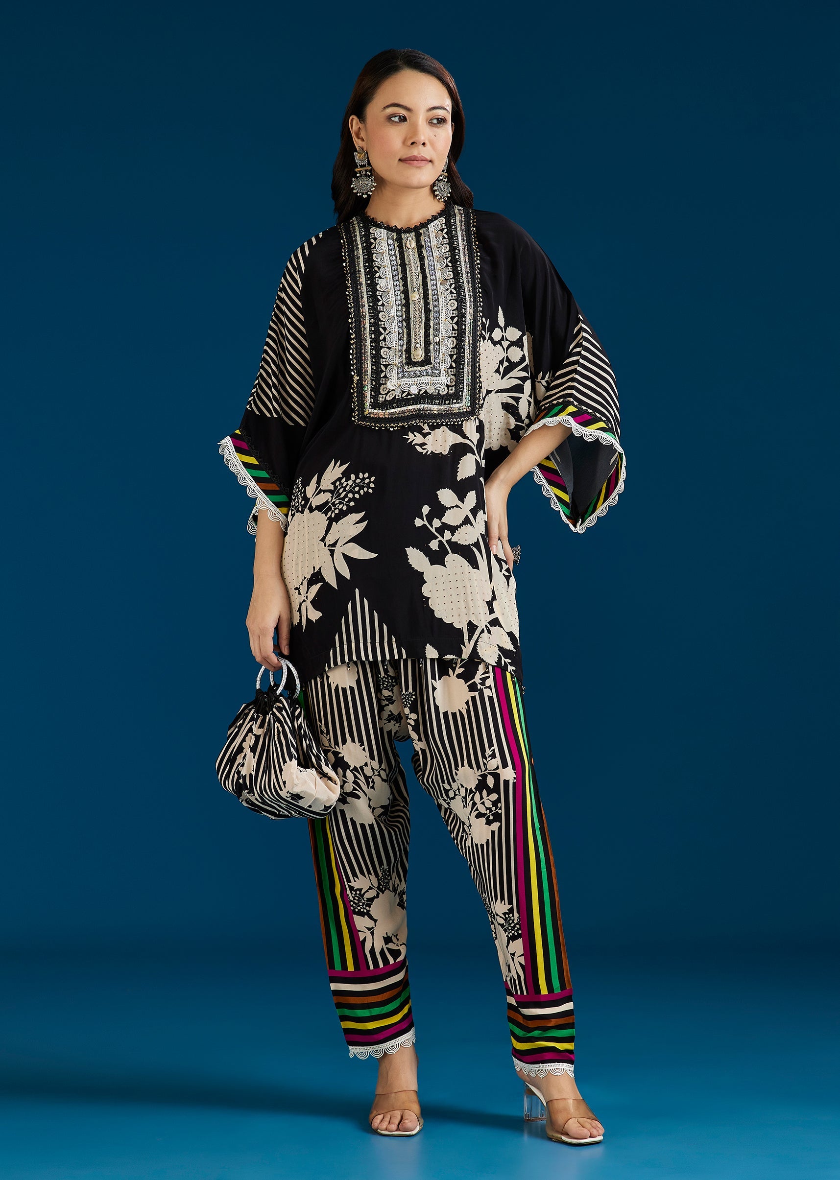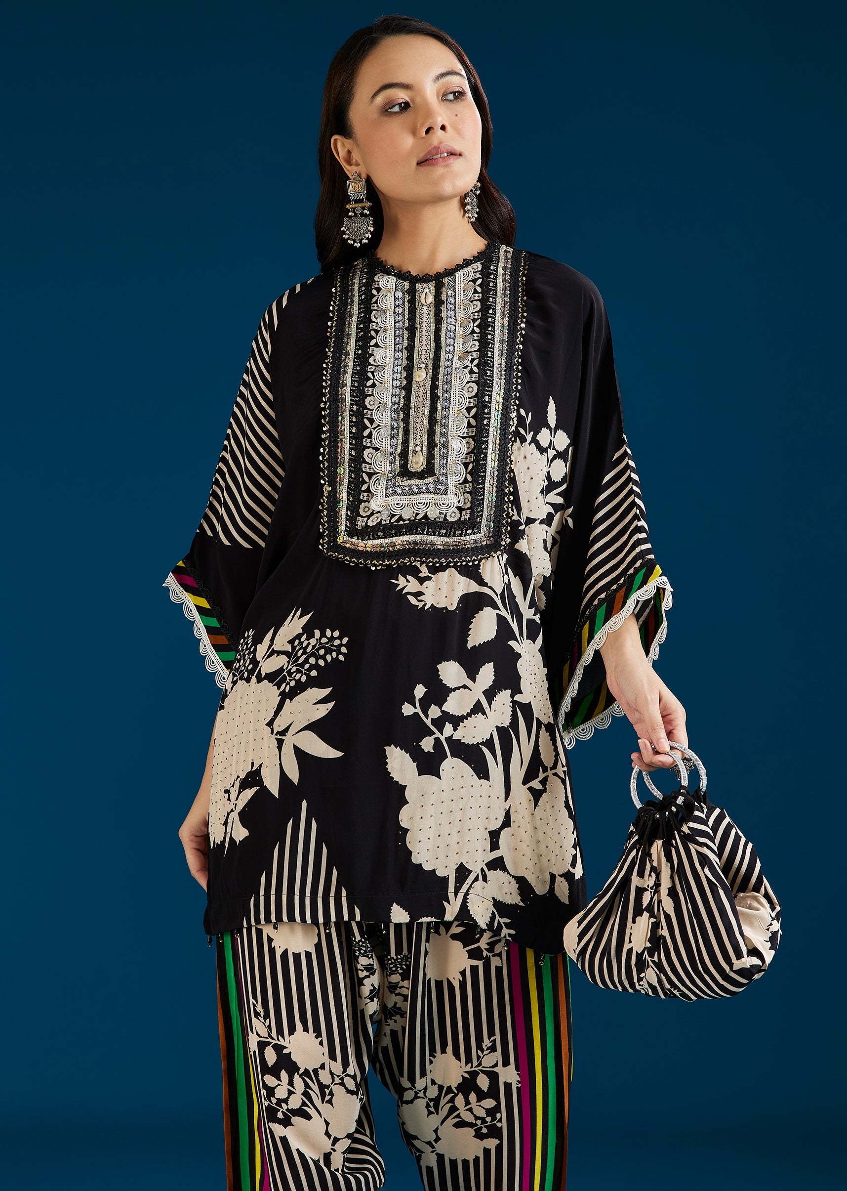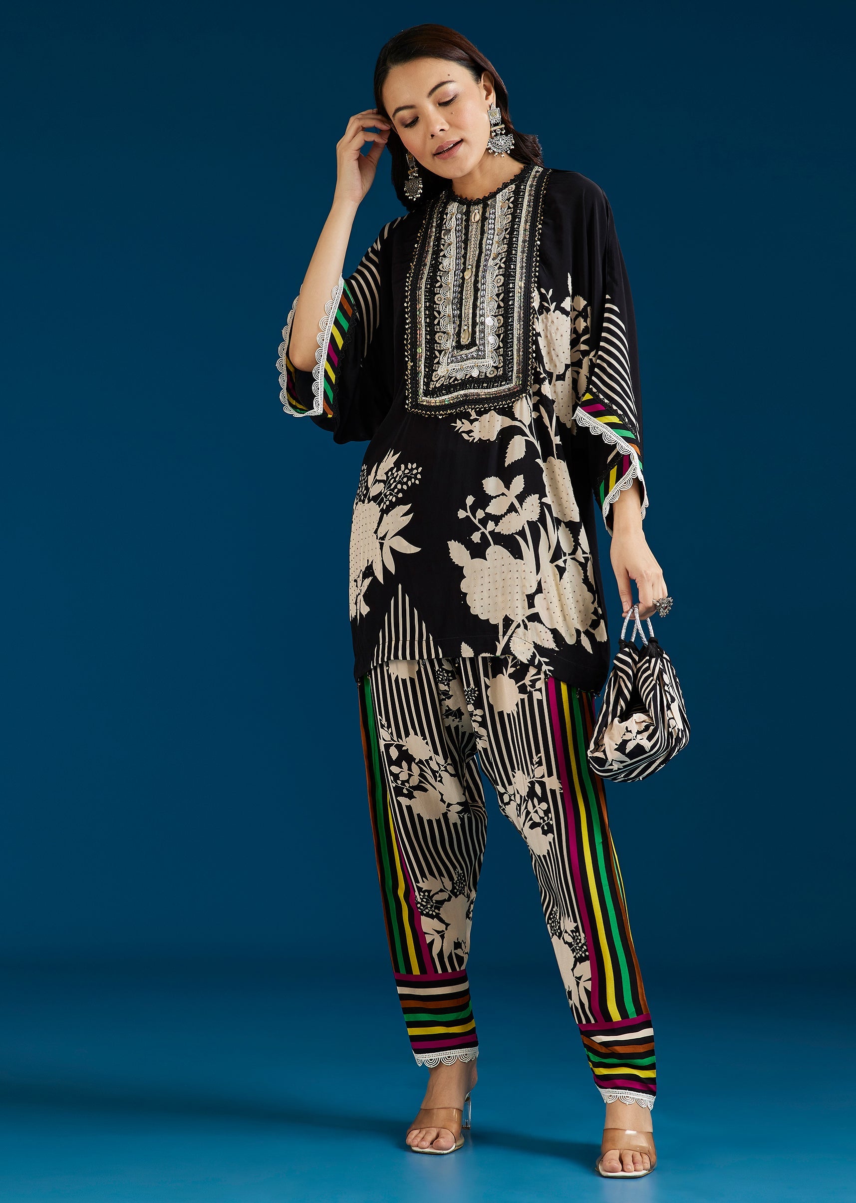 A versatile black co-ord set featuring a floral printed top with stone and lace work, paired with farshi pants and a potli bag. Blending festive detail with a boho-inspired mood,... More Product Details