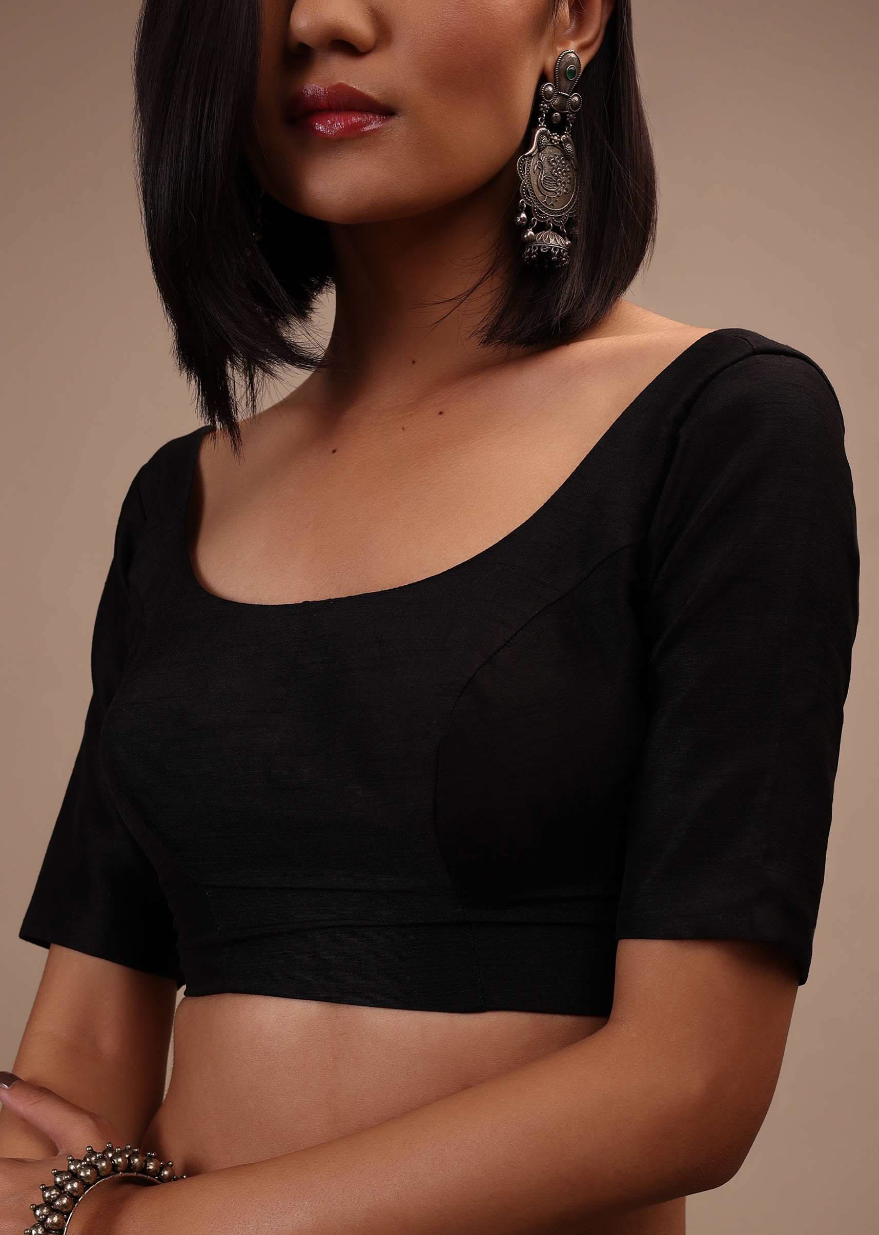 Black half-sleeveless blouse in scallop neckline. Raw silk with back hook closure. Padded with straight hemline. Achieve that boho-chic look with black chandelier earrings and team it up with a... More Product Details