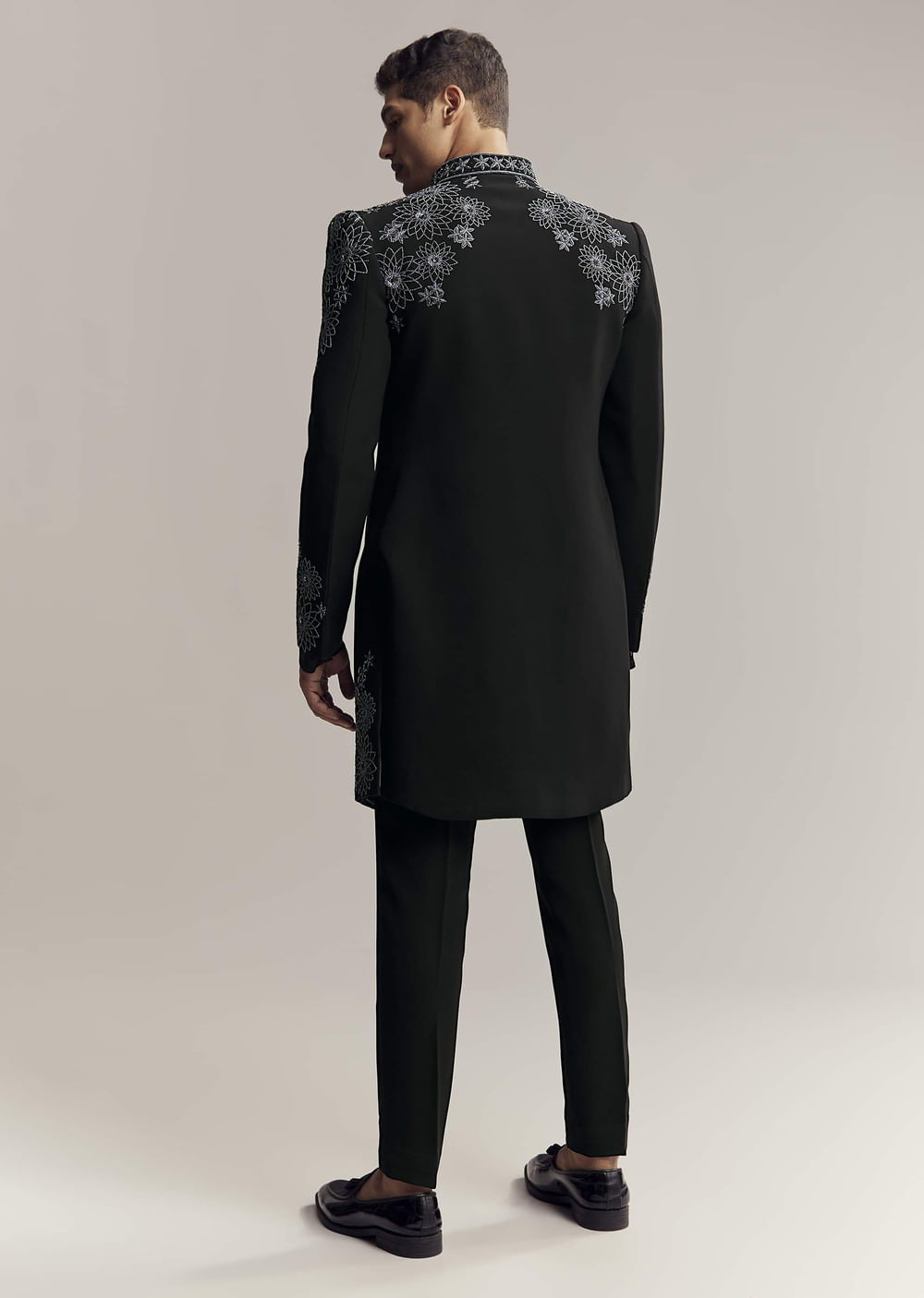 Black Imported Satin Organza Indo Western For Men With Zardosi Embroidery