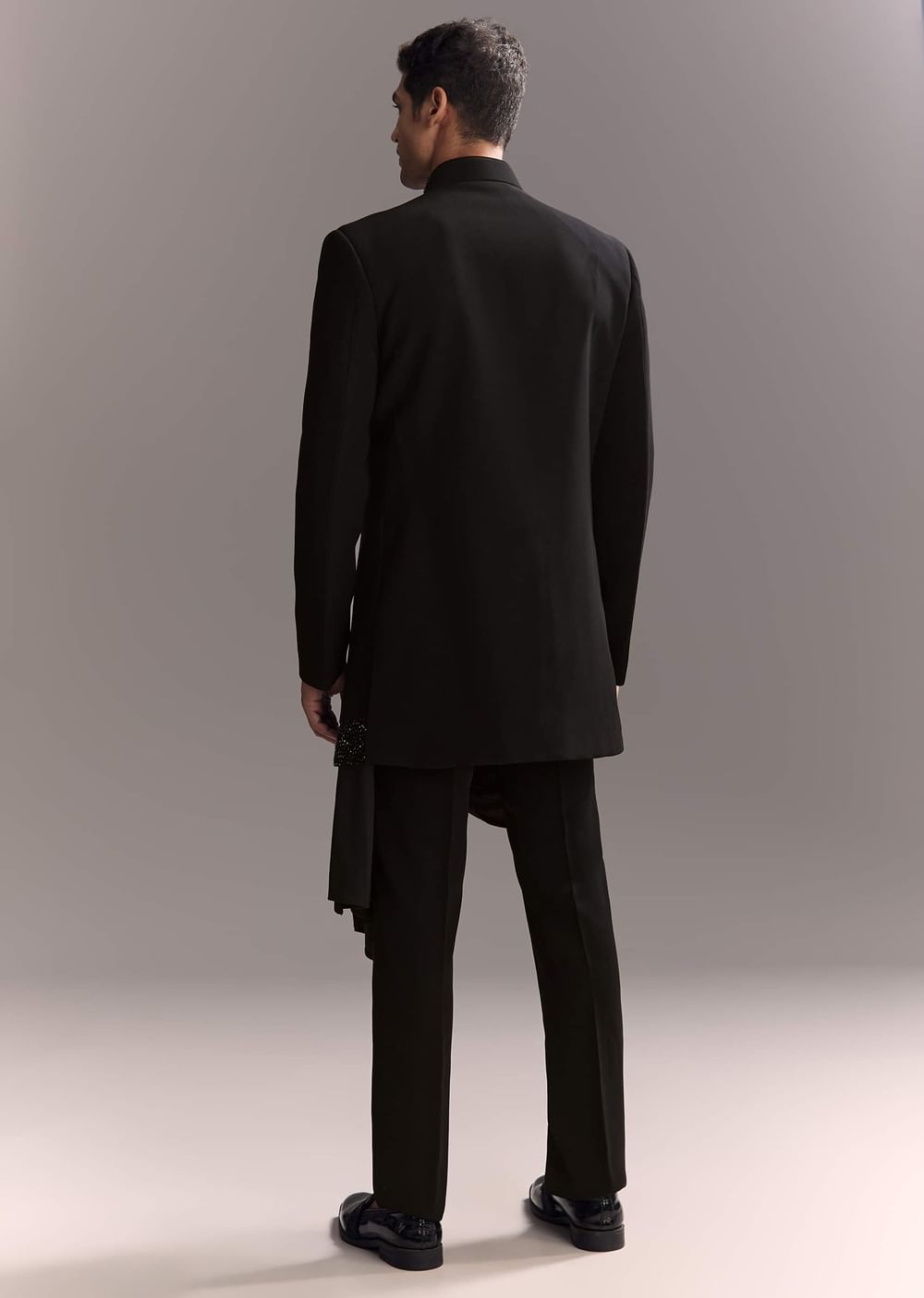 Built for high-energy stages, this black indo western set in suiting fabric combines cut work, moti, and stone embroidery for crisp texture against a dark base. The detailing reads luxe... More Product Details