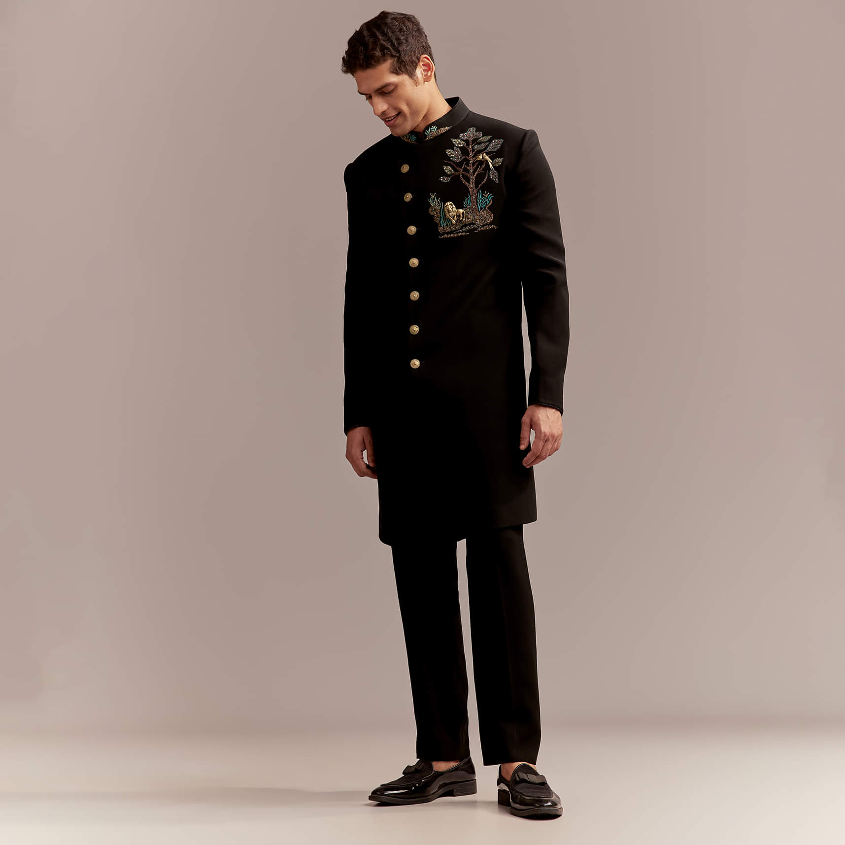 Black Indo Western Set For Men With Nawabi Brooch And Embroidery