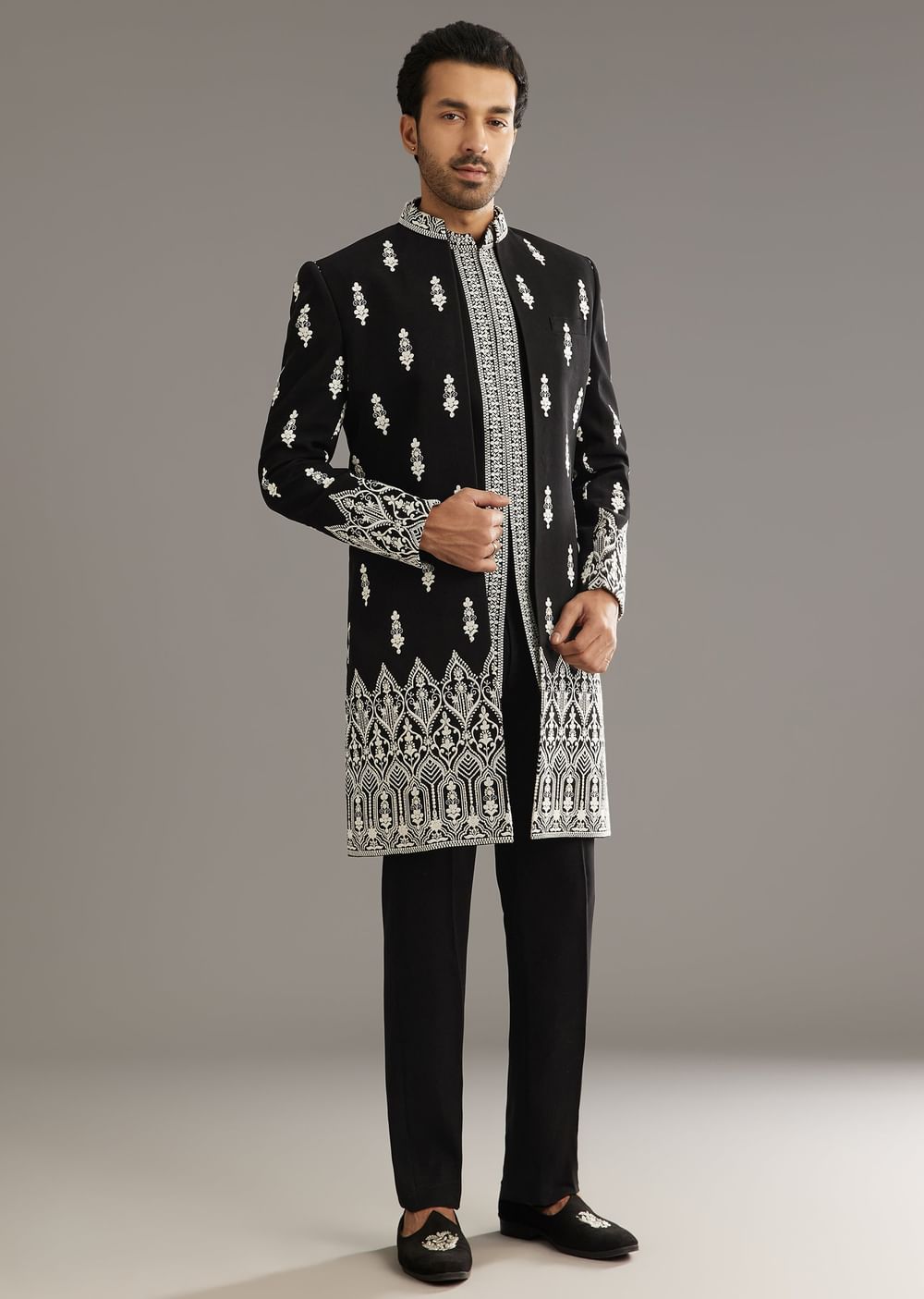 A striking black Indo Western set in Japanese fabric, elevated with detailed embroidery and a structured silhouette perfect for receptions or evening festivities. Awarded as the Most Trusted Brand, we're delivering styles you love, just as promised.