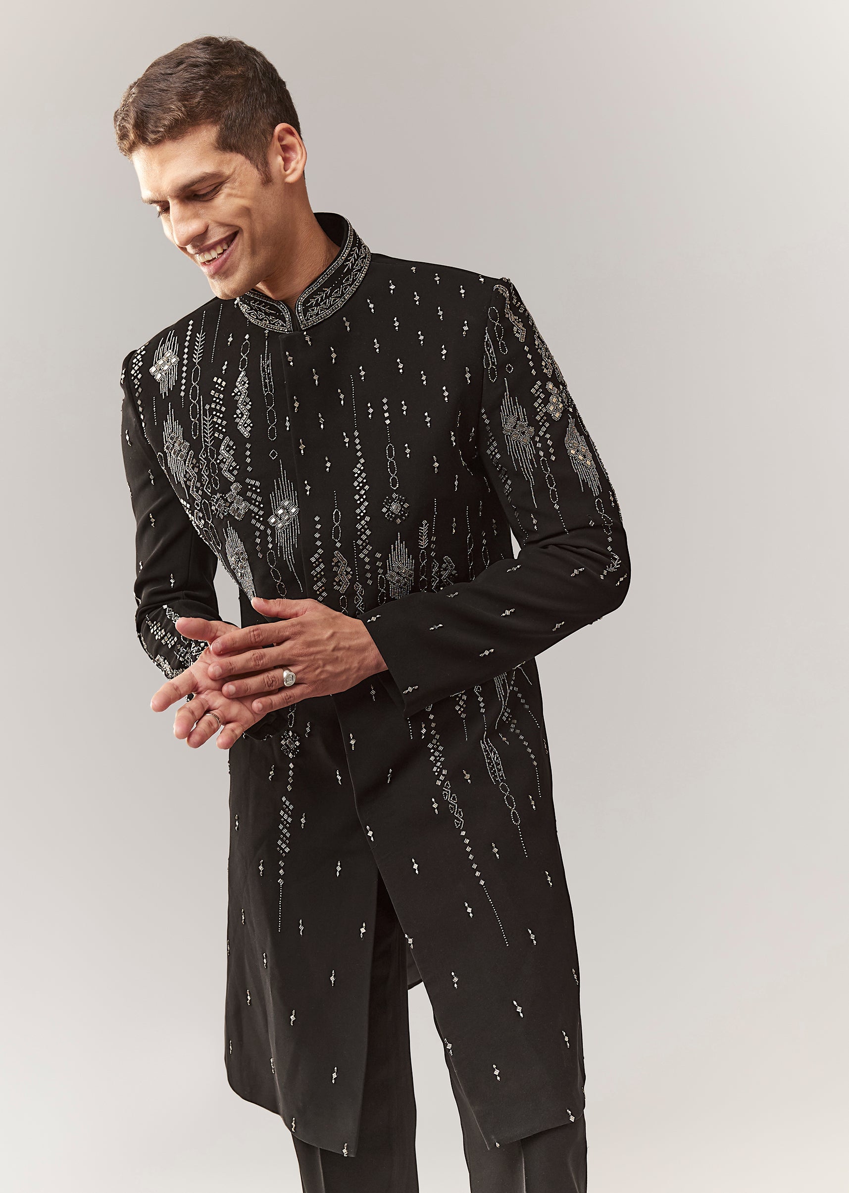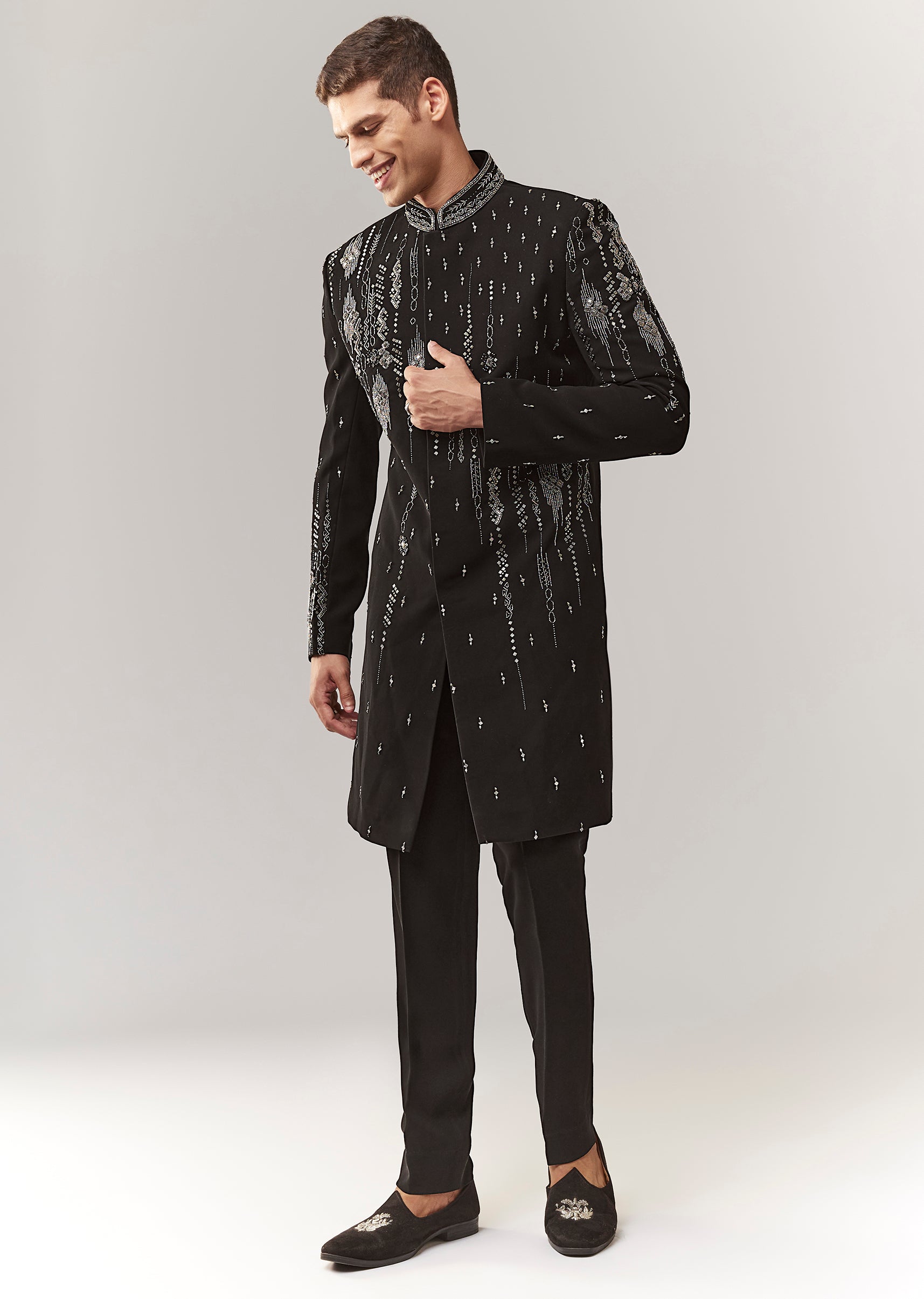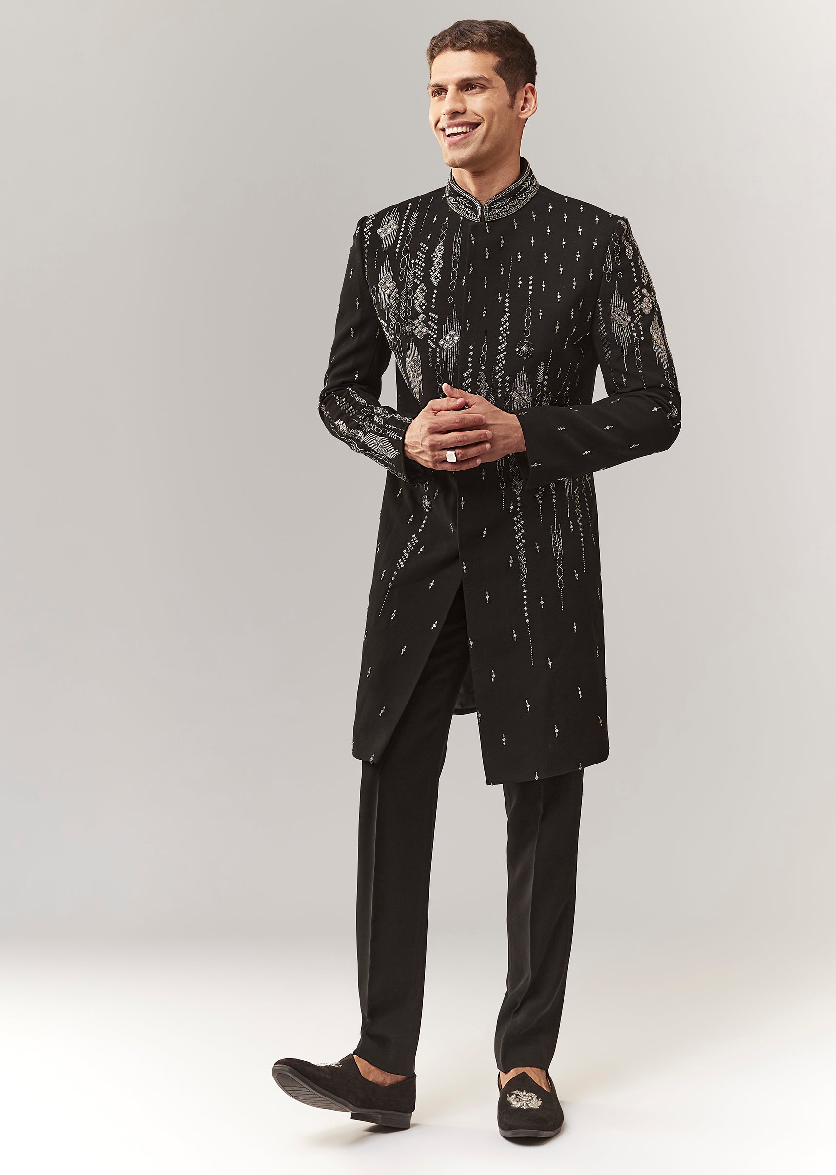 A contemporary black indo-western set in polyester with thread/resham, bead, and cutdana detailing. Mandarin collar, full sleeves, and front hook-eye closure with button detailing. Includes sherwani-style top and straight pants (mid-waist). Strong groomsman option for sangeet/engagement/reception. Awarded as the Most Trusted Brand, we're delivering styles you love, just as promised.