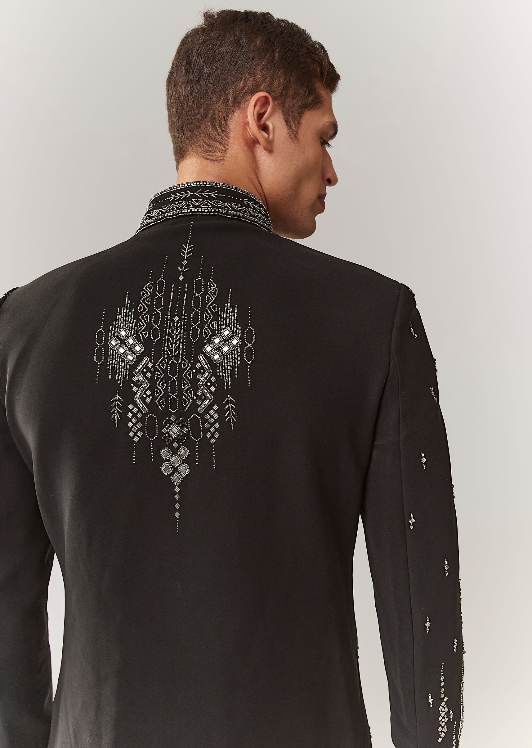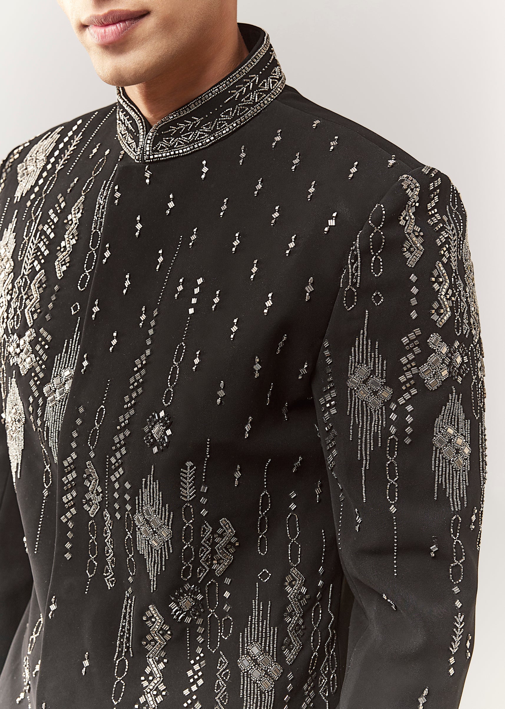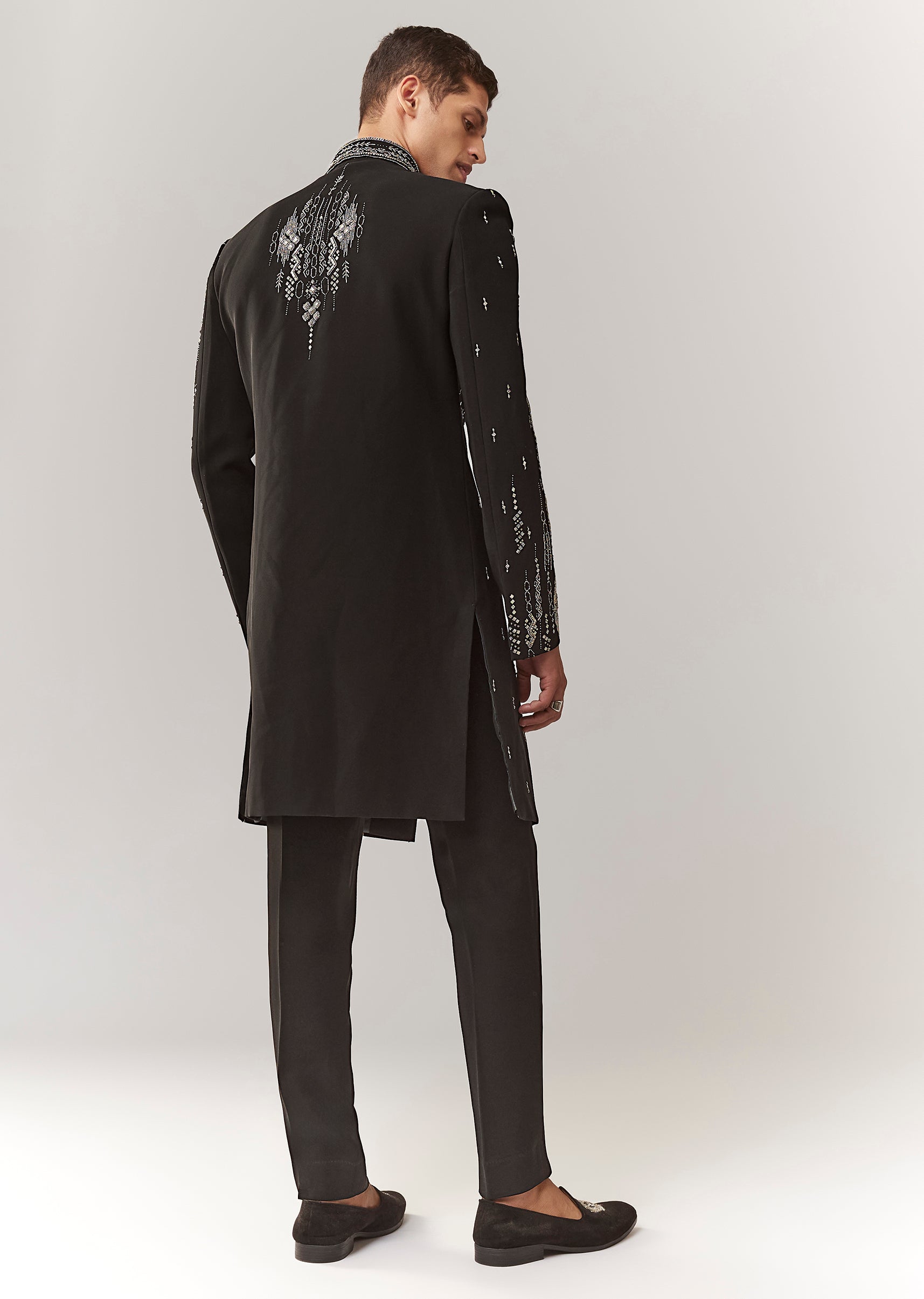 A contemporary black indo-western set in polyester with thread/resham, bead, and cutdana detailing. Mandarin collar, full sleeves, and front hook-eye closure with button detailing. Includes sherwani-style top and straight pants... More Product Details
