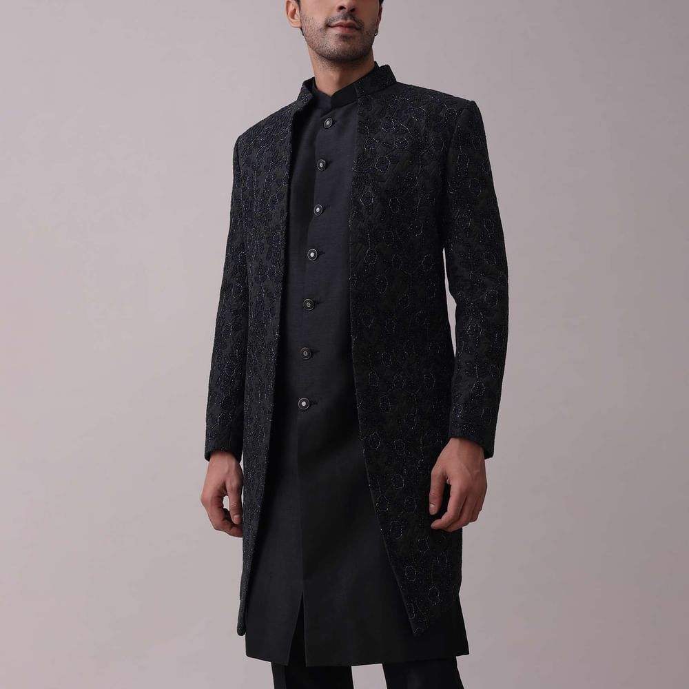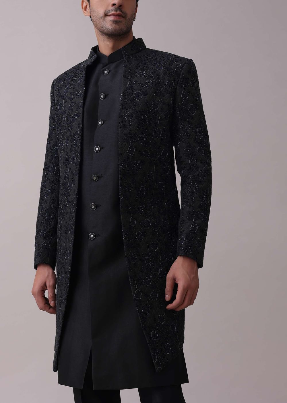 Black Indowestern Achkan Jacket Set In Silk With Moti Embroidery