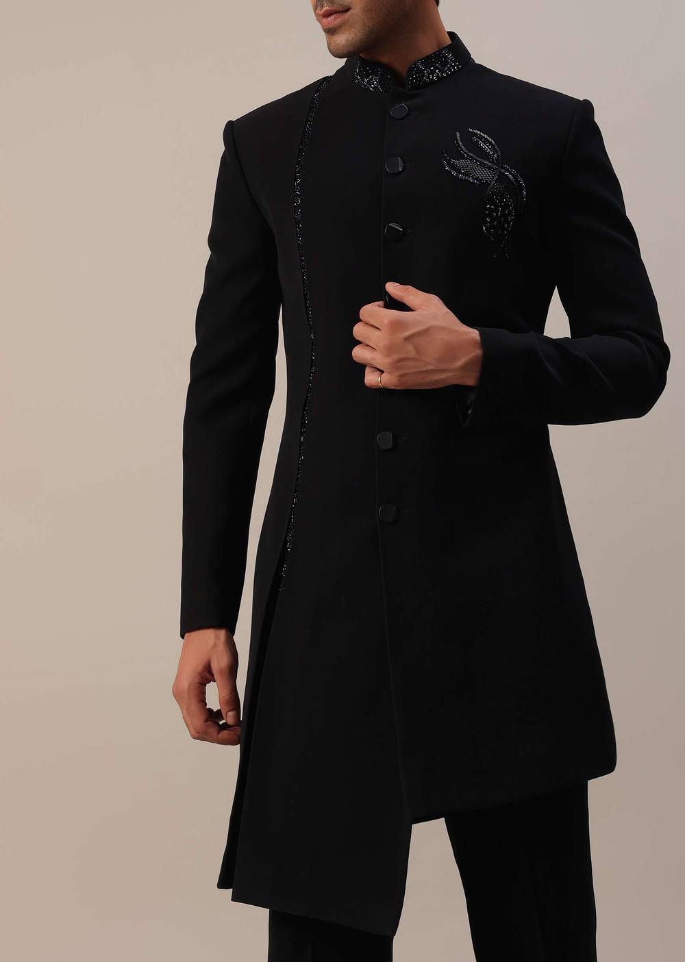 Introducing the epitome of contemporary opulence – the black asymmetrical Indowestern in exquisite suiting fabric. Crafted with meticulous attention to detail, the cutdana embroidery on the sherwani cascades seamlessly from top to bottom, creating a mesmerizing play of light. The collar of the jacket is detailed with perfection. EVENT - Perfect for weddings and special occasions. Change folds regularly. Awarded as the Most Trusted Brand, we're delivering styles you love, just as promised.