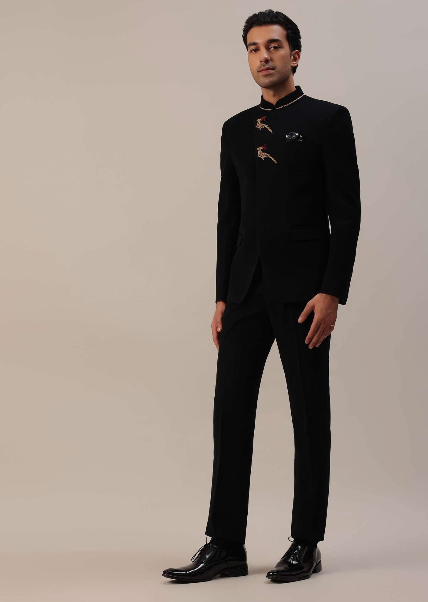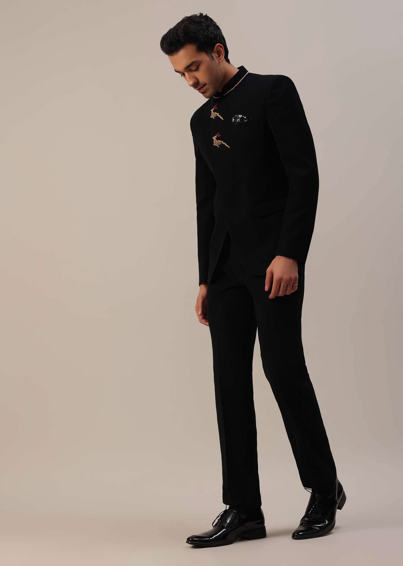 Introducing our black jodhpuri Indowestern in suiting fabric. The Indowestern is adorned with a captivating deer pattern near the yoke, meticulously crafted through detailed threadwork. Paired with the matching trousers,... More Product Details