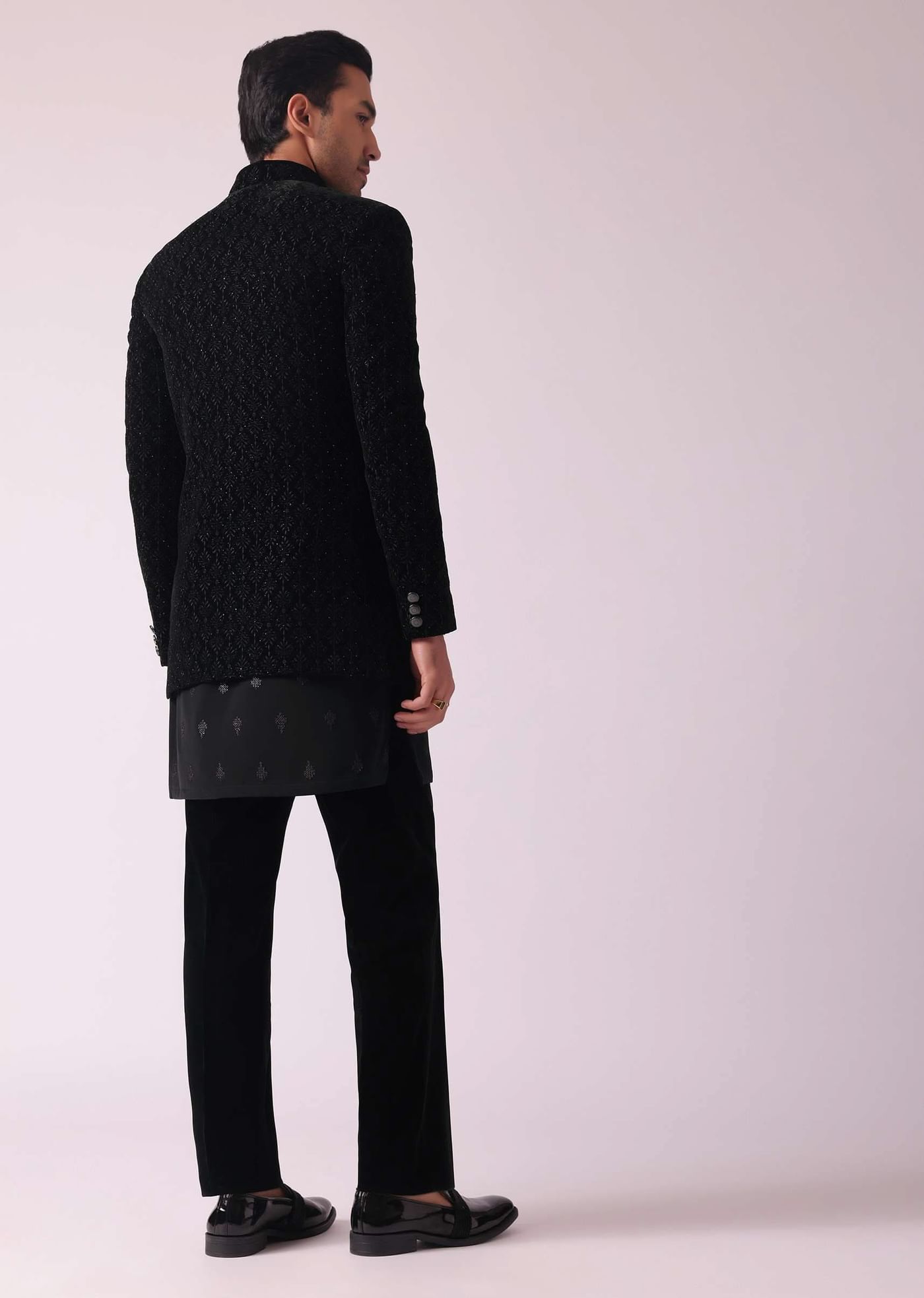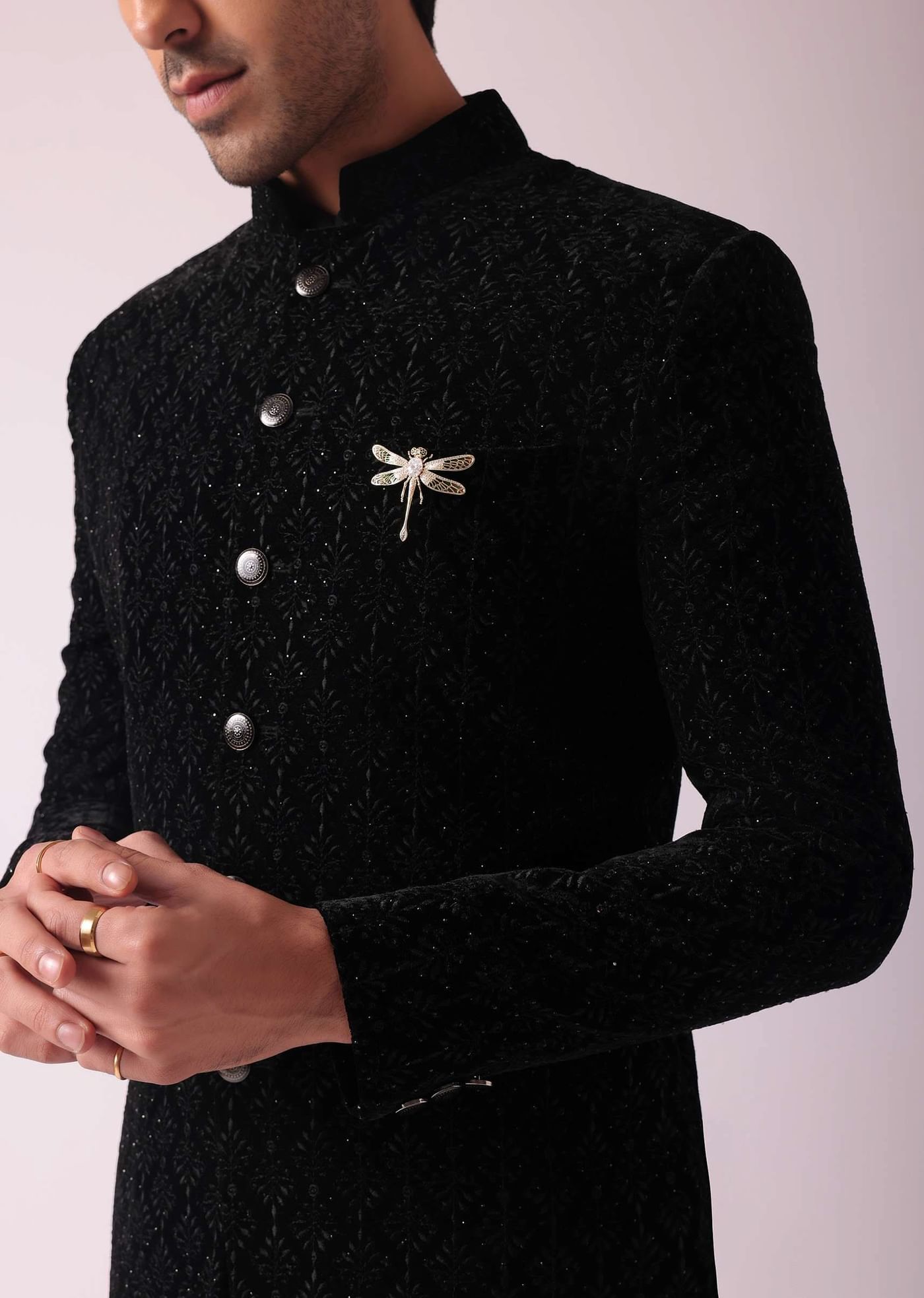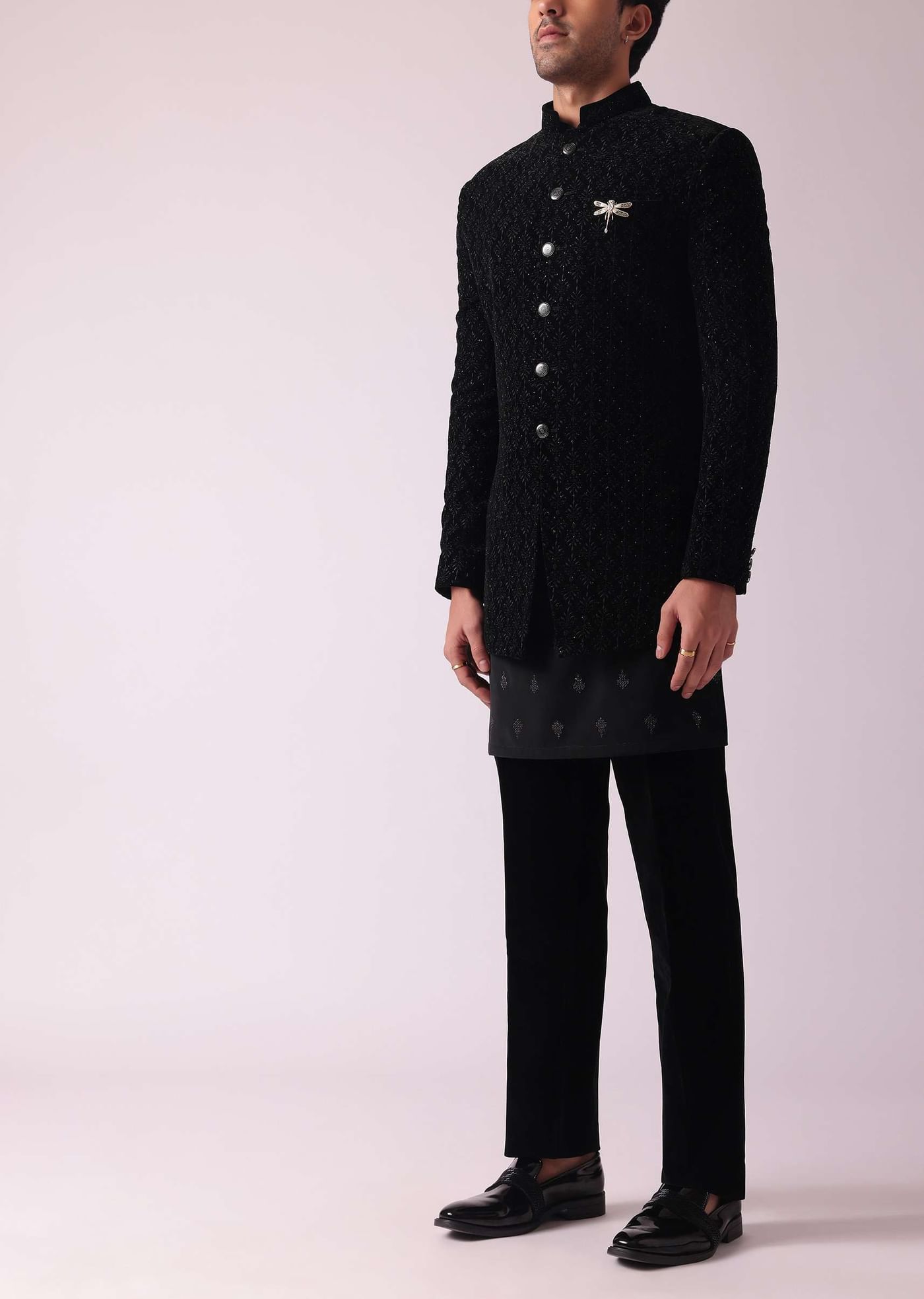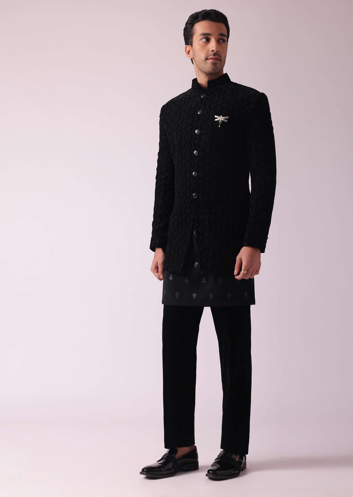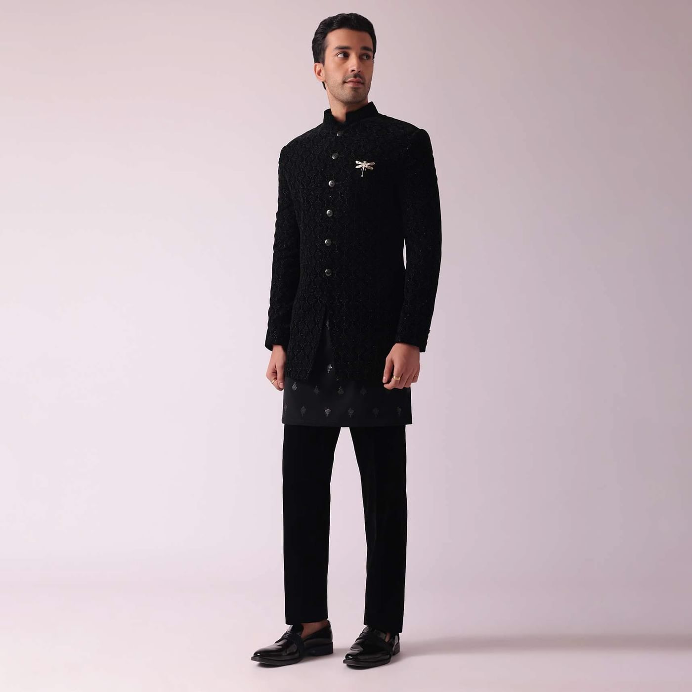 Designed for the modern groom our black indowestern is an ideal blend of traditions and modernity. Crafted from rich velvet fabric it features intricate embroidery in a geometric pattern. EVENT... More Product Details