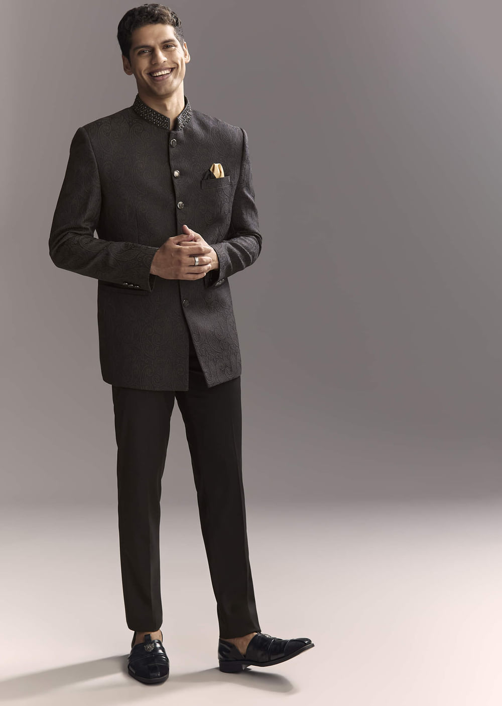 Black Jacquard Jodhpuri Suit For Men With Subtle Paisley Motifs