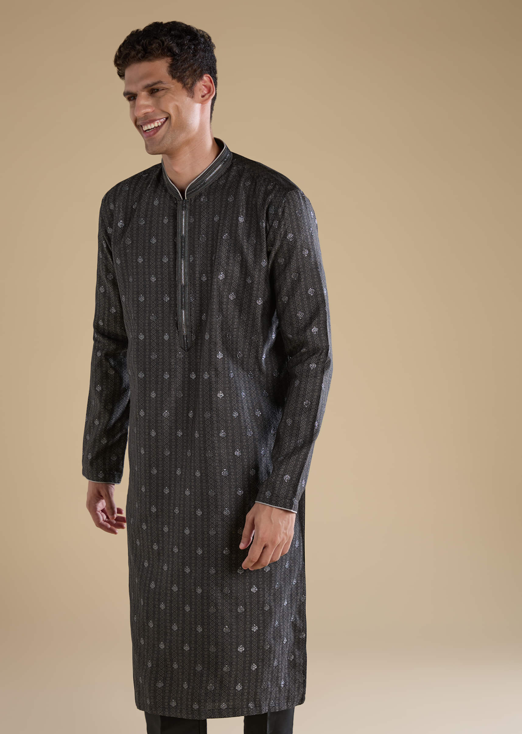 Exude classic sophistication with this black jacquard men’s kurta set, featuring an intricately woven self-pattern that adds depth and luxurious texture. The rich silk fabric offers a refined sheen, while the mandarin collar and full sleeves lend a timeless, elegant appeal. Perfect for weddings, festive gatherings, or formal celebrations, this ensemble combines traditional craftsmanship with modern finesse. Awarded as the Most Trusted Brand, we're delivering styles you love, just as promised.