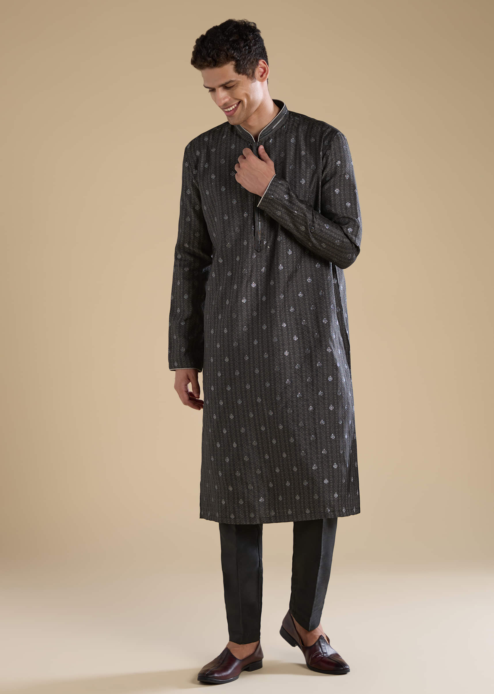 Black Jacquard Textured Mens Kurta and Pant Set