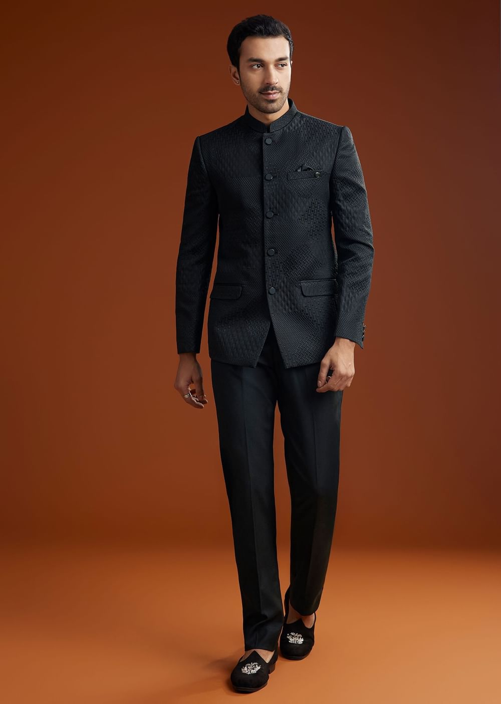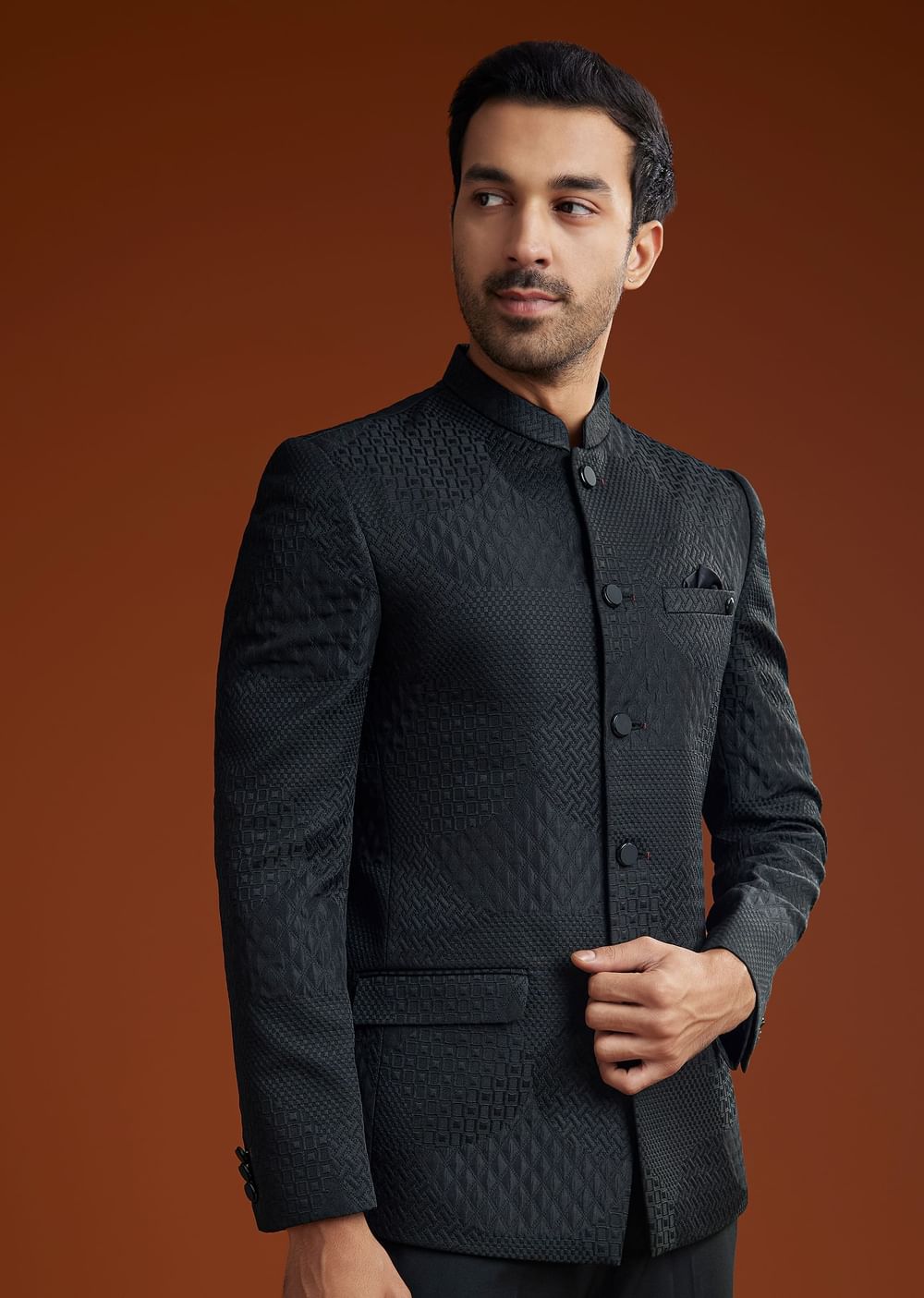 Exude effortless elegance with this black Jodhpuri suit tailored to perfection with a Mandarin collar full sleeves and front button closure. Complete with a pocket square this set is ideal for formal gatherings.Awarded as the Most Trusted Brand we're delivering styles you love just as promised.