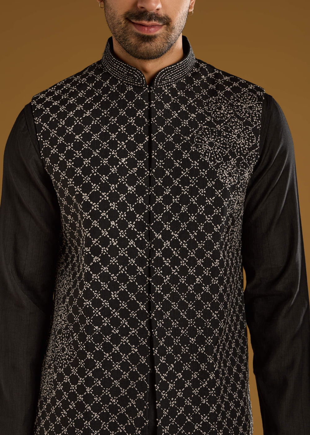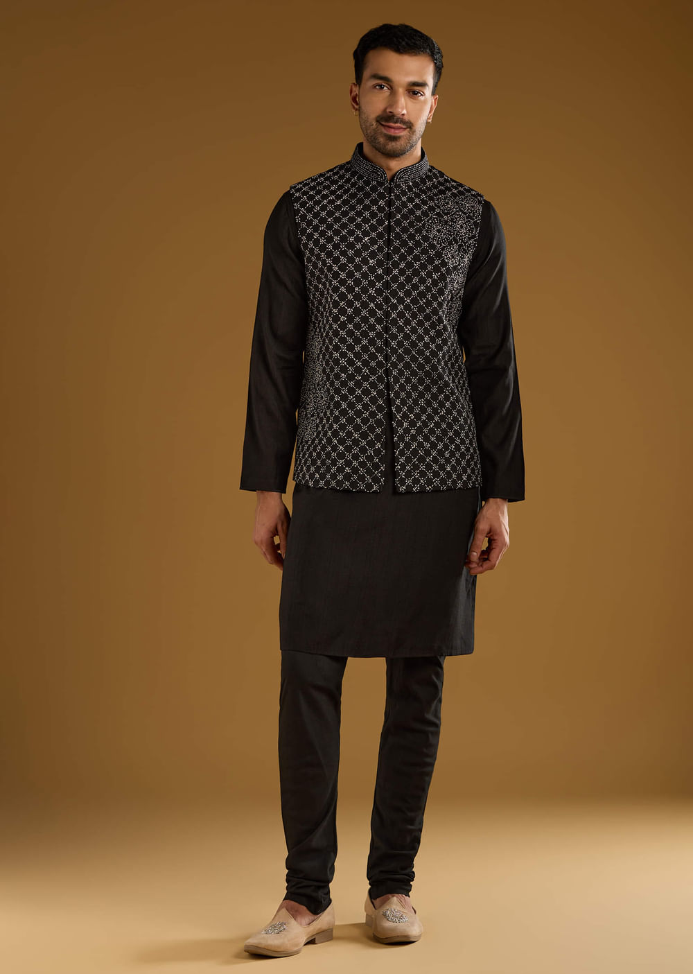 Evening lights suit this black men’s kurta jacket set in viscose, where thread work traces clean lines that sharpen the jacket profile. The dark base keeps the outline crisp on... More Product Details