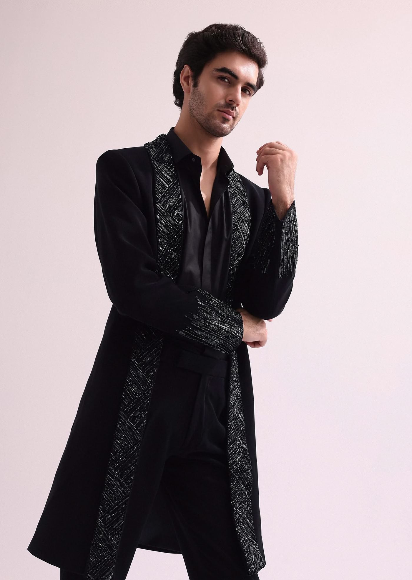 Tailored to perfection this stylishly designed threepiece jacket set adds a touch of opulence to your fusion wardrobe. Made using high qualiting suiting and linen satin fabric this black indowestern... More Product Details