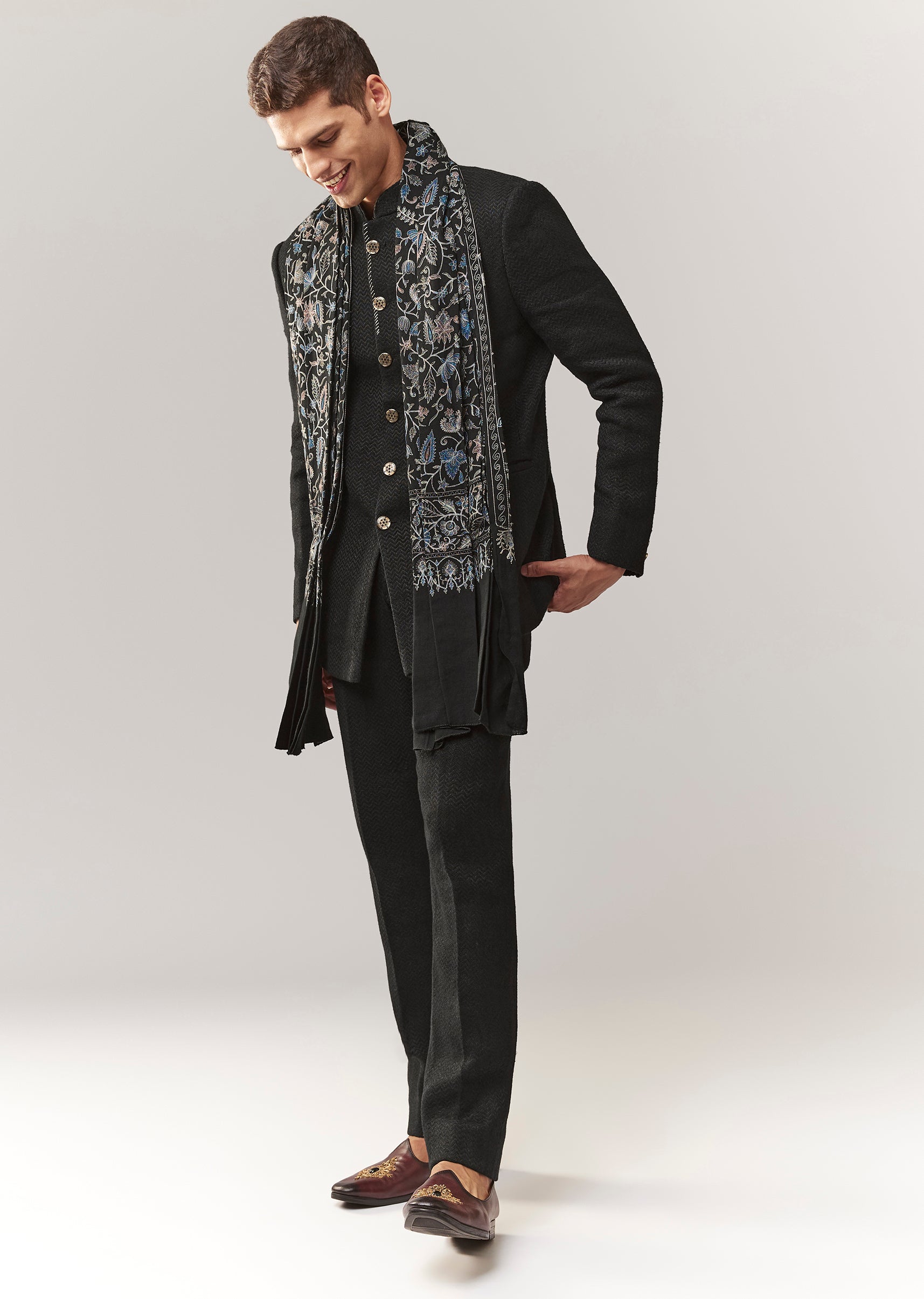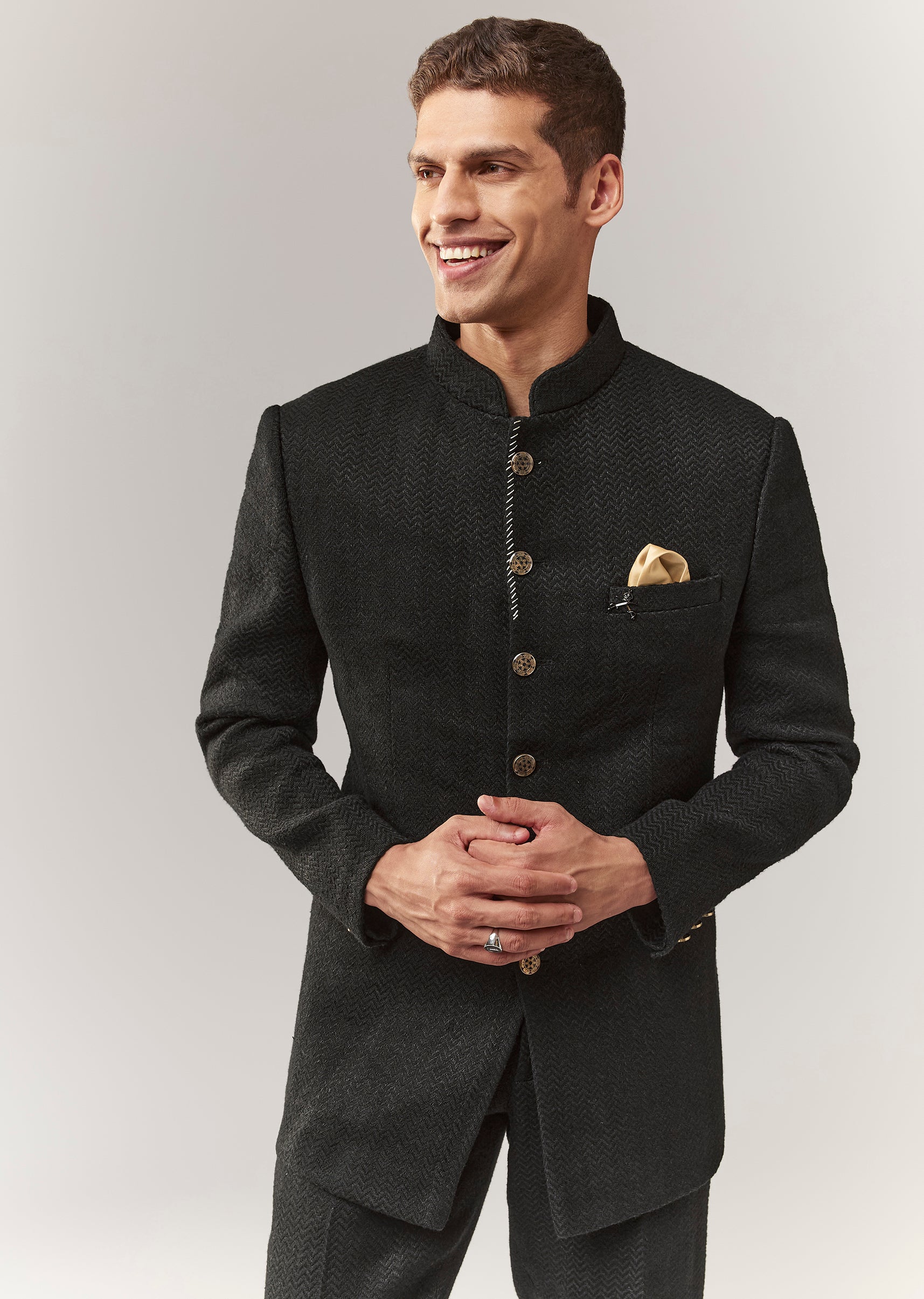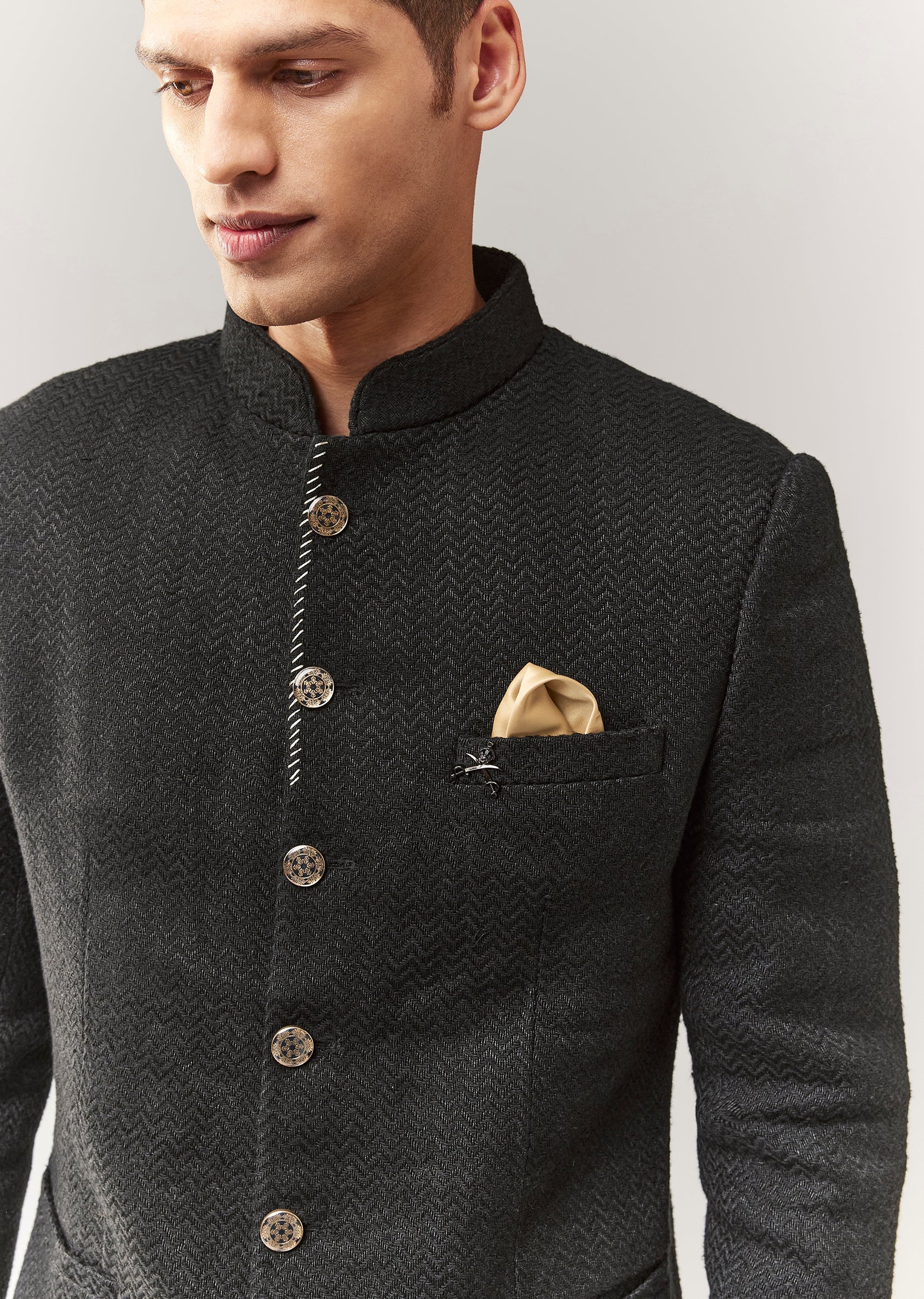 A classic black jodhpuri crafted in matka silk with a subtle self design. Mandarin collar and full sleeves give it a timeless ethnic-formal vibe, ideal for mehendi and reception looks. Paired with straight pants (mid-waist) for a clean silhouette. Awarded as the Most Trusted Brand, we're delivering styles you love, just as promised.