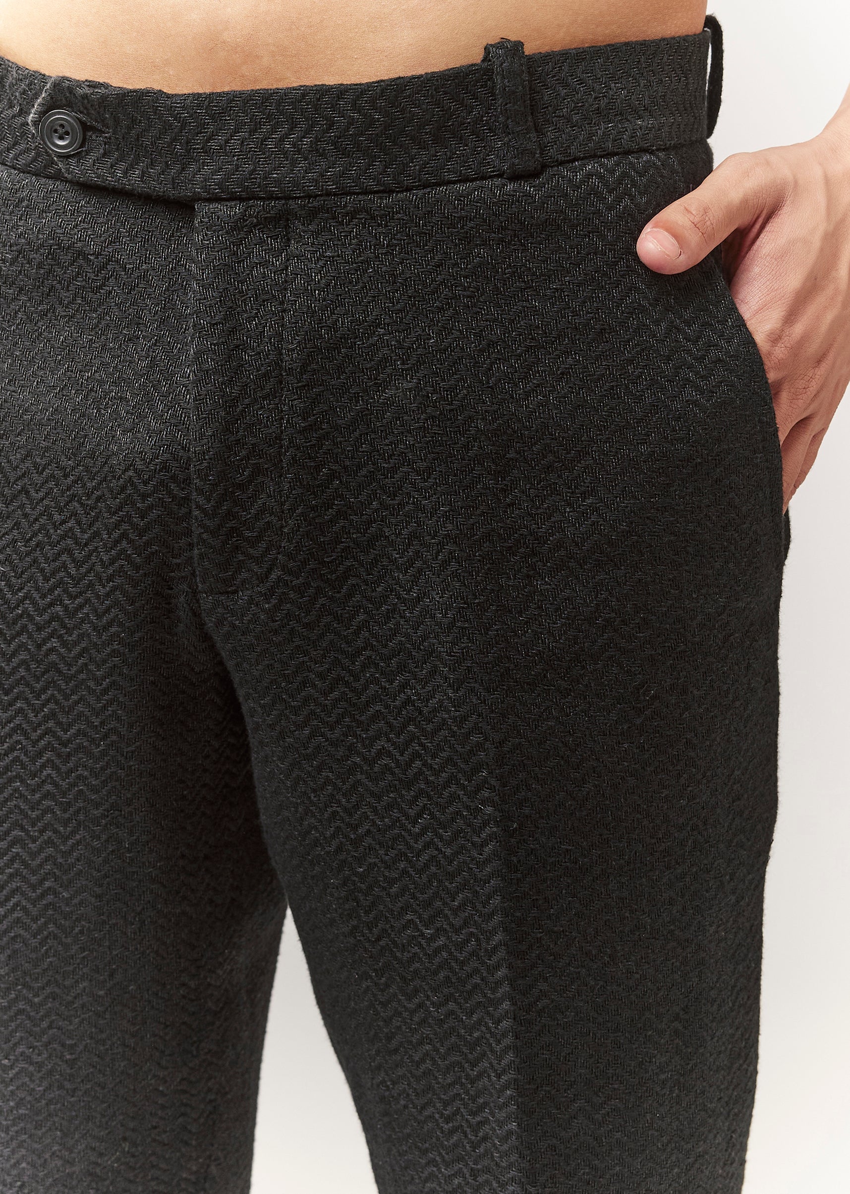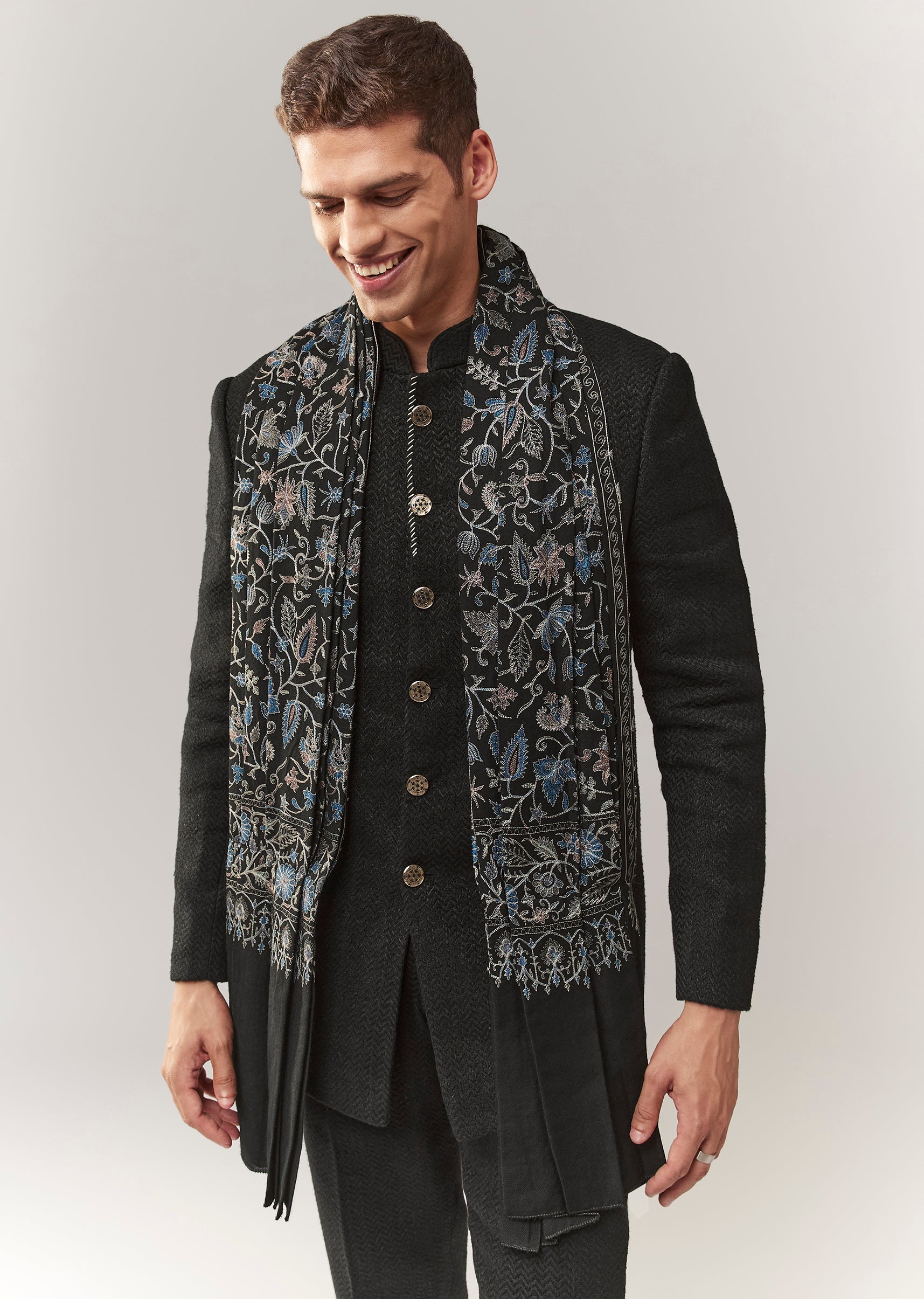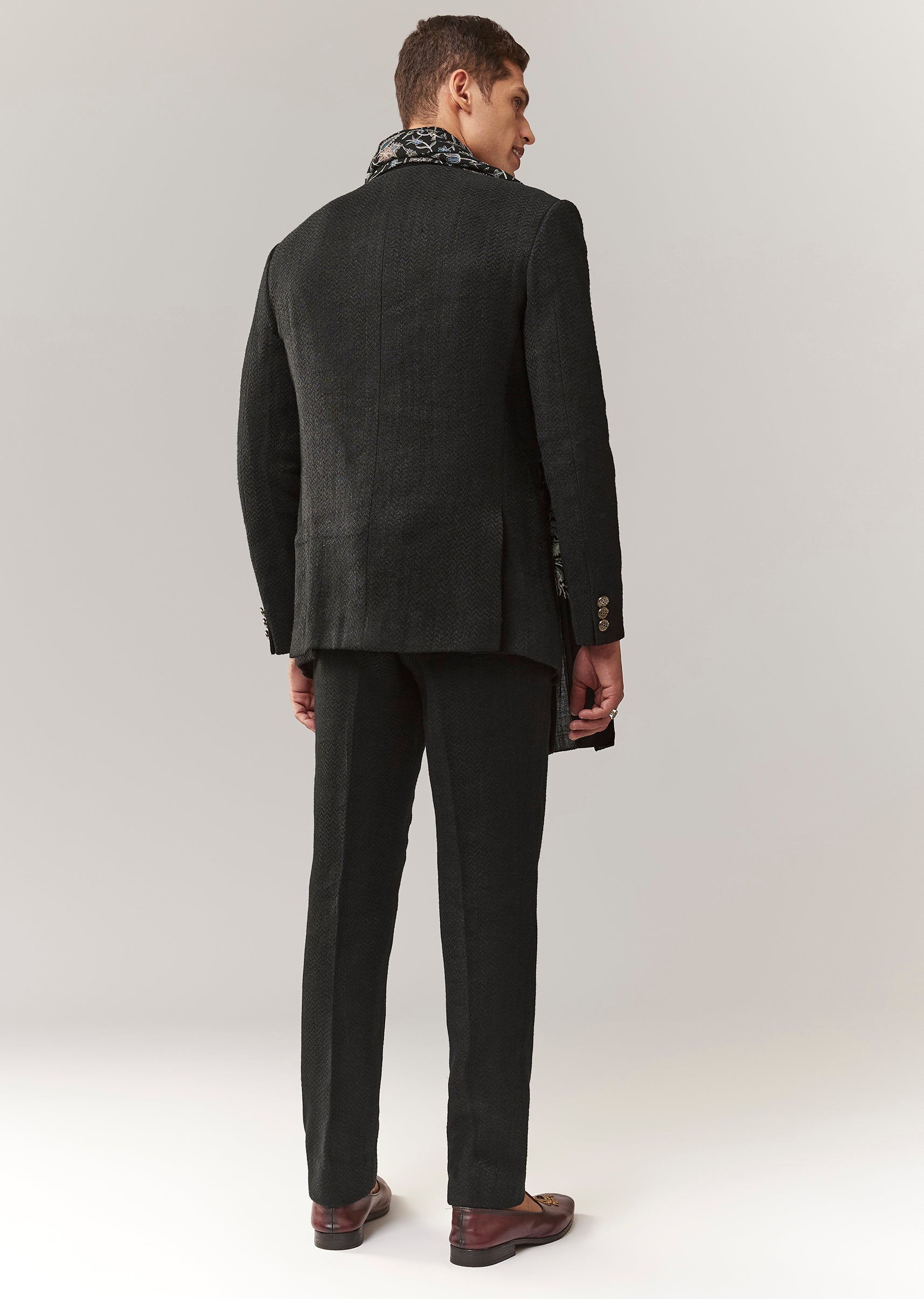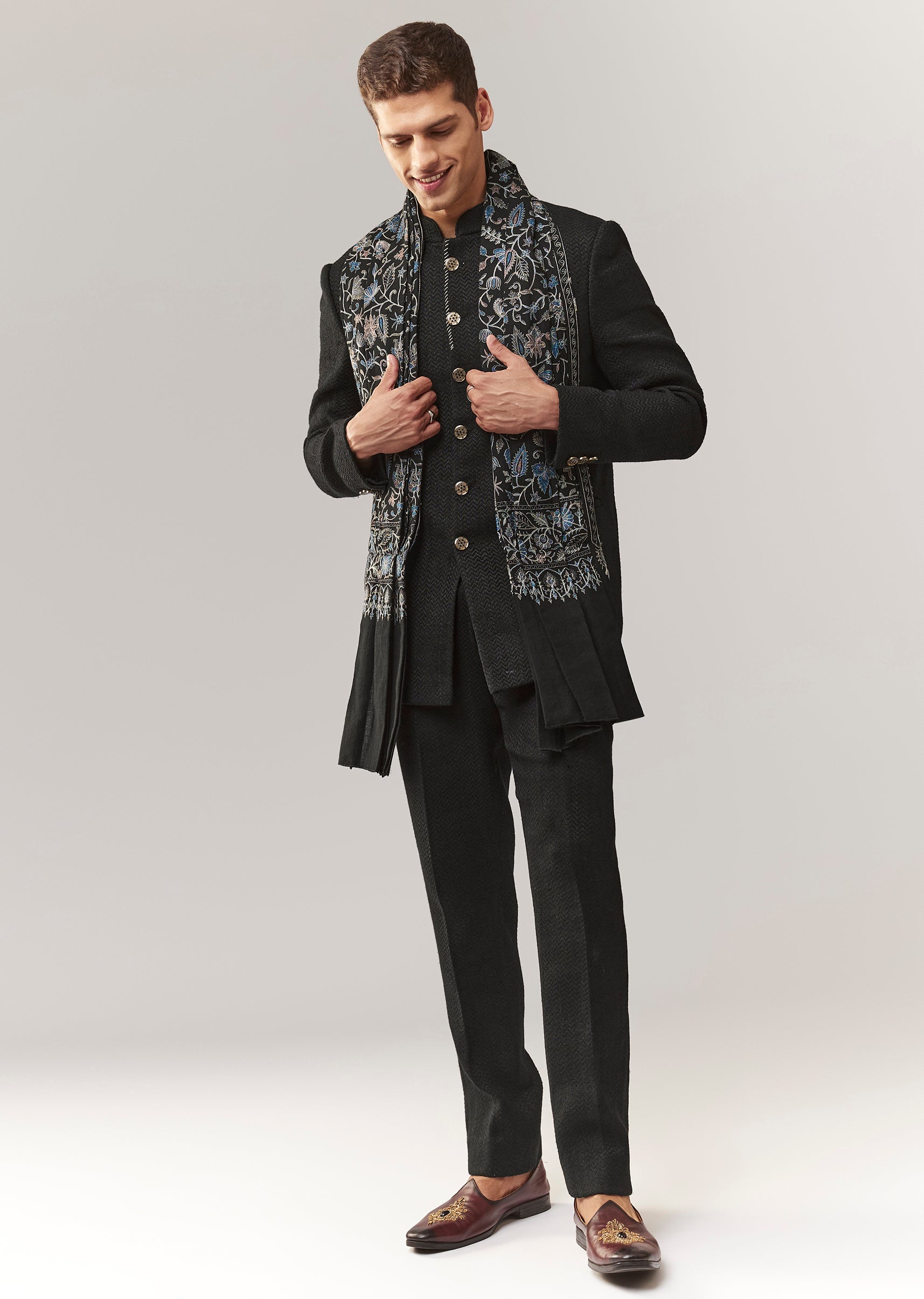 A classic black jodhpuri crafted in matka silk with a subtle self design. Mandarin collar and full sleeves give it a timeless ethnic-formal vibe, ideal for mehendi and reception looks. Paired with straight pants (mid-waist) for a clean silhouette. Awarded as the Most Trusted Brand, we're delivering styles you love, just as promised.