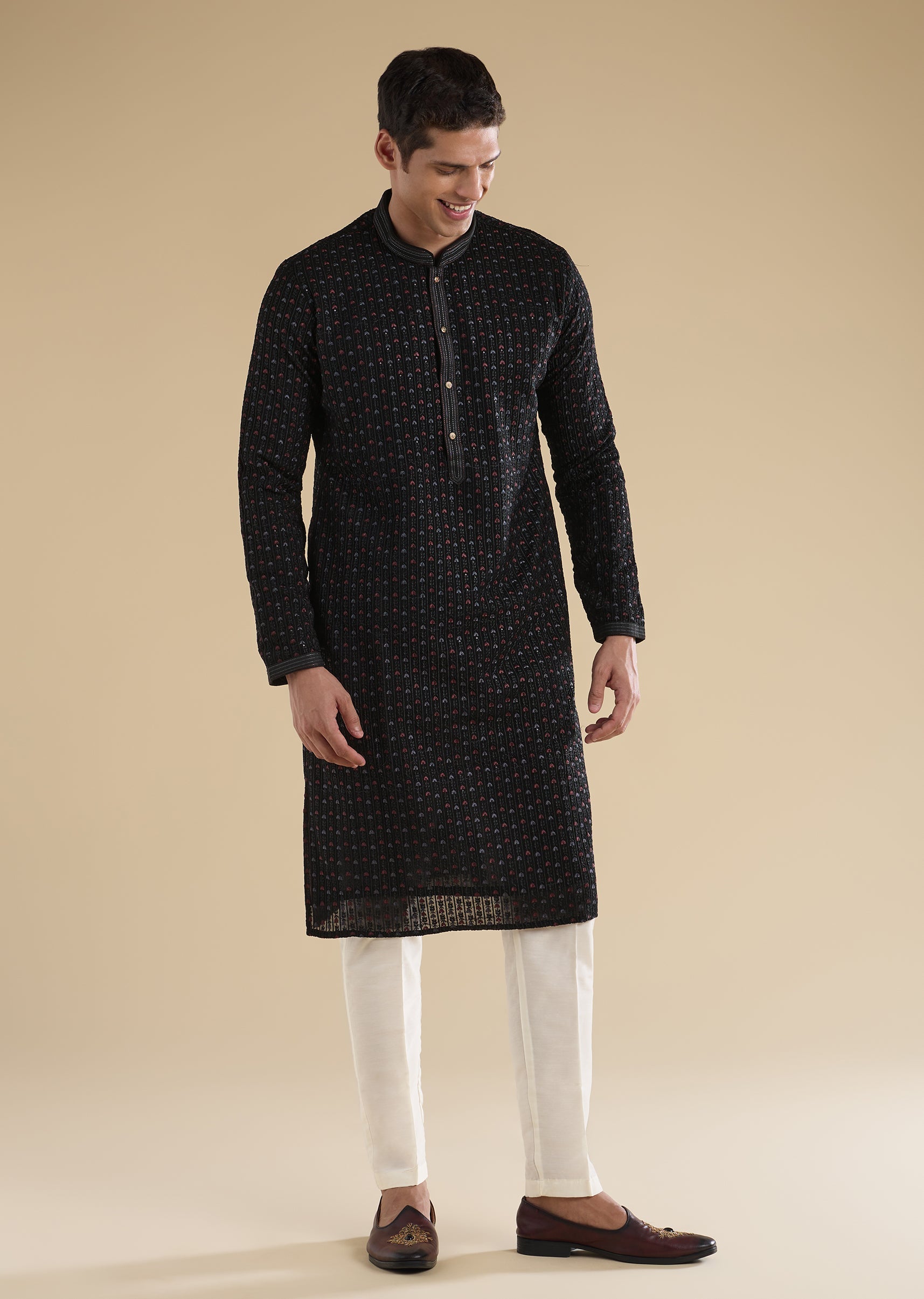 A versatile black art-silk kurta set with understated resham detailing for an elegant festive look. Designed with a mandarin collar, full sleeves, and front button closure, paired with straight mid-waist... More Product Details