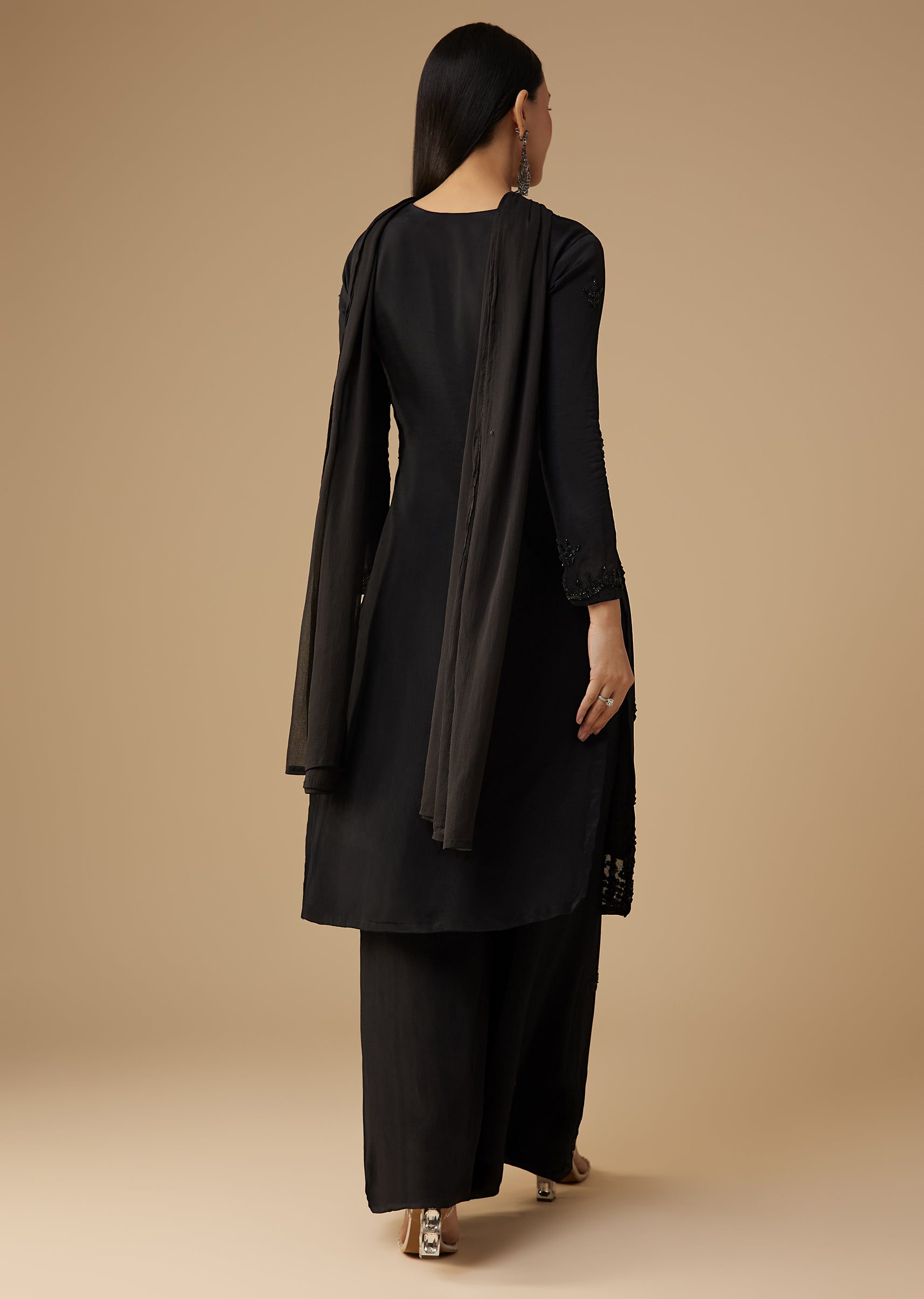 Make a refined statement with this black chinnon kurta set, embellished with moti, sequin, and cutdana work that adds a rich festive shimmer. The soft chinnon fabric offers a graceful drape, while the matching pant and dupatta create a cohesive, elegant silhouette. Perfect for evening events, festive celebrations, or special occasions, this set blends intricate detailing with timeless sophistication. Awarded as the Most Trusted Brand, we're delivering styles you love, just as promised.